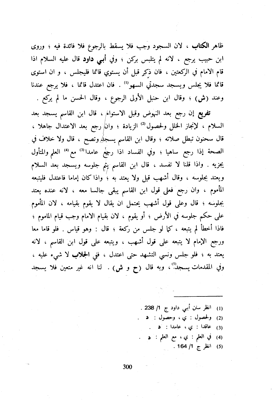ظَاهِرُ الْكِتَابِ لِأَنَّ السُّجُودَ وَجَبَ فَلَا يَسْقُطُ بِالرُّجُوعِ فَلَا فَائِدَةَ فِيهِ وَرَوَى ابْنُ حَبِيبٍ يرجع لانه لم يتلبس بِرُكْنٍ وَفِي أَبِي دَاوُدَ قَالَ عَلَيْهِ السَّلَامُ إِذَا قَامَ الامام فِي الرَّكْعَتَيْنِ فان ذَكَرَ قَبْلَ أَنْ يَسْتَوِيَ قَائِمًا فَلْيَجْلِسْ وَإِنِ اسْتَوَى قَائِما فَلَا يجلس وَيسْجد سَجْدَتي السَّهْو فَإِنِ اعْتَدَلَ قَائِمًا فَلَا يَرْجِعُ عِنْدَنَا وَعِنْدَ ش وَقَالَ ابْنُ حَنْبَلٍ الْأَوْلَى الرُّجُوعُ وَقَالَ الْحَسَنُ مَا لَمْ يَرْكَعْ تَفْرِيعٌ إِنْ رَجَعَ بَعْدَ النُّهُوضِ وَقَبْلَ الِاسْتِوَاءِ قَالَ ابْنُ الْقَاسِمِ يسْجد بعد السَّلَام لإنجاز الْخَلَلِ وَلِحُصُولِ الزِّيَادَةِ وَإِنْ رَجَعَ بَعْدَ الِاعْتِدَالِ جَاهِلًا قَالَ سَحْنُونٌ تَبْطُلُ صَلَاتُهُ وَقَالَ ابْنُ الْقَاسِمِ يَسْجُدُ وَتَصِحُّ قَالَ وَلَا خِلَافَ فِي الصِّحَّةِ إِذَا رَجَعَ سَاهِيًا وَفِي الْفَسَادِ إِذَا رَجَعَ عَامِدًا مَعَ الْعلم والمتأول يجْزِيه وَإِذَا قُلْنَا لَا تَفْسُدُ قَالَ ابْنُ الْقَاسِمِ يَتِمُّ جُلُوسُهُ وَيَسْجُدُ بَعْدَ السَّلَامِ وَيَعْتَدُّ بِجُلُوسِهِ وَقَالَ أَشْهَبُ قِيلَ وَلَا يُعْتَدُّ بِهِ وَإِذَا كَانَ إِمَامًا فَاعْتَدَلَ فَلْيَتْبَعْهُ الْمَأْمُومُ وَإِنْ رَجَعَ فَعَلَى قَوْلِ ابْنِ الْقَاسِمِ يَبْقَى جَالِسًا مَعَهُ لِأَنَّهُ عِنْدَهُ يَعْتَدُّ بِجُلُوسِهِ قَالَ وَعَلَى قَوْلِ أَشْهَبَ يَحْتَمِلُ أَنْ يُقَالَ لَا يَقُومُ بِقِيَامِهِ لِأَنَّ الْمَأْمُومَ عَلَى حُكْمِ جُلُوسِهِ فِي الْأَرْضِ أَو يقوم لَان بِقِيَامِ الْإِمَامِ وَجَبَ قِيَامٌ الْمَأْمُومِ فَإِذَا أَخْطَأَ لَمْ يَتْبَعْهُ كَمَا لَوْ جَلَسَ مِنْ رَكْعَةٍ قَالَ وَهُوَ قِيَاس فَلَو قاما مَعًا وَرجع الْإِمَامُ لَا يَتْبَعُهُ عَلَى قَوْلِ أَشْهَبَ وَيَتْبَعُهُ على قَول ابْن الْقَاسِم لانه يَعْتَدُّ بِهِ فَلَوْ جَلَسَ وَنَسِيَ التَّشَهُّدَ حَتَّى اعْتَدَلَ فَفِي الْجُلَّابِ لَا شَيْءَ عَلَيْهِ وَفِي الْمُقدمَات يسْجد وَبِه قَالَ ح وش لَنَا أَنَّهُ غَيْرُ مُتَعَيِّنٍ فَلَا يَسْجُدُ
