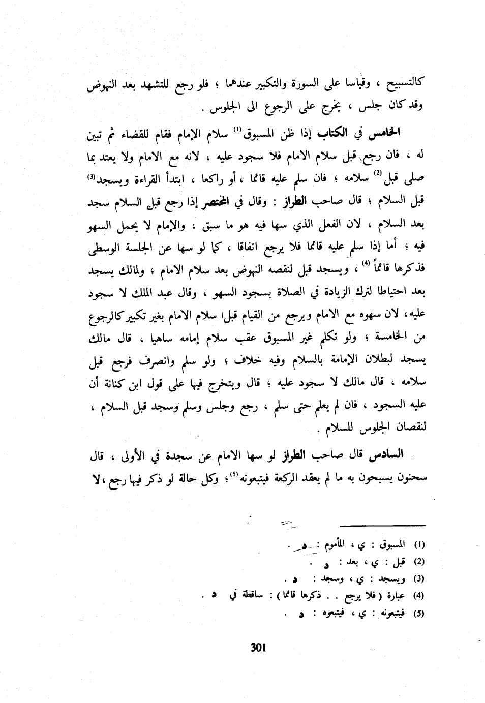 كَالتَّسْبِيحِ وَقِيَاسًا عَلَى السُّورَةِ وَالتَّكْبِيرِ عِنْدَهُمَا فَلَوْ رَجَعَ لِلتَّشَهُّدِ بَعْدَ النُّهُوضِ وَقَدْ كَانَ جَلَسَ يخرج على الرُّجُوع الى الْجُلُوس الْخَامِس فِي الْكتاب إِذا ظن الْمَسْبُوق سَلَامَ الْإِمَامِ فَقَامَ لِلْقَضَاءِ ثُمَّ تَبَيَّنَ لَهُ فَإِنْ رَجَعَ قَبْلَ سَلَامِ الْإِمَامِ فَلَا سُجُودَ عَلَيْهِ لِأَنَّهُ مَعَ الْإِمَامِ وَلَا يَعْتَدُّ بِمَا صلى قبل سَلَامِهِ فَإِنْ سَلَّمَ عَلَيْهِ قَائِمًا أَوْ رَاكِعًا ابْتَدَأَ الْقِرَاءَة وَيسْجد قَبْلَ السَّلَامِ قَالَ صَاحِبُ الطَّرَّازِ وَقَالَ فِي الْمُخْتَصَرِ إِذَا رَجَعَ قَبْلَ السَّلَامِ سَجَدَ بَعْدَ السَّلَامِ لِأَنَّ الْفِعْلَ الَّذِي سَهَا فِيهِ هُوَ مَا سَبَقَ وَالْإِمَامُ لَا يَحْمِلُ السَّهْوَ فِيهِ أَمَّا إِذَا سَلَّمَ عَلَيْهِ قَائِمًا فَلَا يَرْجِعُ اتِّفَاقًا كَمَا لَوْ سَهَا عَنِ الْجَلْسَةِ الْوُسْطَى فَذَكَرَهَا قَائِمًا وَيَسْجُدُ قَبْلُ لِنَقْصِهِ النُّهُوضَ بَعْدَ سَلَامِ الْإِمَامِ وَلِمَالِكٍ يَسْجُدُ بَعْدُ احْتِيَاطًا لِتَرْكِ الزِّيَادَةِ فِي الصَّلَاةِ بِسُجُودِ السَّهْوِ وَقَالَ عَبْدُ الْمَلِكِ لَا سُجُودَ عَلَيْهِ لِأَنَّ سَهْوَهُ مَعَ الْإِمَامِ وَيَرْجِعُ مِنَ الْقِيَامِ قَبْلَ سَلَامِ الْإِمَامِ بِغَيْرِ تَكْبِيرٍ كَالرُّجُوعِ مِنَ الْخَامِسَةِ وَلَوْ تَكَلَّمَ غَيْرُ الْمَسْبُوقِ عَقِبَ سَلَامِ إِمَامِهِ سَاهِيًا قَالَ مَالِكٌ يَسْجُدُ لِبُطْلَانِ الْإِمَامَةِ بِالسَّلَامِ وَفِيهِ خِلَافٌ وَلَوْ سَلَّمَ وَانْصَرَفَ فَرَجَعَ قَبْلَ سَلَامِهِ قَالَ مَالِكٌ لَا سُجُودَ عَلَيْهِ قَالَ وَيَتَخَرَّجُ فِيهَا عَلَى قَوْلِ ابْنِ كِنَانَةَ إِنَّ عَلَيْهِ السُّجُودَ فَإِنْ لَمْ يَعْلَمْ حَتَّى سَلَّمَ رَجَعَ وَجَلَسَ وَسَلَّمَ وَسَجَدَ قَبْلَ السَّلَامِ لِنُقْصَانِ الْجُلُوسِ لِلسَّلَامِ السَّادِسُ قَالَ صَاحِبُ الطَّرَّازِ لَوْ سَهَا الْإِمَامُ عَنْ سَجْدَةٍ فِي الْأُولَى قَالَ سَحْنُونٌ يُسَبِّحُونَ بِهِ مَا لَمْ يَعْقِدِ الرَّكْعَةَ فَيَتْبَعُونَهُ وَكُلُّ حَالَةٍ لَوْ ذُكِّرَ فِيهَا رَجَعَ لَا