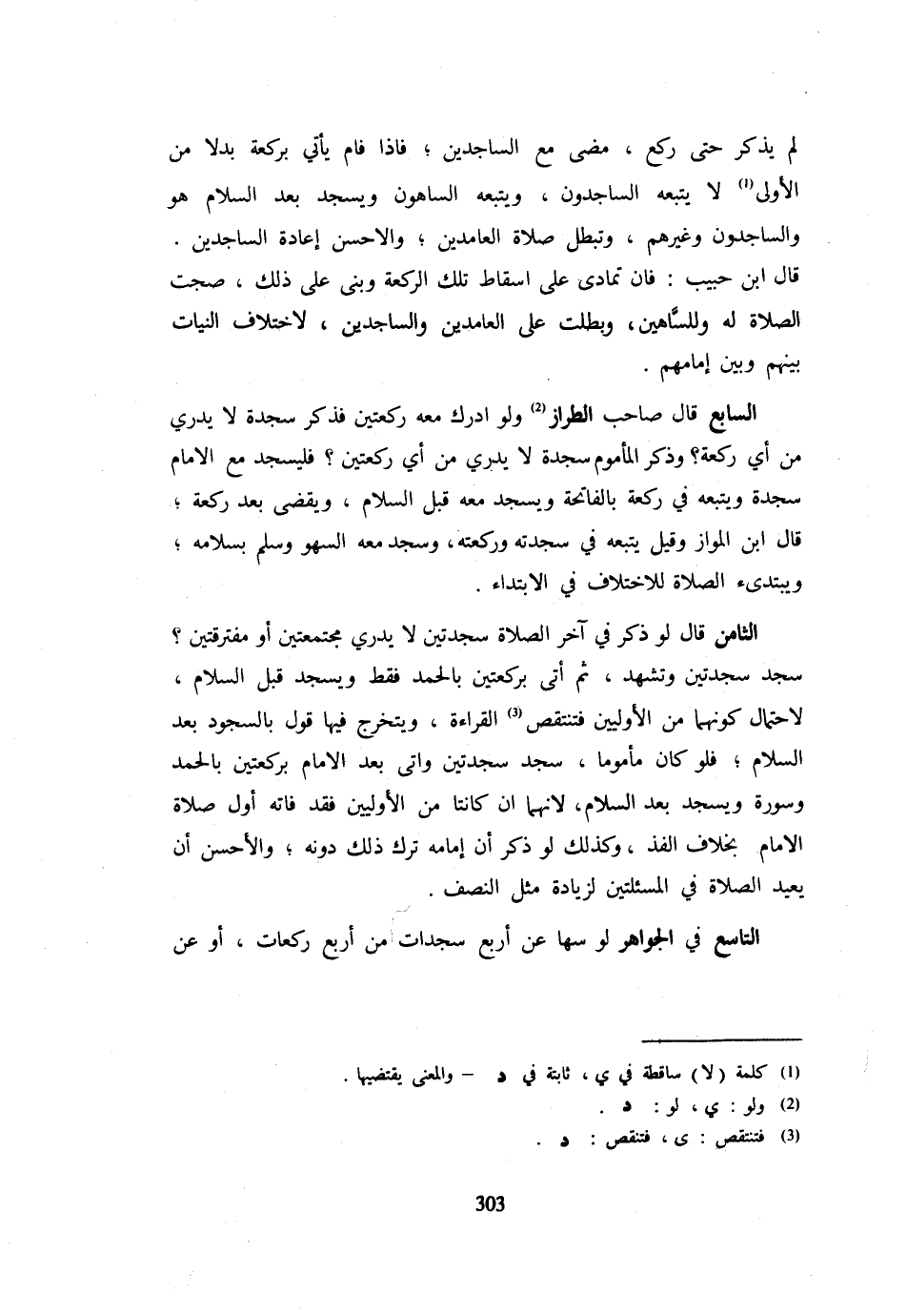 لَمْ يَذْكُرْ حَتَّى رَكَعَ مَضَى مَعَ السَّاجِدِينَ فَإِذَا قَامَ يَأْتِي بِرَكْعَةٍ بَدَلًا مِنَ الْأُولَى لَا يَتْبَعُهُ السَّاجِدُونَ وَيَتْبَعُهُ السَّاهُونَ وَيَسْجُدُ بَعْدَ السَّلَامِ هُوَ وَالسَّاجِدُونَ وَغَيْرُهُمْ وَتَبْطُلُ صَلَاةُ الْعَامِدِينَ وَالْأَحْسَنُ إِعَادَةُ السَّاجِدِينَ قَالَ ابْنُ حَبِيبٍ فَإِنْ تَمَادَى عَلَى إِسْقَاطِ تِلْكَ الرَّكْعَةِ وَبَنَى عَلَى ذَلِكَ صَحَّتِ الصَّلَاةُ لَهُ وَلِلسَّاهِينَ وَبَطَلَتْ عَلَى الْعَامِدِينَ وَالسَّاجِدِينَ لِاخْتِلَافِ النِّيَّاتِ بَيْنَهُمْ وَبَيْنَ إِمَامِهِمْ السَّابِع قَالَ صَاحب الطّراز وَلَو أَدْرَكَ مَعَهُ رَكْعَتَيْنِ فَذَكَرَ سَجْدَةً لَا يَدْرِي مِنْ أَيِّ رَكْعَةٍ؟ وَذَكَرَ الْمَأْمُومُ سَجْدَةً لَا يدْرِي من أَي رَكْعَتَيْنِ؟ فَلْيَسْجُدْ مَعَ الْإِمَامِ سَجْدَةً وَيَتْبَعُهُ فِي رَكْعَةٍ بِالْفَاتِحَةِ وَيَسْجُدُ مَعَهُ قَبْلَ السَّلَامِ وَيَقْضِي بَعْدُ رَكْعَةً قَالَ ابْنُ الْمَوَّازِ وَقِيلَ يَتْبَعُهُ فِي سجدته وركعته وَسجد مَعَه السَّهْو وَسلم بسلامه ويبتدئ الصَّلَاة للِاخْتِلَاف فِي الِابْتِدَاء الثَّامِنُ قَالَ لَوْ ذَكَرَ فِي آخِرِ الصَّلَاةِ سَجْدَتَيْنِ لَا يَدْرِي مُجْتَمِعَتَيْنِ أَوْ مُفْتَرِقَتَيْنِ؟ سَجَدَ سَجْدَتَيْنِ وَتشهد ثمَّ أَتَى بِرَكْعَتَيْنِ بِالْحَمْد فَقَطْ وَيَسْجُدُ قَبْلَ السَّلَامِ لِاحْتِمَالِ كَوْنِهِمَا مِنَ الْأُولَيَيْنِ فَتَنْتَقِصُ الْقِرَاءَةُ وَيَتَخَرَّجُ فِيهَا قَوْلٌ بِالسُّجُودِ بَعْدَ السَّلَامِ فَلَوْ كَانَ مَأْمُومًا سَجَدَ سَجْدَتَيْنِ واتى بعد الامام بِرَكْعَتَيْنِ بِالْحَمْد وَسُورَةٍ وَيَسْجُدُ بَعْدَ السَّلَامِ لِأَنَّهُمَا إِنْ كَانَتَا مِنَ الْأُولَيَيْنِ فَقَدْ فَاتَهُ أَوَّلُ صَلَاةِ الْإِمَامِ بِخِلَافِ الْفَذِّ وَكَذَلِكَ لَوْ ذَكَرَ أَنَّ إِمَامَهُ تَرَكَ ذَلِكَ دُونَهُ وَالْأَحْسَنُ أَنْ يُعِيدَ الصَّلَاةَ فِي المسئلتين لزِيَادَة مثل النّصْف التَّاسِعُ فِي الْجَوَاهِرِ لَوْ سَهَا عَنْ أَرْبَعِ سَجدَات من أَربع رَكْعَات أَو عَن