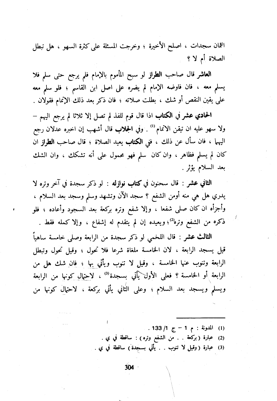 الثمان سَجدَات اصلح الْأَخِيرَة وَخرجت المسئلة عَلَى كَثْرَةِ السَّهْوِ هَلْ تَبْطُلُ الصَّلَاةُ أَمْ لَا؟ الْعَاشِرُ قَالَ صَاحِبُ الطَّرَّازِ لَوْ سَبَّحَ الْمَأْمُومُ بِالْإِمَامِ فَلَمْ يَرْجِعْ حَتَّى سَلَّمَ فَلَا يُسَلِّمْ مَعَهُ فَإِنْ فَاوَضَهُ الْإِمَامُ لَمْ يَضُرُّهُ عَلَى أَصْلِ ابْنِ الْقَاسِمِ فَلَوْ سَلَّمَ مَعَهُ عَلَى يَقِينِ النَّقْصِ أَوْ شَكٍّ بَطَلَتْ صَلَاتُهُ فَإِنْ ذَكَرَ بعد ذَلِك الْإِتْمَام فَقَوْلَانِ الْحَادِيَ عَشَرَ فِي الْكِتَابِ إِذَا قَالَ قَوْمٌ لِلْفَذِّ لَمْ تُصَلِّ إِلَّا ثَلَاثًا لَمْ يَرْجِعْ إِلَيْهِمْ وَلَا سَهْوَ عَلَيْهِ إَنْ تَيَقَّنَ الْإِتْمَامَ وَفِي الْجُلَّابِ قَالَ أَشْهَبُ إِنْ أَخْبَرَهُ عَدْلَانِ رَجَعَ إِلَيْهِمَا فَإِنْ سَأَلَ عَنْ ذَلِكَ فَفِي الْكِتَابِ يُعِيدُ الصَّلَاةَ قَالَ صَاحِبُ الطَّرَّازِ إِنْ كَانَ لَمْ يُسَلِّمْ فَظَاهِرٌ وَإِنْ كَانَ سَلَّمَ فَهُوَ مَحْمُولٌ عَلَى أَنَّهُ تَشَكَّكَ وَأَنَّ الشَّكَّ بعد السَّلَام يُؤثر الثَّانِيَ عَشَرَ قَالَ سَحْنُونٌ فِي كِتَابِ نَوَازِلِهِ لَوْ ذَكَرَ سَجْدَةً فِي آخِرِ وِتْرِهِ لَا يَدْرِي هَلْ هِيَ مِنْهُ أَوْ مِنَ الشَّفْعِ؟ سَجَدَ الْآنَ وَتَشَهَّدَ وَسَلَّمَ وَسَجَدَ بَعْدَ السَّلَامِ وَأَجْزَأَهُ إِنْ كَانَ صَلَّى شَفْعًا وَإِلَّا شَفَعَ وتره بِرَكْعَة بعد السُّجُود وَأَعَادَهُ فَلَو ذكره من الشفع وَتَرَهُ وَيُعِيدُهُ إِنْ لَمْ يَتَقَدَّمْ لَهُ إِشْفَاعٌ وَإِلَّا كمله فَقَط الثَّالِثَ عَشَرَ قَالَ اللَّخْمِيُّ لَوْ ذَكَرَ سَجْدَةً مِنَ الرَّابِعَةِ وَصَلَّى خَامِسَةً سَاهِيًا قِيلَ يَسْجُدُ الرَّابِعَة لَأَنَّ الْخَامِسَةَ مُلْغَاةٌ شَرْعًا فَلَا تَحُولُ وَقِيلَ تَحُولُ وَتَبْطُلُ الرَّابِعَةُ وَتَنُوبُ عَنْهَا الْخَامِسَةُ وَقِيلَ لَا تَنُوبُ وَيَأْتِي بِهَا فَإِنْ شَكَّ هَلْ من الرَّابِعَة أَو الْخَامِسَةِ؟ فَعَلَى الْأَوَّلِ يَأْتِي بِسَجْدَةٍ لِاحْتِمَالِ كَوْنِهَا مِنَ الرَّابِعَةِ وَيُسَلِّمُ وَيَسْجُدُ بَعْدَ السَّلَامِ وَعَلَى الثَّانِي يَأْتِي بِرَكْعَة لاحْتِمَال كَونهَا من
