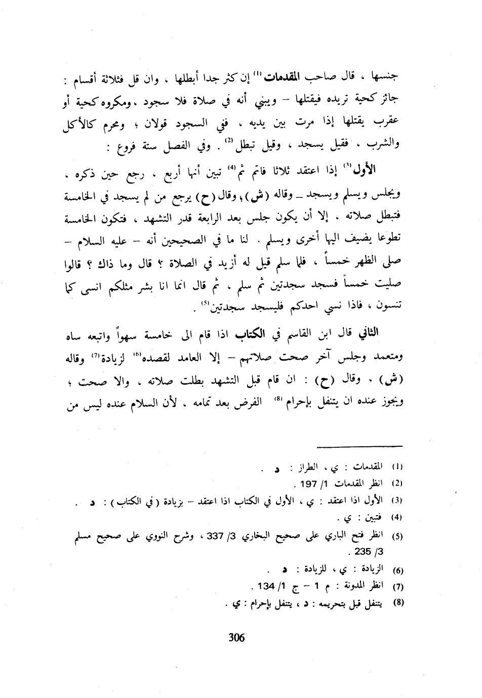 جِنْسِهَا قَالَ صَاحِبُ الْمُقَدِّمَاتِ إِنْ كَثُرَ جِدًّا أَبْطَلَهَا وَإِنْ قَلَّ فَثَلَاثَةُ أَقْسَامٍ جَائِزٌ كَحَيَّةٍ تريده فيقتلها وَيَبْنِي أَنه فِي صَلَاة فَلَا سُجُودَ وَمَكْرُوهٌ كَحَيَّةٍ أَوْ عَقْرَبٍ يَقْتُلُهَا إِذَا مَرَّتْ بَيْنَ يَدَيْهِ فَفِي السُّجُودِ قَوْلَانِ وَمُحَرَّمٌ كَالْأَكْلِ وَالشُّرْبِ فَقِيلَ يَسْجُدُ وَقِيلَ تَبْطُلُ وَفِي الْفَصْل سِتَّة فروع الأول إِذَا اعْتَقَدَ ثَلَاثًا فَأَتَمَّ ثُمَّ تَبَيَّنَ أَنَّهَا أَرْبَعٌ رَجَعَ حِينَ ذَكَرَهُ وَيَجْلِسُ وَيُسَلِّمُ وَيَسْجُدُ وَقَالَهُ ش وَقَالَ ح يرجع من لَمْ يَسْجُدْ فِي الْخَامِسَةِ فَتَبْطُلُ صَلَاتُهُ إِلَّا أَنْ يَكُونَ جَلَسَ بَعْدَ الرَّابِعَةِ قَدْرَ التَّشَهُّدِ فَتَكُونُ الْخَامِسَةُ تَطَوُّعًا يُضِيفُ إِلَيْهَا أُخْرَى وَيُسَلِّمُ لَنَا مَا فِي الصَّحِيحَيْنِ أَنَّهُ عَلَيْهِ السَّلَامُ صَلَّى الظُّهْرَ خَمْسًا فَلَمَّا سَلَّمَ قِيلَ لَهُ أَزِيدَ فِي الصَّلَاةِ؟ قَالَ وَمَا ذَاكَ؟ قَالُوا صَلَّيْتَ خَمْسًا فَسَجَدَ سَجْدَتَيْنِ ثُمَّ سَلَّمَ ثُمَّ قَالَ إِنَّمَا أَنَا بَشَرٌ مِثْلُكُمْ أَنْسَى كَمَا تنسون فاذا نسي أحدكُم فليسجد سَجْدَتَيْنِ الثَّانِي قَالَ ابْنُ الْقَاسِمِ فِي الْكِتَابِ إِذَا قَامَ إِلَى خَامِسَةٍ سَهْوًا وَاتَّبَعَهُ سَاهٍ وَمُتَعَمِّدٌ وَجلسَ آخر صحت صلَاتهم إِلَّا الْعَامِد لقصده لزِيَادَة وَقَالَهُ ش وَقَالَ ح إِنْ قَامَ قَبْلَ التَّشَهُّدِ بَطَلَتَ صَلَاتُهُ وَإِلَّا صَحَّتْ وَيَجُوزُ عِنْدَهُ ان يتَنَفَّل بِإِحْرَام الْفَرْضَ بَعْدَ تَمَامِهِ لِأَنَّ السَّلَامَ عِنْدَهُ لَيْسَ من