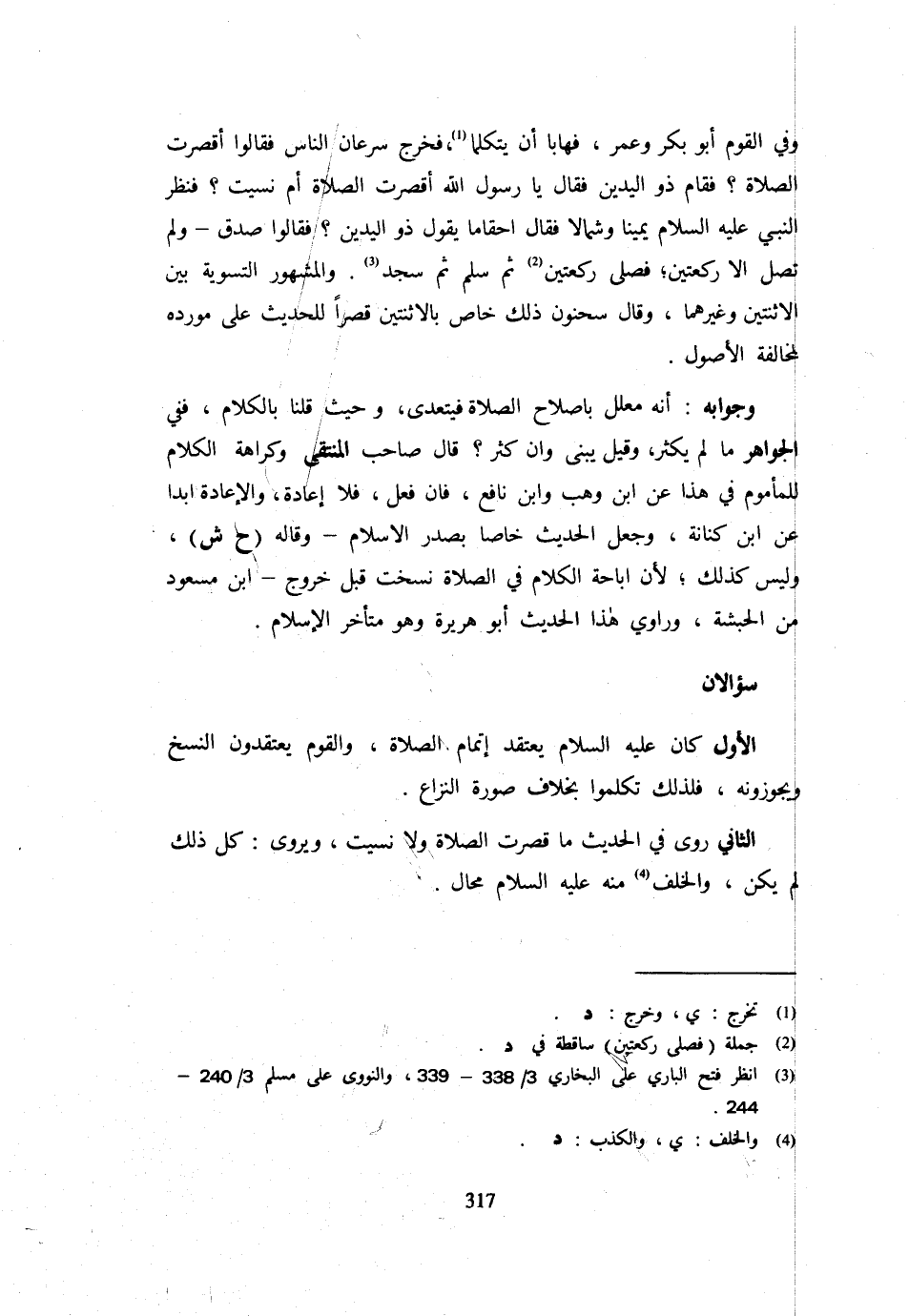 سُؤَالَانِ الْأَوَّلُ كَانَ عَلَيْهِ السَّلَامُ يَعْتَقِدُ إِتْمَامَ الصَّلَاةِ وَالْقَوْمُ يَعْتَقِدُونَ النَّسْخَ وَيُجَوِّزُونَهُ فَلِذَلِكَ تَكَلَّمُوا بِخِلَافِ صُورَةِ النِّزَاعِ الثَّانِي رُوِيَ فِي الْحَدِيثِ مَا قُصِرَتِ الصَّلَاةُ وَلَا نَسِيتُ وَيُرْوَى كُلُّ ذَلِكَ لَمْ يَكُنْ وَالْخُلْفُ مِنْهُ عَلَيْهِ السَّلَامُ محَال