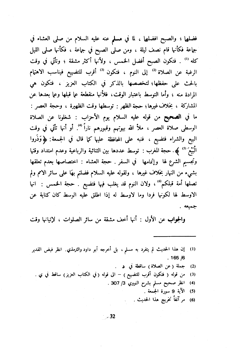 مَنْ صَلَّى الْعِشَاءَ فِي جَمَاعَةٍ فَكَأَنَّهَا قَامَ نصف لَيْلَة وَمن صلى الصُّبْح فِي جمَاعَة فَكَأَنَّهَا صلى اللَّيْل كُله فَتكون الصُّبْح أفضل الْخمس وَلِأَنَّهَا أَكثر مشقة وَتَأْتِي فِي وَقت الرَّغْبَةِ عَنِ الصَّلَاةِ إِلَى النَّوْمِ فَتَكُونُ أَقْرَبَ للتضييع فيناسب الاهتمام بالحث على حفظهَا لتخصصها بِالذِّكْرِ فِي الْكِتَابِ الْعَزِيزِ فَتَكُونُ هِيَ الْمُرَادَةُ مِنْهُ وَأَمَّا التَّوَسُّطُ بِاعْتِبَارِ الْوَقْتِ فَلِأَنَّهَا مُنْقَطِعَةٌ عَمَّا قَبْلَهَا وَعَمَّا بَعْدَهَا عَنِ الْمُشَارَكَةِ بِخِلَافِ غَيْرِهَا حُجَّةُ الظُّهْرِ تَوَسُّطُهَا وَقْتَ الظَّهِيرَةِ وَحُجَّةُ الْعَصْرِ مَا فِي الصَّحِيحِ مِنْ قَوْلِهِ عَلَيْهِ السَّلَام يَوْمَ الْأَحْزَابِ شَغَلُونَا عَنِ الصَّلَاةِ الْوُسْطَى صَلَاةِ الْعَصْرِ مَلَأَ اللَّهُ بُيُوتَهُمْ وَقُبُورَهُمْ نَارًا أَوْ أَنَّهَا تَأْتِي فِي وَقْتِ الْبَيْعِ وَالشِّرَاءِ فَتَضِيعُ فنبه على الْمُحَافظَة عَلَيْهَا كَمَا قَالَ فِي الْجُمُعَةِ {وَذَرُوا الْبَيْعَ} حُجَّةُ الْمَغْرِبِ تَوَسُّطُ عَدَدِهَا بَيْنَ الثُّنَائِيَّةِ وَالرُّبَاعِيَّةِ وَعدم امتداد وَقتهَا وتجسيم الشَّرْعِ لَهَا وَإِتْمَامُهَا فِي السَّفَرِ حُجَّةُ الْعِشَاءِ اخْتِصَاصُهَا بِعَدَمِ تَعَلُّقِهَا بِشَيْءٍ مِنَ النَّهَارِ بِخِلَافِ غَيْرِهَا وَلِقَوْلِهِ عَلَيْهِ السَّلَامُ فُضِّلْتُمْ بِهَا عَلَى سَائِرِ الْأُمَمِ وَلَمْ تُصَلِّهَا أُمَّةٌ قَبْلَكُمْ وَلِأَنَّ النَّوْمَ قَدْ يَغْلِبُ فِيهَا فَتُضَيَّعُ حُجَّةُ الْخَمْسِ أَنَّهَا الْأَوْسَط لَهَا لكَونهَا فَردا وَمَا لأوسط لَهُ إِذَا أُطْلِقَ عَلَيْهِ الْوَسَطُ كَانَ كِنَايَةً عَنْ جَمِيعِهِ وَالْجَوَابُ عَنِ الْأَوَّلِ أَنَّهَا أَخَفُّ مَشَقَّةً مِنْ سَائِرِ الصَّلَوَاتِ لِإِتْيَانِهَا وَقْتَ