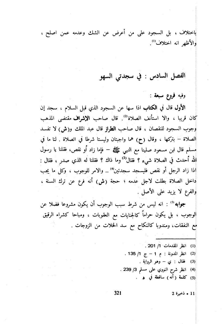 وَفِيهِ فُرُوعٌ سَبْعَة الْأَوَّلُ قَالَ فِي الْكِتَابِ إِذَا سَهَا عَنِ السُّجُودِ الَّذِي قَبْلَ السَّلَامِ سَجَدَ إِنْ كَانَ قَرِيبًا وَإِلَّا اسْتَأْنَفَ الصَّلَاةَ قَالَ صَاحِبُ الْإِشْرَافِ مُقْتَضَى الْمَذْهَبِ وَجُوبُ السُّجُودِ لِلنُّقْصَانِ قَالَ صَاحِبُ الطَّرَّازِ قَالَ عَبْدُ الْمَلِكِ وَ (ش) لَا تَفْسُدُ الصَّلَاةُ بِتَرْكِهَا وَقَالَ (ح) هُمَا وَاجِبَتَانِ وَلَيْسَتَا شَرْطًا فِي الصَّلَاةِ لَنَا مَا فِي مُسْلِمٍ قَالَ ابْنُ مَسْعُودٍ صَلَّيْنَا مَعَ النَّبِيِّ - صَلَّى اللَّهُ عَلَيْهِ وَسَلَّم َ - فَإِمَّا زَادَ أَوْ نَقَصَ فَقُلْنَا يَا رَسُولَ اللَّهِ أَحَدَثَ فِي الصَّلَاةِ شَيْءٌ فَقَالَ وَمَا ذَاك فَقُلْنَا لَهُ الَّذِي صدر فَقَالَ إِذَا زَادَ الرَّجُلُ أَوْ نَقَصَ فَلْيَسْجُدْ سَجْدَتَيْنِ وَالْأَمْرُ لِلْوُجُوبِ وَكُلُّ مَا يَجِبُ دَاخِلَ الصَّلَاةِ بَطَلَتْ لِأَجْلِ عَدَمِهِ حُجَّةُ (ش) أَنَّهُ فَرْعٌ عَنْ تَرْكِ السُّنَّةِ وَالْفَرْعُ لَا يَزِيدُ عَلَى الْأَصْلِ جَوَابُهُ أَنَّهُ لَيْسَ مِنْ شَرْطِ سَبَبِ الْوُجُوبِ أَنْ يَكُونَ مَشْرُوعًا فَضْلًا عَنِ الْوُجُوب بل يَكُونُ حَرَامًا كَالْجِنَايَاتِ مَعَ الْعُقُوبَاتِ وَمُبَاحًا كَشِرَاءِ الرَّقِيقِ مَعَ النَّفَقَاتِ وَمَنْدُوبًا كَالنِّكَاحِ مَعَ سَدِّ الْخُلَّاتِ مِنَ الزَّوْجَاتِ