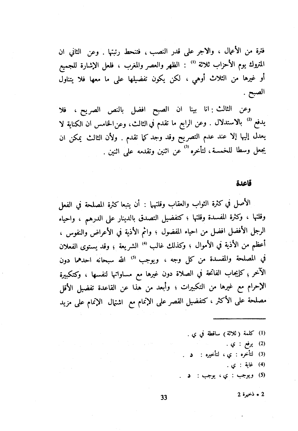قَاعِدَةٌ الْأَصْلُ فِي كَثْرَةِ الثَّوَابِ وَالْعِقَابِ وَقِلَّتِهِمَا أَنْ يَتْبَعَا كَثْرَةَ الْمَصْلَحَةِ فِي الْفِعْلِ وَقِلَّتَهَا وَكَثْرَةَ الْمَفْسَدَةِ وَقِلَّتَهَا كَتَفْضِيلِ التَّصَدُّقِ بِالدِّينَارِ عَلَى الدِّرْهَمِ وَإِحْيَاءُ الرَّجُلِ الْأَفْضَلِ أَفْضَلُ مِنْ إِحْيَاءِ الْمَفْضُولِ وَإِثْمُ الْأَذِيَّةِ فِي الْأَعْرَاضِ وَالنُّفُوسِ أَعْظَمُ مِنَ الْأَذِيَّةِ فِي الْأَمْوَالِ وَكَذَلِكَ غَالِبُ الشَّرِيعَةِ وَقَدْ يَسْتَوِي الْفِعْلَانِ فِي الْمَصْلَحَةِ وَالْمَفْسَدَةِ مِنْ كُلِّ وَجه وَيُوجب الله سُبْحَانَهُ أَحَدَهُمَا دُونَ الْآخَرِ كَإِيجَابِ الْفَاتِحَةِ فِي الصَّلَاةِ دُونَ غَيْرِهَا مَعَ مُسَاوَاتِهَا لِنَفْسِهَا وَكَتَكْبِيرَةِ الْإِحْرَامِ مَعَ غَيْرِهَا مِنَ التَّكْبِيرَاتِ وَأَبْعَدُ مِنْ هَذَا عَنِ الْقَاعِدَةِ تَفْضِيلُ الْأَقَلِّ مَصْلَحَةً عَلَى الْأَكْثَرِ كَتَفْضِيلِ الْقَصْرِ عَلَى الْإِتْمَامِ مَعَ اشْتِمَالِ الْإِتْمَامِ على مزِيد