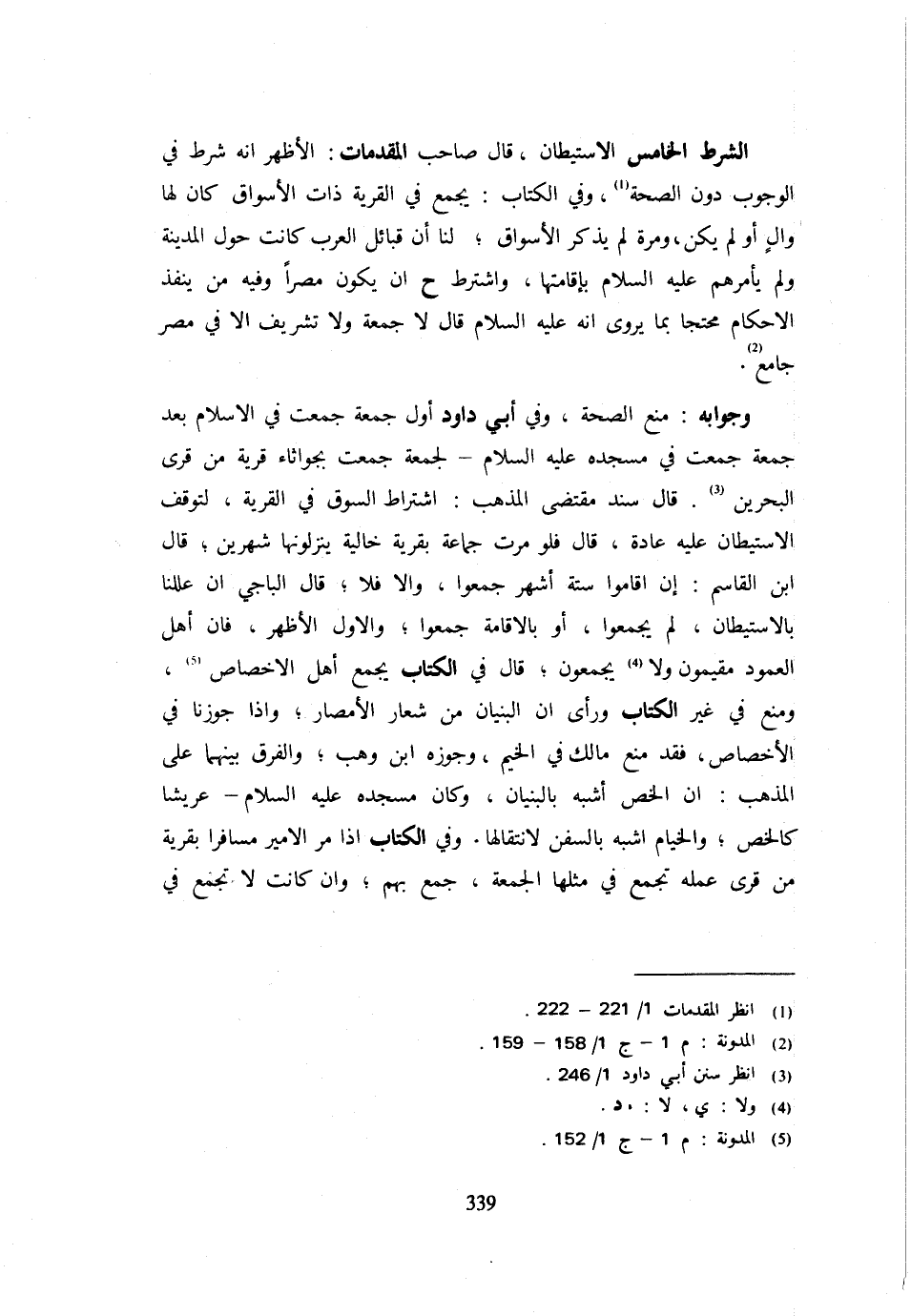 الشَّرْطُ الْخَامِسُ الِاسْتِيطَانُ قَالَ صَاحِبُ الْمُقَدِّمَاتِ الْأَظْهَرُ أَنَّهُ شَرْطٌ فِي الْوُجُوبِ دُونَ الصِّحَّةِ وَفِي الْكِتَابِ يُجْمَعُ فِي الْقَرْيَةِ ذَاتِ الْأَسْوَاقِ كَانَ لَهَا وَالٍ أَوْ لَمْ يَكُنْ وَمَرَّةً لَمْ يَذْكُرِ الْأَسْوَاقَ لَنَا أَنَّ قَبَائِلَ الْعَرَبِ كَانَتْ حَوْلَ الْمَدِينَةِ وَلَمْ يَأْمُرْهُمْ عَلَيْهِ السَّلَامُ بِإِقَامَتِهَا وَاشْتَرَطَ ح أَنْ يَكُونَ مِصْرًا وَفِيهِ مَنْ يُنَفِّذُ الْأَحْكَامَ مُحْتَجًّا بِمَا يُرْوَى أَنَّهُ عَلَيْهِ السَّلَام قَالَ لَا جُمُعَة وَلَا تشريف إِلَّا فِي مِصْرٍ جَامِعٍ وَجَوَابُهُ مَنْعُ الصِّحَّةِ وَفِي أَبِي دَاوُدَ أَوَّلُ جُمُعَةٍ جُمِعَتْ فِي الْإِسْلَامِ بَعْدَ جُمُعَةٍ جُمِعَتْ فِي مَسْجِدِهِ عَلَيْهِ السَّلَام لجمعة جُمِعَتْ بِجُوَاثَاءَ قَرْيَةٍ مِنْ قُرَى الْبَحْرَيْنِ قَالَ سَنَدٌ مُقْتَضَى الْمَذْهَبِ اشْتِرَاطُ السُّوقِ فِي الْقَرْيَةِ لِتَوَقُّفِ الِاسْتِيطَانِ عَلَيْهِ عَادَةً قَالَ فَلَوْ مَرَّتْ جَمَاعَةٌ بَقَرْيَةٍ خَالِيَةٍ يَنْزِلُونَهَا شَهْرَيْنِ قَالَ ابْنُ الْقَاسِمِ إِنْ أَقَامُوا سِتَّةَ أَشْهُرٍ جَمَعُوا وَإِلَّا فَلَا قَالَ الْبَاجِيُّ إِنْ عَلَّلْنَا بِالِاسْتِيطَانِ لَمْ يجمعوا أَو بالاقامة جمعُوا وَالْأول الْأَظْهر فان أهل العمود مقيمون وَلَا يَجْمَعُونَ قَالَ فِي الْكِتَابِ يَجْمَعُ أَهْلُ الْأَخْصَاصِ وَمَنَعَ فِي غَيْرِ الْكِتَابِ وَرَأَى أَنَّ الْبُنْيَانَ مِنْ شِعَارِ الْأَمْصَارِ وَإِذَا جَوَّزْنَا فِي الْأَخْصَاصِ فَقَدْ مَنَعَ مَالِكٌ فِي الْخِيَمِ وَجَوَّزَهُ ابْنُ وَهْبٍ وَالْفَرْقُ بَيْنَهُمَا عَلَى الْمَذْهَبِ أَنَّ الْخُصَّ أَشْبَهُ بِالْبُنْيَانِ وَكَانَ مَسْجِدُهُ عَلَيْهِ السَّلَامُ عَرِيشًا كَالْخُصِّ وَالْخِيَامُ أَشْبَهُ بِالسُّفُنِ لِانْتِقَالِهَا وَفِي الْكِتَابِ إِذَا مَرَّ الْأَمِيرُ مُسَافِرًا بِقَرْيَةٍ مِنْ قُرَى عَمَلِهِ تُجْمَعُ فِي مِثْلِهَا الْجُمُعَةُ جَمَعَ بِهِمْ وَإِنْ كَانَتْ لَا تُجْمَعُ فِي