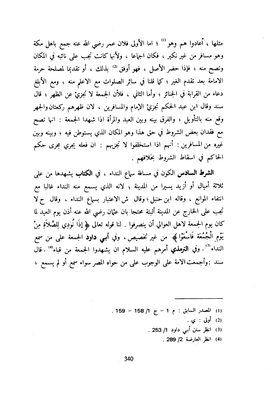 مثلهَا أعادوا هم وَهُوَ اما الأولى فَلِأَنَّ عُمَرَ رَضِيَ اللَّهُ عَنْهُ جَمَعَ بِأَهْلِ مَكَّةَ وَهُوَ مُسَافِرٌ مِنْ غَيْرِ نَكِيرٍ فَكَانَ إِجْمَاعًا وَلِأَنَّهَا كَانَتْ تَجِبُ عَلَى نَائِبِهِ فِي الْمَكَانِ وَتَصِحُّ مِنْهُ فَإِذَا حَضَرَ الْأَصْلُ فَهُوَ أوفق بِذَلِكَ أَوْ تَقْدِيمًا لِمَصْلَحَةِ حُرْمَةِ الْإِمَامَةِ بَعْدَ تقدم الْغَيْرِ كَمَا قُلْنَا فِي سَائِرِ الصَّلَوَاتِ مَعَ الْأَعْلَمِ مِنْهُ وَمَعَ الْأَبْلَغِ دُعَاءً مِنَ الْقَرَابَةِ فِي الْجَنَائِز وَأَمَّا الثَّانِي فَلِأَنَّ الْجُمُعَةَ لَا تُجْزِئُ عَنِ الظُّهْرِ قَالَ سَنَدٌ وَقَالَ ابْنُ عَبْدِ الْحَكَمِ تجزيء الإِمَام والمسافرين لَان ظهْرهمْ رَكْعَتَانِ والجهر وَقع مِنْهُ بِالتَّأْوِيلِ وَالْفَرْقُ بَيْنَهُ وَبَيْنَ الْعَبْدِ وَالْمَرْأَةِ إِذَا شَهِدَا الْجُمُعَةَ أَنَّهَا تَصِحُّ مَعَ فِقْدَانِ بَعْضِ الشُّرُوطِ فِي حَقِّ هَذَا وَهُوَ الْمَكَانُ الَّذِي يَسْتَوْطِنُ فِيهِ وَبَيْنَهُ وَبَيْنَ غَيْرِهِ مِنَ الْمُسَافِرين أَنهم اذا استخلفوا لَا تجزيهم ان فِعْلَهُ يَجْرِي مَجْرَى حُكْمِ الْحَاكِمِ فِي إِسْقَاطِ الشُّرُوطِ بِخِلَافِهِمْ الشَّرْطُ السَّادِسُ الْكَوْنُ فِي مَسَافَةِ سَمَاعِ النِّدَاءِ فِي الْكِتَابِ يَشْهَدُهَا مَنْ عَلَى ثَلَاثَةِ أَمْيَالٍ أَوْ أَزْيَدَ يَسِيرًا مِنَ الْمَدِينَةِ لِأَنَّهُ الَّذِي يُسْمَعُ مِنْهُ النِّدَاءُ غَالِبًا مَعَ انْتِفَاءِ الْمَوَانِعِ وَقَالَهُ ابْنُ حَنْبَلٍ وَقَالَ ش الِاعْتِبَارُ بِسَمَاعِ النِّدَاءِ وَقَالَ ح لَا تَجِبُ عَلَى الْخَارِجِ عَنِ الْمَدِينَةِ أَلْبَتَّةَ مُحْتَجًّا بِأَنَّ عُثْمَانَ رَضِيَ اللَّهُ عَنْهُ أَذِنَ يَوْمَ الْعِيدِ لَمَّا كَانَ يَوْمُ الْجُمُعَةِ لِأَهْلِ الْعَوَالِي أَنْ يَنْصَرِفُوا لَنَا قَوْله تَعَالَى {إِذَا نُودِيَ لِلصَّلاةِ من يَوْم الْجُمُعَة فَاسْعَوْا} مِنْ غَيْرِ تَخْصِيصٍ وَفِي أَبِي دَاوُدَ الْجُمُعَةُ عَلَى مَنْ سَمِعَ النِّدَاءَ وَفِي التِّرْمِذِيِّ أَمَرَهُمْ عَلَيْهِ السَّلَامُ أَنْ يَشْهَدُوا الْجُمُعَةَ مِنْ قُبَاءٍ قَالَ سَنَد وأجمعت الامة على الْوُجُوب على من حواه الْمِصْرِ سَوَاءً سَمِعَ أَوْ لَمْ يَسْمَعْ