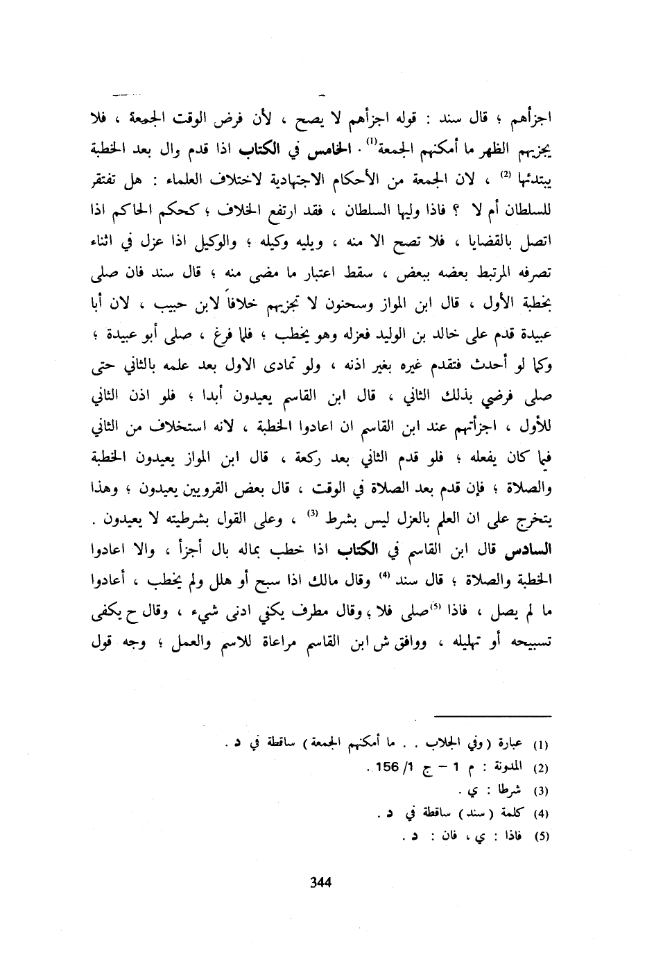 أَجْزَأَهُمْ قَالَ سَنَدٌ قَوْلُهُ أَجْزَأَهُمْ لَا يَصِحُّ لِأَنَّ فَرْضَ الْوَقْتِ الْجُمُعَةُ فَلَا يُجْزِيهِمُ الظُّهْرُ مَا أمكنهم الْجُمُعَة الْخَامِسُ فِي الْكِتَابِ إِذَا قَدِمَ وَالٍ بَعْدَ الْخُطْبَةِ يَبْتَدِئُهَا لِأَنَّ الْجُمُعَةَ مِنَ الْأَحْكَامِ الِاجْتِهَادِيَّةِ لِاخْتِلَافِ الْعُلَمَاءِ هَلْ تَفْتَقِرُ لِلسُّلْطَانِ أَمْ لَا؟ فَإِذَا وَلِيَهَا السُّلْطَانُ فَقَدِ ارْتَفَعَ الْخِلَافُ كَحُكْمِ الْحَاكِمِ إِذَا اتَّصَلَ بِالْقَضَايَا فَلَا تَصِحُّ إِلَّا مِنْهُ ويليه وَكِيلُهُ وَالْوَكِيلُ إِذَا عُزِلَ فِي أَثْنَاءِ تَصَرُّفِهِ الْمُرْتَبِطِ بَعْضُهُ بِبَعْضٍ سَقَطَ اعْتِبَارُ مَا مَضَى مِنْهُ قَالَ سَنَدٌ فَإِنْ صَلَّى بِخُطْبَةِ الْأَوَّلِ قَالَ ابْنُ الْمَوَّازِ وَسَحْنُونٌ لَا تُجْزِيهِمْ خِلَافًا لِابْنِ حَبِيبٍ لِأَنَّ أَبَا عُبَيْدَةَ قَدِمَ عَلَى خَالِدِ بْنِ الْوَلِيدِ فَعَزَلَهُ وَهُوَ يَخْطُبُ فَلَمَّا فَرَغَ صَلَّى أَبُو عُبَيْدَةَ وَكَمَا لَوْ أَحْدَثَ فَتَقَدَّمَ غَيْرُهُ بِغَيْرِ إِذْنِهِ وَلَوْ تَمَادَى الْأَوَّلُ بَعْدَ عِلْمِهِ بِالثَّانِي حَتَّى صَلَّى فَرَضِيَ بِذَلِكَ الثَّانِي قَالَ ابْنُ الْقَاسِمِ يُعِيدُونَ أَبَدًا فَلَوْ أَذِنَ الثَّانِي لِلْأَوَّلِ أَجْزَأَتْهُمْ عِنْدَ ابْنِ الْقَاسِمِ إِنْ أَعَادُوا الْخُطْبَةَ لِأَنَّهُ اسْتِخْلَافٌ مِنَ الثَّانِي فِيمَا كَانَ يَفْعَلُهُ فَلَوْ قَدِمَ الثَّانِي بَعْدَ رَكْعَة قَالَ ابْن الْمَوَّاز يُعِيدُونَ الْخُطْبَةَ وَالصَّلَاةَ فَإِنْ قَدِمَ بَعْدَ الصَّلَاةِ فِي الْوَقْت قَالَ بعض الْقرَوِيين يعيدون وَهَذَا يَتَخَرَّجُ عَلَى أَنَّ الْعِلْمَ بِالْعَزْلِ لَيْسَ بِشَرْط وعَلى القَوْل بشرطيته لَا يعيدون السَّادِسُ قَالَ ابْنُ الْقَاسِمِ فِي الْكِتَابِ إِذَا خطب بِمَالِه بَالٌ أَجْزَأَ وَإِلَّا أَعَادُوا الْخُطْبَةَ وَالصَّلَاةَ قَالَ سَنَدٌ وَقَالَ مَالِكٌ إِذَا سَبَّحَ أَوْ هَلَّلَ وَلم يخْطب أعادوا مَا لم يصل فاذا صَلَّى فَلَا وَقَالَ مُطَرِّفٌ يَكْفِي أَدْنَى شَيْءٍ وَقَالَ ح يَكْفِي تَسْبِيحَةٌ أَوْ تَهْلِيلَةٌ وَوَافَقَ ش ابْنَ الْقَاسِمِ مُرَاعَاةً لِلِاسْمِ وَالْعَمَلِ وَجْهُ قَول