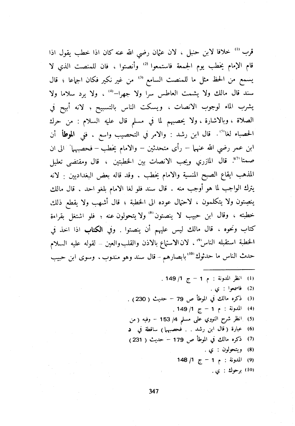 قُرْبٍ خِلَافًا لِابْنِ حَنْبَلٍ لِأَنَّ عُثْمَانَ رَضِيَ اللَّهُ عَنْهُ كَانَ إِذَا خَطَبَ يَقُولُ إِذَا قَامَ الْإِمَامُ يَخْطُبُ يَوْمَ الْجُمُعَةِ فَاسْتَمِعُوا وَأَنْصِتُوا فان للمنصت الَّذِي لَا يسمع من الْحَظ مِثْلَ مَا لِلْمُنْصِتِ السَّامِعِ مِنْ غَيْرِ نَكِيرٍ فَكَانَ إِجْمَاعًا قَالَ سَنَدٌ قَالَ مَالِكٌ وَلَا يُشَمِّتُ الْعَاطِسَ سِرًّا وَلَا جَهْرًا وَلَا يَرُدُّ سَلَامًا وَلَا يَشْرَبُ الْمَاءَ لِوُجُوبِ الْإِنْصَاتِ وَيُسْكِتُ النَّاسَ بِالتَّسْبِيحِ لِأَنَّهُ أُبِيحَ فِي الصَّلَاةِ وَبِالْإِشَارَةِ وَلَا يَحْصِبُهُمْ لِمَا فِي مُسْلِمٍ قَالَ عَلَيْهِ السَّلَامُ مَنْ حَرَّكَ الْحَصْبَاءَ لَغَا قَالَ ابْنُ رُشْدٍ وَالْأَمْرُ فِي التَّحْصِيبِ وَاسِعٌ فَفِي الْمُوَطَّأِ أَنَّ ابْنَ عُمَرَ رَضِيَ اللَّهُ عَنْهُمَا رَأَى مُتَحَدِّثَيْنِ وَالْإِمَامُ يَخْطُبُ فَحَصَبَهُمَا إِلَى أَنْ صَمَتَا قَالَ الْمَازِرِيُّ وَيَجِبُ الْإِنْصَاتُ بَيْنَ الْخُطْبَتَيْنِ قَالَ وَمُقْتَضى تَعْلِيل الْمَذْهَب إِيقَاع الصُّبْحِ الْمَنْسِيَّةِ وَالْإِمَامُ يَخْطُبُ وَقَدْ قَالَهُ بَعْضُ الْبَغْدَادِيِّينَ لِأَنَّهُ يَتْرُكُ الْوَاجِبَ لِمَا هُوَ أَوْجَبُ مِنْهُ قَالَ سَنَدٌ فَلَوْ لَغَا الْإِمَامُ بِلَغْوِ أَحَدٍ قَالَ مَالِكٌ يُنْصِتُونَ وَلَا يَتَكَلَّمُونَ لِاحْتِمَالِ عَوْدِهِ إِلَى الْخُطْبَةِ قَالَ أَشْهَبُ وَلَا يَقْطَعُ ذَلِكَ خُطْبَتَهُ وَقَالَ ابْنُ حَبِيبٍ لَا يُنْصِتُونَ وَلَا يَتَحَوَّلُونَ عَنْهُ فَلَوِ اشْتَغَلَ بِقِرَاءَةِ كِتَابٍ وَنَحْوِهِ قَالَ مَالِكٌ لَيْسَ عَلَيْهِمْ أَنْ يُنْصِتُوا وَفِي الْكِتَابِ إِذَا أَخَذَ فِي الْخُطْبَةِ اسْتَقْبَلَهُ النَّاسُ لِأَنَّ الِاسْتِمَاعَ بِالْأُذُنِ وَالْقَلْبِ وَالْعَيْنِ لِقَوْلِهِ عَلَيْهِ السَّلَامُ حَدِّثِ النَّاسَ مَا حَدَّثُوكَ بِأَبْصَارِهِمْ قَالَ سَنَدٌ وَهُوَ مَنْدُوبٌ وَسَوَّى ابْنُ حَبِيبٍ