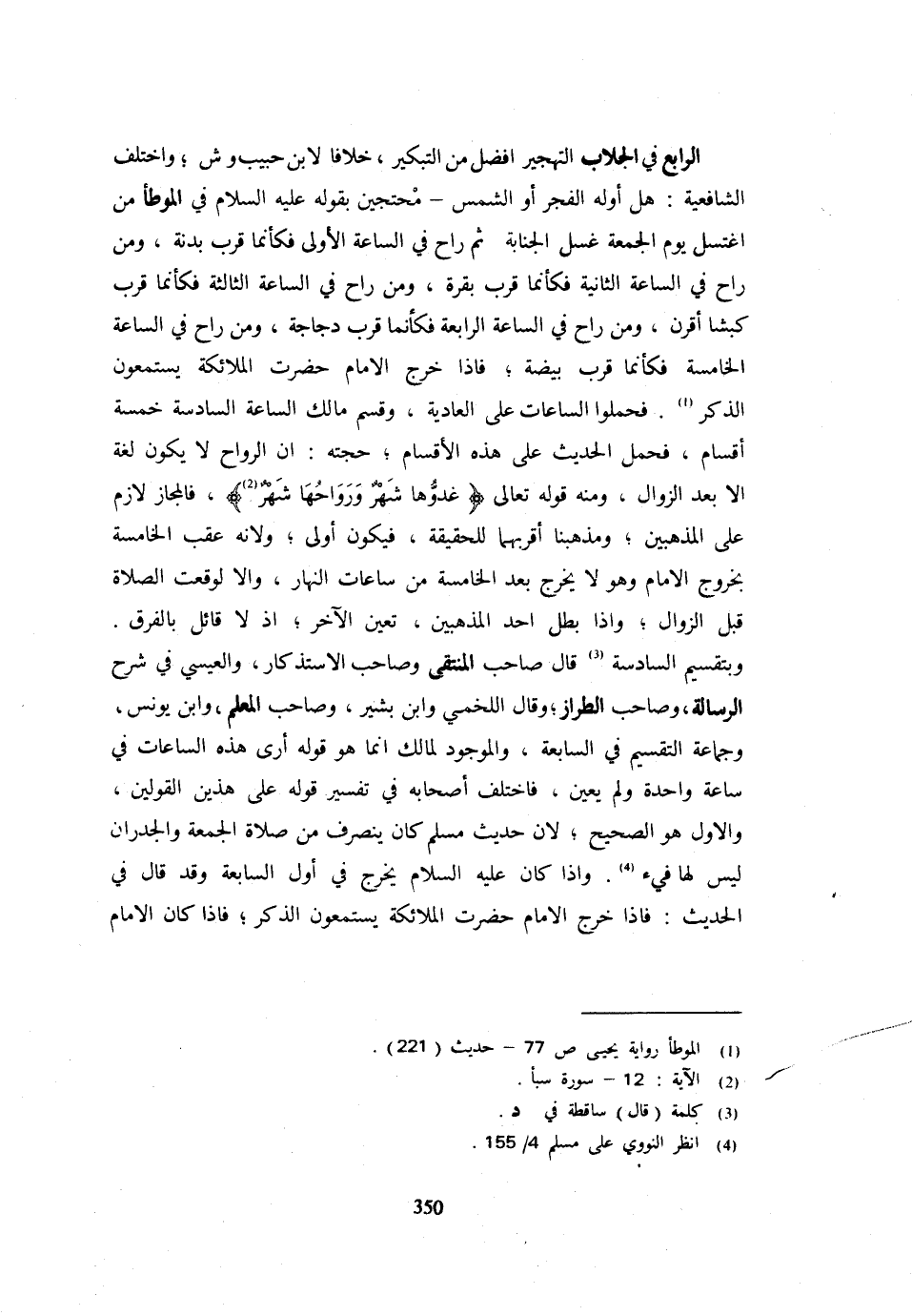الرَّابِعُ فِي الْجُلَّابِ التَّهْجِيرُ أَفْضَلُ مِنَ التَّبْكِيرِ خلافًا لِابْنِ حبيب وش وَاخْتَلَفَ الشَّافِعِيَّةُ هَلْ أَوَّلُهُ الْفَجْرُ أَوِ الشَّمْسُ مُحْتَجِّينَ بِقَوْلِهِ عَلَيْهِ السَّلَامُ فِي الْمُوَطَّأِ مَنِ اغْتَسَلَ يَوْمَ الْجُمُعَةِ غُسْلَ الْجَنَابَةِ ثُمَّ رَاحَ فِي السَّاعَةِ الْأُولَى فَكَأَنَّمَا قَرَّبَ بَدَنَةً وَمَنْ رَاحَ فِي السَّاعَةِ الثَّانِيَةِ فَكَأَنَّمَا قَرَّبَ بَقَرَةً وَمَنْ رَاحَ فِي السَّاعَةِ الثَّالِثَةِ فَكَأَنَّمَا قَرَّبَ كَبْشًا أَقْرَنَ وَمَنْ رَاحَ فِي السَّاعَةِ الرَّابِعَةِ فَكَأَنَّمَا قَرَّبَ دَجَاجَةً وَمَنْ رَاحَ فِي السَّاعَةِ الْخَامِسَةِ فَكَأَنَّمَا قَرَّبَ بَيْضَةً فَإِذَا خَرَجَ الْإِمَامُ حَضَرَتِ الْمَلَائِكَةُ يَسْتَمِعُونَ الذِّكْرَ فَحَمَلُوا السَّاعَاتِ عَلَى الْعَادِيَةِ وَقَسَّمَ مَالِكٌ السَّاعَةَ السَّادِسَةَ خَمْسَةَ أَقْسَامٍ فَحَمَلَ الْحَدِيثَ عَلَى هَذِهِ الْأَقْسَامِ حُجَّتُهُ أَنَّ الرواح لَا يكون لُغَة إِلَّا بَعْدَ الزَّوَالِ وَمِنْهُ قَوْله تَعَالَى {غُدُوُّهَا شهر ورواحها شهر} فَالْمَجَازُ لَازِمٌ عَلَى الْمَذْهَبَيْنِ وَمَذْهَبُنَا أَقْرَبُهُمَا لِلْحَقِيقَةِ فَيَكُونُ أَوْلَى وَلِأَنَّهُ عَقَّبَ الْخَامِسَةَ بِخُرُوجِ الْإِمَامِ وَهُوَ لَا يَخْرُجُ بَعْدَ الْخَامِسَةِ مِنْ سَاعَاتِ النَّهَارِ وَإِلَّا لَوَقَعَتِ الصَّلَاةُ قَبْلَ الزَّوَالِ وَإِذَا بَطَلَ أَحَدُ الْمَذْهَبَيْنِ تَعَيَّنَ الْآخَرُ إِذْ لَا قَائِلَ بِالْفَرْقِ وَبِتَقْسِيمِ السَّادِسَةِ قَالَ صَاحِبُ الْمُنْتَقَى وَصَاحب الاستذكار والعيسى فِي شَرْحِ الرِّسَالَةِ وَصَاحِبُ الطَّرَّازِ وَقَالَ اللَّخْمِيُّ وَابْن بشير وَصَاحب الْمعلم وَابْن يُونُس وَجَمَاعَةُ التَّقْسِيمِ فِي السَّابِعَةِ وَالْمَوْجُودُ لِمَالِكٍ إِنَّمَا هُوَ قَوْلُهُ أَرَى هَذِهِ السَّاعَاتِ فِي سَاعَةٍ وَاحِدَةٍ وَلَمْ يُعَيِّنْ فَاخْتَلَفَ أَصْحَابُهُ فِي تَفْسِيرِ قَوْلِهِ عَلَى هَذَيْنِ الْقَوْلَيْنِ وَالْأَوَّلُ هُوَ الصَّحِيحُ لَان حَدِيث مُسلم كَانَ ينْصَرف مِنْ صَلَاةِ الْجُمُعَةِ وَالْجُدْرَانُ لَيْسَ لَهَا فَيْءٌ وَإِذَا كَانَ عَلَيْهِ السَّلَامُ يَخْرُجُ فِي أَوَّلِ السَّابِعَةِ وَقَدْ قَالَ فِي الْحَدِيثِ فَإِذَا خَرَجَ الْإِمَامُ حَضَرَتِ الْمَلَائِكَةُ يَسْتَمِعُونَ الذِّكْرَ فَإِذَا كَانَ الامام