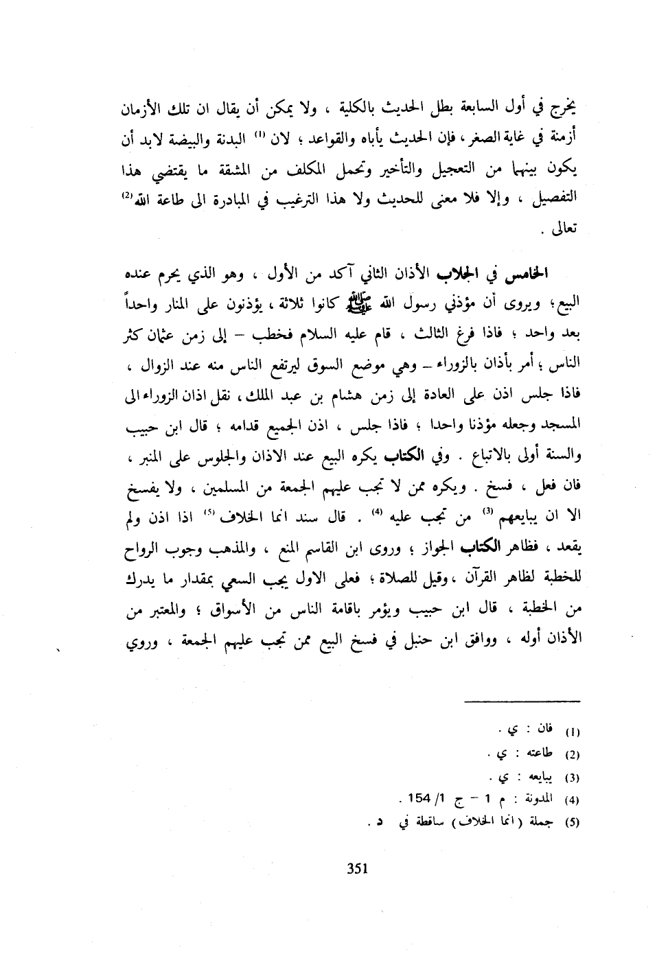 يَخْرُجُ فِي أَوَّلِ السَّابِعَةِ بَطَلَ الْحَدِيثُ بِالْكُلِّيَّةِ وَلَا يُمْكِنُ أَنْ يُقَالَ إِنَّ تِلْكَ الْأَزْمَانَ أَزْمِنَةٌ فِي غَايَةِ الصِّغَرِ فَإِنَّ الْحَدِيثَ يَأْبَاهُ وَالْقَوَاعِدُ لِأَنَّ الْبَدَنَةَ وَالْبَيْضَةَ لَا بُدَّ أَنْ يَكُونَ بَيْنَهُمَا مِنَ التَّعْجِيلِ وَالتَّأْخِيرِ وَتَحَمُّلِ الْمُكَلَّفِ من الْمَشَقَّة مَا يَقْتَضِي هَذَا التَّفْصِيل وَإِلَّا فَلَا معنى للْحَدِيث وَلَا هَذَا التَّرْغِيبِ فِي الْمُبَادَرَةِ إِلَى طَاعَةِ اللَّهِ تَعَالَى الْخَامِسُ فِي الْجُلَّابِ الْأَذَانُ الثَّانِي آكَدُ مِنَ الْأَوَّلِ وَهُوَ الَّذِي يَحْرُمُ عِنْدَهُ الْبَيْعُ وَيُرْوَى أَن مؤذني رَسُول الله - صَلَّى اللَّهُ عَلَيْهِ وَسَلَّم َ - كَانُوا ثَلَاثَة يُؤذنُونَ على المنابر وَاحِدًا بَعْدَ وَاحِدٍ فَإِذَا فَرَغَ الثَّالِثُ قَامَ عَلَيْهِ السَّلَام فَخَطب إِلَى زمن عُثْمَان كَثُرَ النَّاسُ أَمَرَ بِأَذَانٍ بِالزَّوْرَاءِ وَهِيَ مَوْضِعُ السُّوقِ لِيَرْتَفِعَ النَّاسُ مِنْهُ عِنْدَ الزَّوَالِ فَإِذَا جَلَسَ أُذِّنَ عَلَى الْعَادَةِ إِلَى زَمَنِ هِشَامِ بْنِ عَبْدِ الْمَلِكِ نُقِلَ أَذَانُ الزَّوْرَاءِ إِلَى الْمَسْجِدِ وَجَعَلَهُ مُؤَذِّنًا وَاحِدًا فَإِذَا جَلَسَ أَذَّنَ الْجَمِيعُ قُدَّامَهُ قَالَ ابْنُ حَبِيبٍ وَالسُّنَّةُ أَوْلَى بِالِاتِّبَاعِ وَفِي الْكِتَابِ يُكْرَهُ الْبَيْعُ عِنْدَ الْأَذَانِ وَالْجُلُوسِ عَلَى الْمِنْبَرِ فَإِنْ فُعِلَ فُسِخَ وَيُكْرَهُ مِمَّنْ لَا تَجِبُ عَلَيْهِمُ الْجُمُعَةُ مِنَ الْمُسْلِمِينَ وَلَا يُفْسَخُ إِلَّا أَنْ يُبَايِعَهُمْ مَنْ تَجِبُ عَلَيْهِ قَالَ سَنَدٌ إِنَّمَا الْخِلَافُ إِذَا أَذَّنَ وَلَمْ يَقْعُدْ فَظَاهِرُ الْكِتَابِ الْجَوَازُ وَرَوَى ابْنُ الْقَاسِمِ الْمَنْعَ وَالْمَذْهَبُ وُجُوبُ الرَّوَاحِ لِلْخُطْبَةِ لِظَاهِرِ الْقُرْآنِ وَقِيلَ لِلصَّلَاةِ فَعَلَى الْأَوَّلِ يَجِبُ السَّعْيُ بِمِقْدَارِ مَا يُدْرِكُ مِنَ الْخُطْبَةِ قَالَ ابْنُ حَبِيبٍ وَيُؤْمَرُ بِإِقَامَةِ النَّاسِ مِنَ الْأَسْوَاقِ وَالْمُعْتَبَرُ مِنَ الْأَذَانِ أَوَّلُهُ وَوَافَقَ ابْنُ حَنْبَلٍ فِي فَسْخِ الْبَيْعِ مِمَّنْ تَجِبُ عَلَيْهِمُ الْجُمُعَةُ وَرُوِيَ