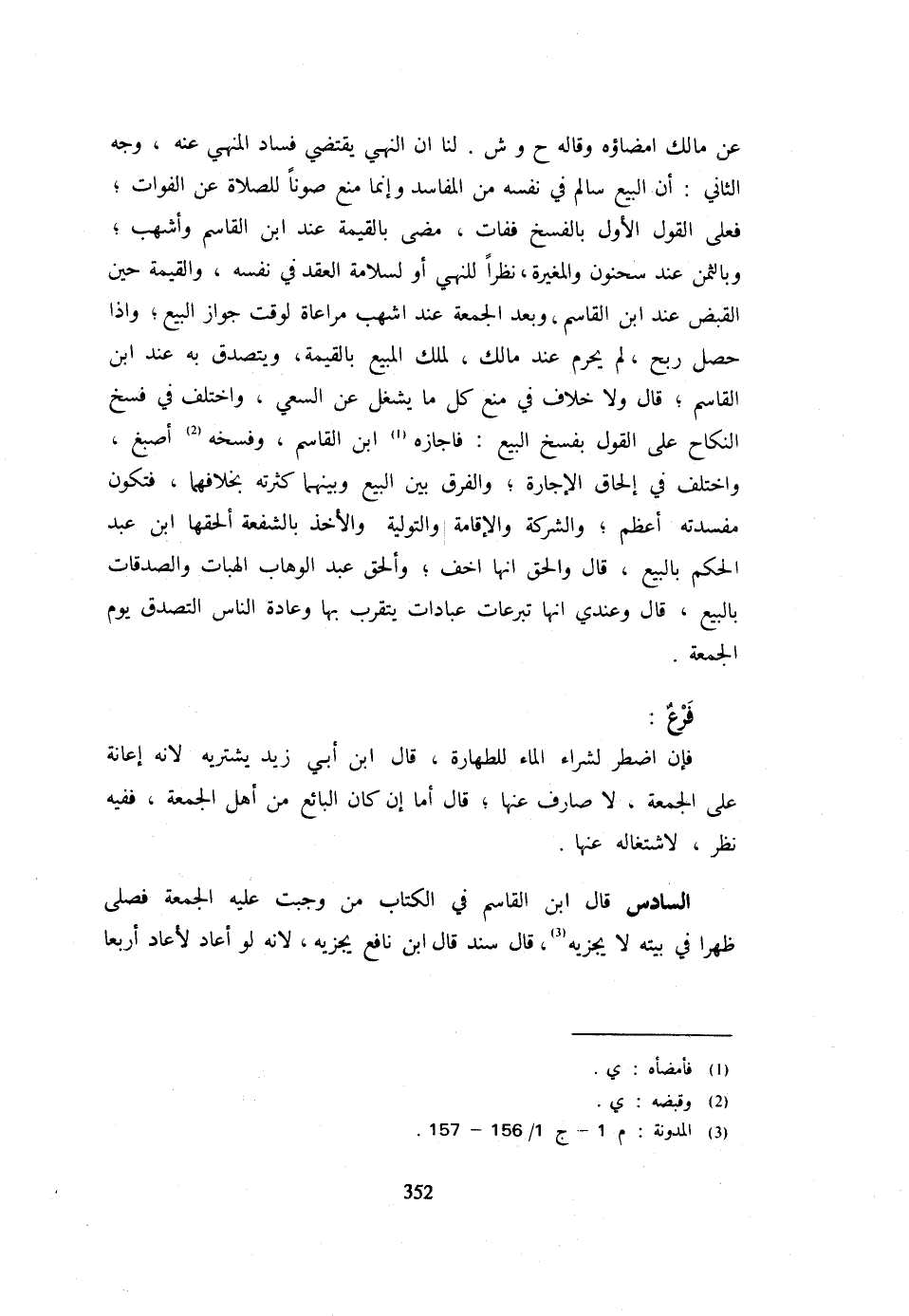 عَن مَالك امضاؤه وَقَالَهُ ح وش لَنَا أَنَّ النَّهْيَ يَقْتَضِي فَسَادَ الْمَنْهِيِّ عَنْهُ وَجْهُ الثَّانِي أَنَّ الْبَيْعَ سَالِمٌ فِي نَفْسِهِ مِنَ الْمَفَاسِدِ وَإِنَّمَا مُنِعَ صَوْنًا لِلصَّلَاةِ عَنِ الْفَوَاتِ فَعَلَى الْقَوْلِ الْأَوَّلِ بِالْفَسْخِ فَفَاتَ مَضَى بِالْقِيمَةِ عِنْدَ ابْنِ الْقَاسِمِ وَأَشْهَبَ وَبِالثَّمَنِ عِنْدَ سَحْنُونٍ وَالْمُغِيرَةِ نَظَرًا لِلنَّهْيِ أَوْ لِسَلَامَةِ الْعَقْدِ فِي نَفْسِهِ وَالْقِيمَةُ حِينَ الْقَبْضِ عِنْدَ ابْنِ الْقَاسِمِ وَبَعْدَ الْجُمُعَةِ عِنْدَ أَشْهَبَ مُرَاعَاةً لِوَقْتِ جَوَازِ الْبَيْعِ وَإِذَا حَصَلَ رِبْحٌ لَمْ يَحْرُمْ عِنْدَ مَالِكٍ لِمِلْكِ الْمَبِيعِ بِالْقِيمَةِ وَيَتَصَدَّقُ بِهِ عِنْدَ ابْنِ الْقَاسِمِ قَالَ وَلَا خِلَافَ فِي مَنْعِ كُلِّ مَا يَشْغَلُ عَنِ السَّعْيِ وَاخْتُلِفَ فِي فَسْخِ النِّكَاحِ عَلَى الْقَوْلِ بِفَسْخِ الْبَيْعِ فَأَجَازَهُ ابْنُ الْقَاسِمِ وَفَسَخَهُ أَصْبَغُ وَاخْتُلِفَ فِي إِلْحَاقِ الْإِجَارَةِ وَالْفَرْقُ بَيْنَ الْبَيْعِ وَبَيْنَهُمَا كَثْرَتُهُ بخلافهما فَتكون مفسدته أعظم وَالشَّرِكَة وَالْإِقَامَة وَالتَّوْلِيَةُ وَالْأَخْذُ بِالشُّفْعَةِ أَلْحَقَهَا ابْنُ عَبْدِ الْحَكَمِ بِالْبيعِ قَالَ وَالْحق أَنَّهَا أَخَفُّ وَأَلْحَقَ عَبْدُ الْوَهَّابِ الْهِبَاتِ وَالصَّدَقَاتِ بِالْبَيْعِ قَالَ وَعِنْدِي أَنَّهَا تَبَرُّعَاتُ عِبَادَاتٍ يُتَقَرَّبُ بِهَا وَعَادَةُ النَّاسِ التَّصَدُّقُ يَوْمَ الْجُمُعَةِ