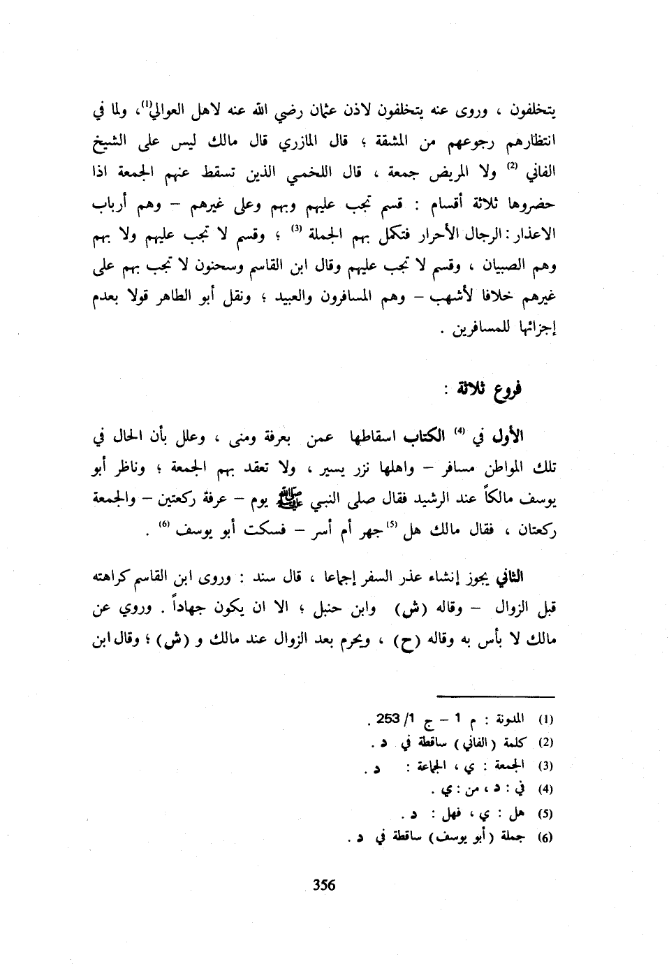 يَتَخَلَّفُونَ وَرُوِيَ عَنْهُ يَتَخَلَّفُونَ لِإِذْنِ عُثْمَانَ رَضِيَ اللَّهُ عَنْهُ لِأَهْلِ الْعَوَالِي وَلِمَا فِي انْتِظَارِهِمْ رجوعهم مِنَ الْمَشَقَّةِ قَالَ الْمَازِرِيُّ قَالَ مَالِكٌ لَيْسَ عَلَى الشَّيْخِ الْفَانِي وَلَا الْمَرِيضِ جُمُعَةٌ قَالَ اللَّخْمِيُّ الَّذِينَ تَسْقُطُ عَنْهُمُ الْجُمُعَةُ إِذَا حَضَرُوهَا ثَلَاثَة أَقسَام قسم تجب عَلَيْهِم وبهم على غَيْرِهِمْ وَهُمْ أَرْبَابُ الْأَعْذَارِ الرِّجَالُ الْأَحْرَارُ فَتَكْمُلُ بهم الْجُمْلَة وَقِسْمٌ لَا تَجِبُ عَلَيْهِمْ وَلَا بِهِمْ وَهُمُ الصِّبْيَانُ وَقِسْمٌ لَا تَجِبُ عَلَيْهِمْ وَقَالَ ابْنُ الْقَاسِمِ وَسَحْنُونٌ لَا تَجِبُ بِهِمْ عَلَى غَيْرِهِمْ خِلَافًا لِأَشْهَبَ وَهُمُ الْمُسَافِرُونَ وَالْعَبِيدُ وَنَقَلَ أَبُو الطَّاهِرِ قَوْلًا بِعَدَمِ إِجْزَائِهَا لِلْمُسَافِرِينَ