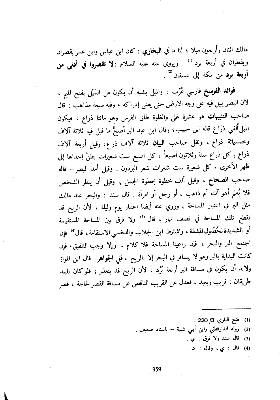 لاتقصروا فِي أَدْنَى مِنْ أَرْبَعَةِ بُرُدٍ مِنْ مَكَّةَ إِلَى عُسْفَانَ فَوَائِدُ الْفَرْسَخُ فَارِسِيٌّ عُرِّبَ وَالْمِيلُ يُشْبِهُ أَنْ يَكُونَ مِنَ الْمَيْلِ بِفَتْحِ الْمِيمِ لِأَنَّ الْبَصَرَ يَمِيلُ فِيهِ عَلَى وَجْهِ الْأَرْضِ حَتَّى يفنى إِدْرَاكُهُ وَفِيهِ سَبْعَةُ مَذَاهِبَ قَالَ صَاحِبُ التَّنْبِيهَاتِ هُوَ عشرَة غلى وَالْغَلْوَةُ طَلَقُ الْفَرَسِ وَهُوَ مِائَتَا ذِرَاعٍ فَيَكُونُ الْمِيلُ أَلْفَيْ ذِرَاعٍ قَالَهُ ابْنُ حَبِيبٍ وَقَالَ ابْنُ عَبْدِ الْبَرِّ أَصَحُّ مَا قِيلَ فِيهِ ثَلَاثَةُ آلَافٍ وَخَمْسُمِائَةِ ذِرَاعٍ وَنَقَلَ صَاحِبُ الْبَيَانِ ثَلَاثَةُ آلَافِ ذِرَاعٍ وَقِيلَ أَرْبَعَةُ آلَافِ ذِرَاعٍ كُلُّ ذِرَاعٍ سِتَّةٌ وَثَلَاثُونَ أُصْبُعًا كُلُّ أُصْبُعٍ سِتُّ شَعِيرَاتٍ بَطْنُ إِحْدَاهَا إِلَى ظَهْرِ الْأُخْرَى كل شعيرَة سِتّ شَعرَات شعر الْبِرْذَوْنِ وَقِيلَ أَمَدُ الْبَصَرِ قَالَهُ صَاحِبُ الصِّحَاحِ وَقِيلَ أَلْفُ خُطْوَةٍ بِخُطْوَةِ الْجَمَلِ وَقِيلَ أَنْ يَنْظُرَ الشَّخْصُ فَلَا يَعْلَمُ أَهُوَ آتٍ أَمْ ذَاهِبٌ أَوْ رَجُلٌ أَوِ امْرَأَةٌ قَالَ سَنَدٌ وَالْبَحْرُ عِنْدَ مَالِكٍ مِثْلُ الْبَرِّ فِي اعْتِبَارِ المساحة وَرُوِيَ عَنْهُ أَيْضًا اعْتِبَارُ يَوْمٍ وَلَيْلَةٍ لِأَنَّ الرّيح قد تقطع تِلْكَ المساحة فِي نِصْفِ نَهَارٍ قَالَ وَلَا فَرْقَ بَيْنَ المساحة المستقيمة أَو الشَّدِيدَة لِحُصُولِ الْمَشَقَّةِ وَاشْتَرَطَ ابْنُ الْجَلَّابِ وَاللَّخْمِيُّ الِاسْتِقَامَةَ قَالَ فَإِنِ اجْتَمَعَ الْبَرُّ وَالْبَحْرُ فَإِنْ رَاعَيْنَا الْمِسَاحَةَ فَلَا كَلَامَ وَإِلَّا وَجَبَ التَّلْفِيقُ فَإِنْ كَانَتِ الْبِدَايَةُ بِالْبَرِّ وَهُوَ لَا يُسَافِرُ فِي الْبَحْرِ إِلَّا بِالرِّيحِ فَفِي الْجَوَاهِرِ قَالَ ابْنُ الْمَوَّاز ولابد أَن يكون فِي مَسَافَةِ الْبَرِّ أَرْبَعَةُ بُرُدٍ لِأَنَّ الرِّيحَ قد يتَعَذَّر فَلَوْ كَانَ لِلْبَلَدِ طَرِيقَانِ قَرِيبٌ وَبَعِيدٌ فَعَدَلَ عَنِ الْقَرِيبِ النَّاقِصِ عَنْ مَسَافَةِ الْقَصْرِ لِحَاجَةٍ قصر