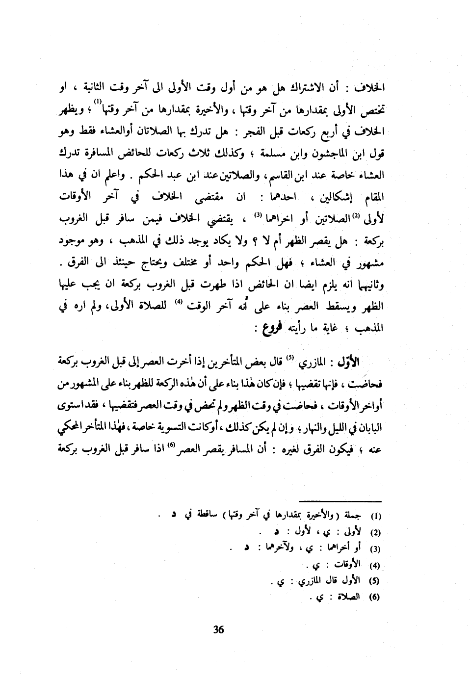 الْخِلَافِ أَنَّ الِاشْتِرَاكَ هَلْ هُوَ مِنْ أَوَّلِ وَقْتِ الْأُولَى إِلَى آخِرِ وَقْتِ الثَّانِيَةِ أَوْ تَخْتَصُّ الْأُولَى بِمِقْدَارِهَا مِنْ آخِرِ وَقْتِهَا وَالْأَخِيرَةُ بِمِقْدَارِهَا مِنْ آخِرِ وَقْتِهَا وَيَظْهَرُ الْخِلَافُ فِي أَرْبَعِ رَكَعَاتٍ قَبْلَ الْفَجْرِ هَلْ تُدْرَكُ بِهَا الصَّلَاتَانِ أَوِ الْعِشَاءُ فَقَطْ وَهُوَ قَوْلُ ابْنِ الْمَاجِشُونِ وَابْنِ مَسْلَمَةَ وَكَذَلِكَ ثَلَاثُ رَكَعَاتٍ لِلْحَائِضِ الْمُسَافِرَةِ تُدْرِكُ الْعِشَاءَ خَاصَّةً عِنْدَ ابْنِ الْقَاسِمِ وَالصَّلَاتَيْنِ عِنْدَ ابْنِ عَبْدِ الْحَكَمِ وَاعْلَمْ أَنَّ فِي هَذَا الْمَقَامِ إِشْكَالَيْنِ أَحَدُهُمَا أَنَّ مُقْتَضَى الْخِلَافِ فِي آخِرِ الْأَوْقَاتِ لِأُولَى الصَّلَاتَيْنِ أَوْ أُخْرَاهُمَا يَقْتَضِي الْخِلَافَ فِيمَنْ سَافَرَ قَبْلَ الْغُرُوبِ بِرَكْعَةٍ هَلْ يَقْصُرُ الظُّهْرَ أَمْ لَا وَلَا يَكَادُ يُوجَدُ ذَلِكَ فِي الْمَذْهَبِ وَهُوَ مَوْجُودٌ مَشْهُورٌ فِي الْعِشَاءِ فَهَلِ الْحُكْمُ وَاحِدٌ أَوْ مُخْتَلِفٌ وَيَحْتَاجُ حِينَئِذٍ إِلَى الْفَرْقِ وَثَانِيهِمَا أَنَّهُ يَلْزَمُ أَيْضًا أَنَّ الْحَائِضَ إِذَا طَهُرَتْ قَبْلَ الْغُرُوب بِرَكْعَة أَن يَجِبَ عَلَيْهَا الظُّهْرُ وَيَسْقُطَ الْعَصْرُ بِنَاءً عَلَى أَنه آخِرُ الْوَقْتِ لِلصَّلَاةِ الْأُولَى وَلَمْ أَرَهُ فِي الْمَذْهَب غَايَة مَا رَأَيْته فروع الأول الْمَازِرِيُّ قَالَ بَعْضُ الْمُتَأَخِّرِينَ إِذَا أَخَّرَتِ الْعَصْرَ إِلَى قَبْلِ الْغُرُوبِ بِرَكْعَةٍ فَحَاضَتْ فَإِنَّهَا تَقْضِيهَا فَإِنْ كَانَ هَذَا بِنَاءً عَلَى أَنَّ هَذِهِ الرَّكْعَةَ لِلظُّهْرِ بِنَاءً عَلَى الْمَشْهُورِ مِنْ أَوَاخِرِ الْأَوْقَاتِ فَحَاضَتْ فِي وَقْتِ الظُّهْرِ وَلَمْ تَحِضْ فِي وَقْتِ الْعَصْرِ فَتَقْضِيهَا فَقَدِ اسْتَوَى الْبَابَانِ فِي اللَّيْلِ وَالنَّهَارِ وَإِنْ لَمْ يَكُنْ كَذَلِكَ أَو كَانَت التَّسْوِيَة خَاصَّة فَهَذَا الْمُتَأَخر الْمَحْكِيُّ عَنْهُ فَيَكُونُ الْفَرْقُ لِغَيْرِهِ أَنَّ الْمُسَافِرَ يَقْصُرُ الْعَصْرَ إِذَا سَافَرَ قَبْلَ الْغُرُوبِ بِرَكْعَةٍ