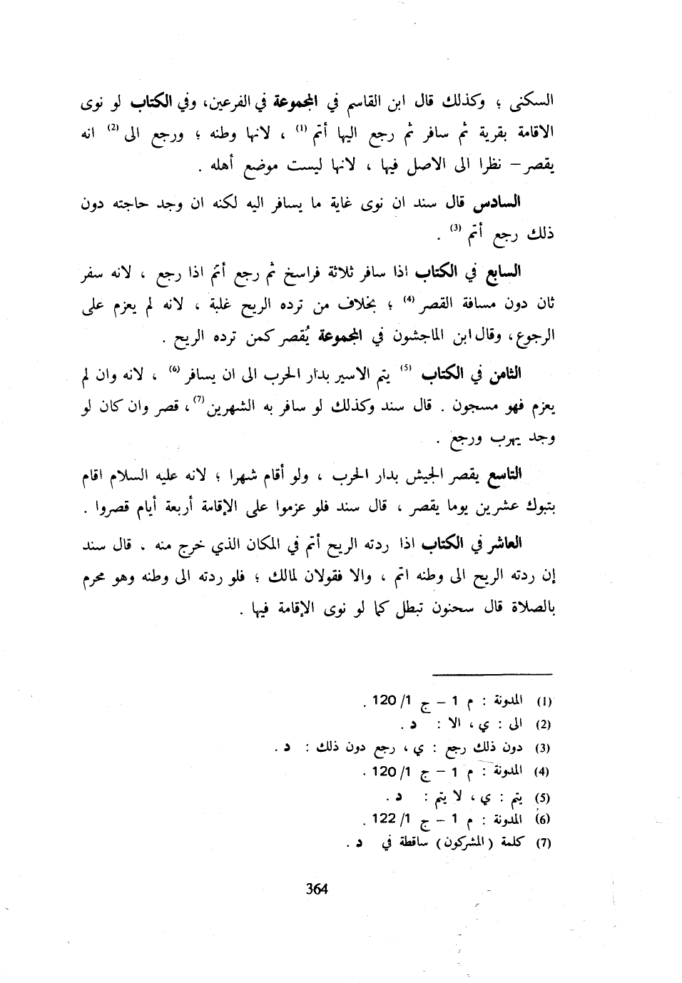 السُّكْنَى وَكَذَلِكَ قَالَ ابْنُ الْقَاسِمِ فِي الْمَجْمُوعَةِ فِي الْفَرْعَيْنِ وَفِي الْكِتَابِ لَوْ نَوَى الْإِقَامَةَ بِقَرْيَةٍ ثُمَّ سَافَرَ ثُمَّ رَجَعَ إِلَيْهَا أَتَمَّ لِأَنَّهَا وَطَنُهُ وَرَجَعَ إِلَى أَنَّهُ يَقْصُرُ نَظَرًا إِلَى الْأَصْلِ فِيهَا لِأَنَّهَا لَيْسَتْ مَوْضِعَ أَهْلِهِ السَّادِسُ قَالَ سَنَدٌ إِنْ نَوَى غَايَةَ مَا يُسَافِرُ إِلَيْهِ لَكِنَّهُ إِنْ وَجَدَ حَاجَتَهُ دُونَ ذَلِكَ رَجَعَ أَتَمَّ السَّابِعُ فِي الْكِتَابِ إِذَا سَافَرَ ثَلَاثَةَ فَرَاسِخَ ثُمَّ رَجَعَ أَتَمَّ إِذَا رَجَعَ لِأَنَّهُ سَفَرٌ ثَانٍ دُونَ مَسَافَةِ الْقَصْرِ بِخِلَافِ مَنْ تَرُدُّهُ الرِّيحُ غَلَبَةً لِأَنَّهُ لَمْ يَعْزِمْ عَلَى الرُّجُوعِ وَقَالَ ابْنُ الْمَاجِشُونِ فِي الْمَجْمُوعَةِ يَقْصُرُ كَمَنْ تَرُدُّهُ الرِّيحُ الثَّامِنُ فِي الْكِتَابِ يُتِمُّ الْأَسِيرُ بِدَارِ الْحَرْبِ إِلَى أَنْ يُسَافِرَ لِأَنَّهُ وَإِنْ لَمْ يَعْزِمْ فَهُوَ مَسْجُونٌ قَالَ سَنَدٌ وَكَذَلِكَ لَوْ سَافَرَ بِهِ الشَّهْرَيْنِ قَصَرَ وَإِنْ كَانَ لَوْ وَجَدَ يَهْرُبُ وَرَجَعَ التَّاسِعُ يَقْصُرُ الْجَيْشُ بِدَارِ الْحَرْبِ وَلَوْ أَقَامَ شَهْرًا لِأَنَّهُ عَلَيْهِ السَّلَامُ أَقَامَ بِتَبُوكَ عِشْرِينَ يَوْمًا يَقْصُرُ قَالَ سَنَدٌ فَلَوْ عَزَمُوا عَلَى الْإِقَامَةِ أَرْبَعَةَ أَيَّامٍ قَصَرُوا الْعَاشِرُ فِي الْكِتَابِ إِذَا رَدَّتْهُ الرِّيحُ أَتَمَّ فِي الْمَكَانِ الَّذِي خَرَجَ مِنْهُ قَالَ سَنَدٌ إِنْ رَدَّتْهُ الرِّيحُ إِلَى وَطَنِهِ أَتَمَّ وَإِلَّا فَقَوْلَانِ لِمَالِكٍ فَلَوْ رَدَّتْهُ إِلَى وَطَنِهِ وَهُوَ مُحْرِمٌ بِالصَّلَاةِ قَالَ سَحْنُون تبطل كَمَا لَو نوى الْإِقَامَة فِيهَا