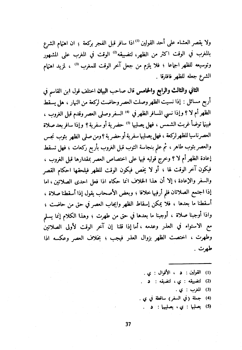 وَلَا يقْتَصر الْعِشَاءَ عَلَى أَحَدِ الْقَوْلَيْنِ إِذَا سَافَرَ قَبْلَ الْفجْر بِرَكْعَة إِن اهْتِمَامَ الشَّرْعِ بِالْمَغْرِبِ فِي الْوَقْتِ أَكْثَرُ مِنَ الظّهْر لتضييقه الْوَقْت فِي الْمغرب عَلَى الْمَشْهُورِ وَتَوْسِيعِهِ لِلظُّهْرِ إِجْمَاعًا فَلَا يَلْزَمُ مِنْ جَعْلِ آخِرِ الْوَقْتِ لِلْمَغْرِبِ لِمَزِيدِ اهْتِمَامِ الشَّرْعَ جَعَلَهُ لِلظُّهْرِ فَافْتَرَقَا الثَّانِي وَالثَّالِثُ وَالرَّابِعُ وَالْخَامِسُ قَالَ صَاحِبُ الْبَيَانِ اخْتَلَفَ قَوْلُ ابْنِ الْقَاسِمِ فِي أَرْبَعِ مَسَائِلَ إِذَا نَسِيَتِ الظُّهْرَ وَصَلَّتِ الْعَصْرَ وَحَاضَتْ لِرَكْعَةٍ مِنَ النَّهَارِ هَلْ يَسْقُطُ الظُّهْرُ أَمْ لَا وَإِذَا نَسِيَ الْمُسَافِرُ الظُّهْرَ فِي السَّفَرِ وَصَلَّى الْعَصْرَ وَقَدِمَ قَبْلَ الْغُرُوب فَبَيْنَمَا تَوَضَّأ غَرَبَتِ الشَّمْسُ فَهَلْ يُصَلِّيهَا حَضَرِيَّةً أَوْ سَفَرِيَّةً وَإِذَا سَافَرَ بَعْدَ صَلَاةِ الْعَصْرِ نَاسِيًا لِلظُّهْرِ لِرَكْعَةٍ فَهَلْ يُصَلِّيهَا سَفَرِيَّةً أَوْ حَضَرِيَّةً وَمَنْ صَلَّى الظُّهْرَ بِثَوْبٍ نَجِسٍ وَالْعَصْرَ بِثَوْبٍ طَاهِرٍ ثُمَّ عَلِمَ بِنَجَاسَةِ الثَّوْبِ قَبْلَ الْغُرُوبِ بِأَرْبَعِ رَكَعَاتٍ فَهَلْ تَسْقُطُ إِعَادَةُ الظُّهْرِ أَمْ لَا وَخرج قَوْلَيْهِ فِيهَا عَلَى اخْتِصَاصِ الْعَصْرِ بِمِقْدَارِهَا قَبْلَ الْغُرُوبِ فَيَكُونُ آخِرُ الْوَقْتِ لَهَا أَوْ لَا يَخُصُّ فَيَكُونُ الْوَقْتُ لِلظُّهْرِ فَيَلْحَقُهَا أَحْكَامُ الْقَصْرِ وَالسَّفَرِ وَالْإِعَادَةِ إِلَّا أَنَّ هَذَا الْخِلَافَ إِنَّمَا حَكَاهُ إِذَا فَعَلَ إِحْدَى الصَّلَاتَيْنِ أَمَّا إِذَا اجْتَمَعَ الصَّلَاتَانِ فَلَمْ أَرَ فِيهَا خِلَافًا وَبَعْضُ الْأَصْحَابِ يَقُولُ إِذَا أَسْقَطْنَا صَلَاةً أَسْقَطْنَا مَا بَعْدَهَا فَلَا يُمْكِنُ إِسْقَاطُ الظُّهْرِ وَإِيجَابُ الْعَصْرِ فِي حَقِّ مَنْ حَاضَتْ وَإِذَا أَوْجَبْنَا صَلَاةً أَوْجَبْنَا مَا بَعْدَهَا فِي حَقِّ مَنْ طَهُرَتْ وَهَذَا الْكَلَامُ إِنَّمَا يَسْلَمُ مَعَ الِاسْتِوَاءِ فِي الْعُذْرِ وَعَدَمِهِ أَمَّا إِذَا قُلْنَا إِنَّ آخِرَ الْوَقْت لأولى الصَّلَاتَيْنِ وطهرت اخْتَصَّتِ الظُّهْرَ بِزَوَالِ الْعُذْرِ فَيَجِبُ بِخِلَافِ الْعَصْرِ وَعَكْسُهُ إِذَا طَهُرَتْ