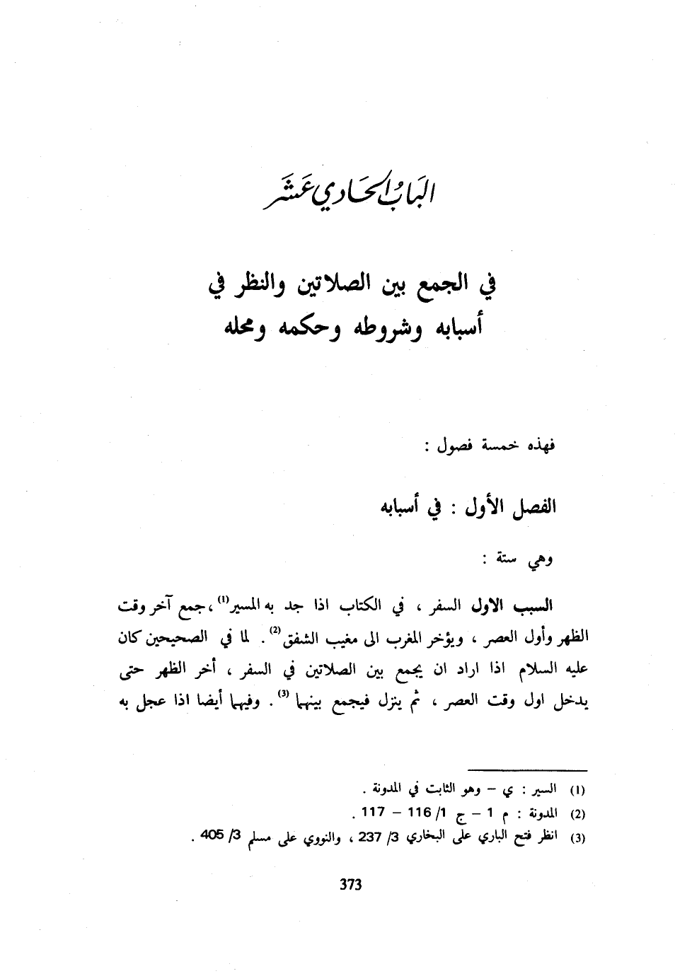 (الْبَابُ الْحَادِيَ عَشَرَ فِي الْجَمْعِ بَيْنَ الصَّلَاتَيْنِ وَالنَّظَر فِي أَسبَابه وشروطه وَحكمه وَمحله)