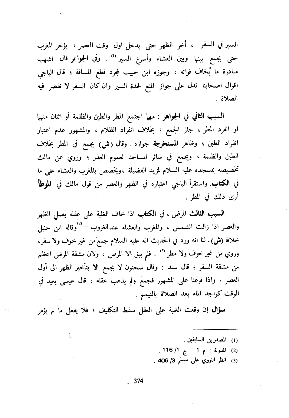 السَّيْرُ فِي السَّفَرِ أَخَّرَ الظُّهْرَ حَتَّى يَدْخُلَ أول وَقت الْعَصْر يُؤَخر الْمَغْرِبَ حَتَّى يَجْمَعَ بَيْنَهَا وَبَيْنَ الْعِشَاءِ وَأَسْرَعَ السّير وَفِي الْجَوَاهِرِ قَالَ أَشْهَبُ مُبَادَرَةُ مَا يُخَافُ فَوَاته وَجوزهُ ابْن حبيب لمُجَرّد قَطْعِ الْمَسَافَةِ قَالَ الْبَاجِيُّ أَقْوَالُ أَصْحَابِنَا تَدُلُّ على جَوَاز الْمَنْع لحدة السَّيْرِ وَإِنْ كَانَ السَّفَرُ لَا تُقْصَرُ فِيهِ الصَّلَاة السَّبَب الثَّانِي فِي الْجَوَاهِر مهما اجْتَمَعَ الْمَطَرُ وَالطِّينُ وَالظُّلْمَةُ أَوِ اثْنَانِ مِنْهُمَا أَوِ انْفَرَدَ الْمَطَرُ جَازَ الْجَمْعُ بِخِلَافِ انْفِرَادِ الظَّلَامِ وَالْمَشْهُورُ عَدَمُ اعْتِبَارِ انْفِرَادِ الطِّينِ وَظَاهِرُ الْمُسْتَخْرَجَةِ جَوَازُهُ وَقَالَ (ش) يَجْمَعُ فِي الْمَطَرِ بِخِلَافِ الطِّينِ وَالظُّلْمَةِ وَيَجْمَعُ فِي سَائِرِ الْمَسَاجِدِ لعُمُوم الْعذر وَرُوِيَ عَنْ مَالِكٍ تَخْصِيصُهُ بِمَسْجِدِهِ عَلَيْهِ السَّلَامُ لِمَزِيدِ الْفَضِيلَةِ وَيُخَصَّصُ بِالْمَغْرِبِ وَالْعِشَاءِ عَلَى مَا فِي الْكِتَابِ وَاسْتَقْرَأَ الْبَاجِيُّ اعْتِبَارَهُ فِي الظُّهْرِ وَالْعَصْرِ مِنْ قَوْلِ مَالِكٍ فِي الْمُوَطَّأِ أَرَى ذَلِكَ فِي الْمَطَرِ السَّبَبُ الثَّالِثُ الْمَرَضُ فِي الْكِتَابِ إِذَا خَافَ الْغَلَبَةَ عَلَى عَقْلِهِ يُصَلِّي الظُّهْرَ وَالْعَصْرَ إِذَا زَالَتِ الشَّمْسُ وَالْمَغْرِبَ وَالْعِشَاءَ عِنْدَ الْغُرُوب وَقَالَهُ ابْن حَنْبَل خلافًا (ش) لَنَا أَنَّهُ وَرَدَ فِي الْحَدِيثِ أَنَّهُ عَلَيْهِ السَّلَامُ جَمَعَ مِنْ غَيْرِ خَوْفٍ وَلَا سَفَرٍ وَرُوِيَ مِنْ غَيْرِ خَوْفٍ وَلَا مَطَرٍ فَلَمْ يَبْقَ إِلَّا الْمَرَضُ وَلِأَنَّ مَشَقَّةَ الْمَرَضِ أَعْظَمُ مِنْ مَشَقَّةِ السَّفَرِ قَالَ سَنَدٌ وَقَالَ سَحْنُونٌ لَا يَجْمَعُ إِلَّا بِتَأْخِيرِ الظُّهْرِ إِلَى أَوَّلِ الْعَصْرِ وَإِذَا فَرَّعْنَا عَلَى الْمَشْهُورِ فَجَمَعَ وَلَمْ يَذْهَبْ عَقْلُهُ قَالَ عِيسَى يُعِيدُ فِي الْوَقْتِ كَوَاجِدِ الْمَاءِ بَعْدَ الصَّلَاةِ بِالتَّيَمُّمِ سُؤَالٌ إِنْ وَقَعَتِ الْغَلَبَةُ عَلَى الْعَقْلِ سَقَطَ التَّكْلِيفُ فَلَا يَفْعَلُ مَا لَمْ يُؤْمَرْ