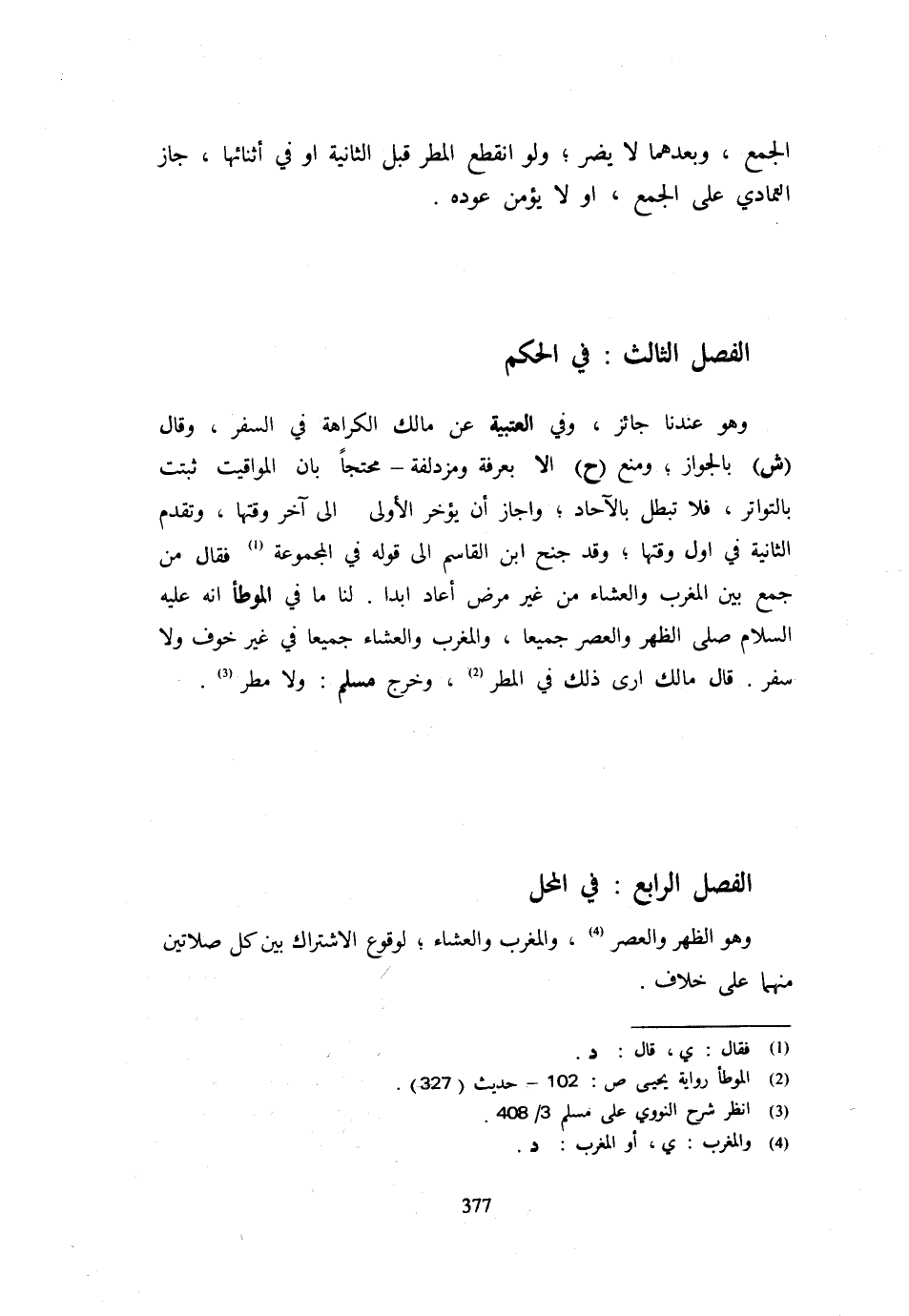وَهُوَ عِنْدَنَا جَائِزٌ وَفِي الْعُتْبِيَّةِ عَنْ مَالِكٍ الْكَرَاهَةُ فِي السَّفَرِ وَقَالَ (ش) بِالْجَوَازِ وَمَنَعَ (ح) إِلَّا بِعَرَفَةَ وَمُزْدَلِفَةَ مُحْتَجًّا بِأَنَّ الْمَوَاقِيتَ ثَبَتَتْ بِالتَّوَاتُرِ فَلَا تبطل بالآحاد وَأَجَازَ أَن يُؤَخر الْأُولَى إِلَى آخِرِ وَقْتِهَا وَتُقَدَّمَ الثَّانِيَةُ فِي أَوَّلِ وَقْتِهَا وَقَدْ جَنَحَ ابْنُ الْقَاسِمِ إِلَى قَوْلِهِ فِي الْمَجْمُوعَةِ فَقَالَ مَنْ جَمَعَ بَيْنَ الْمَغْرِبِ وَالْعِشَاءِ مِنْ غَيْرِ مَرَضٍ أَعَادَ أَبَدًا لَنَا مَا فِي الْمُوَطَّأِ أَنَّهُ عَلَيْهِ السَّلَامُ صَلَّى الظُّهْرَ وَالْعَصْرَ جَمِيعًا وَالْمَغْرِبَ وَالْعَشَاءَ جَمِيعًا فِي غَيْرِ خَوْفٍ وَلَا سَفَرٍ قَالَ مَالِكٌ أَرَى ذَلِكَ فِي الْمَطَرِ وَخَرَّجَ مُسْلِمٌ وَلَا مَطَرٍ