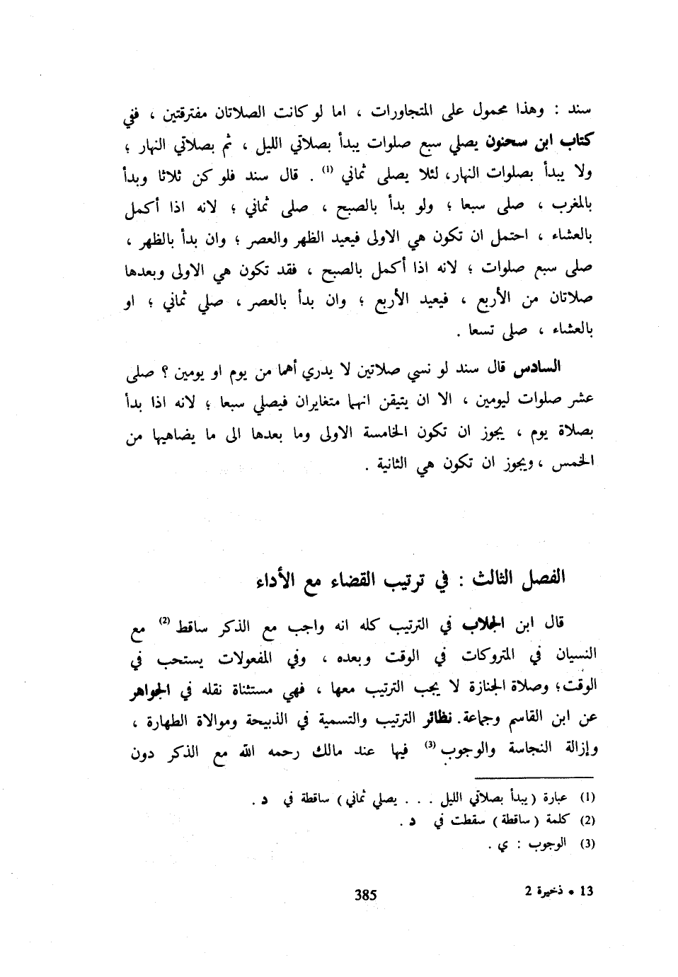 سَنَدٌ وَهَذَا مَحْمُولٌ عَلَى الْمُتَجَاوِرَاتِ أَمَّا لَوْ كَانَت الصَّلَاتَان مفترقتين فَفِي كتاب ابْن سَحْنُونٍ يُصَلِّي سَبْعَ صَلَوَاتٍ يَبْدَأُ بِصَلَاتَيِ اللَّيْلِ ثُمَّ بِصَلَاتَيِ النَّهَارِ وَلَا يَبْدَأُ بِصَلَوَاتِ النَّهَارِ لِئَلَّا يُصَلِّي ثَمَانِي قَالَ سَنَدٌ فَلَوْ كُنَّ ثَلَاثًا وَبَدَأَ بِالْمَغْرِبِ صلى سبعا وَلَو بَدَأَ بالصبح صلى ثَمَانِي لِأَنَّهُ إِذَا أَكْمَلَ بِالْعِشَاءِ احْتَمَلَ أَنْ تَكُونَ هِيَ الْأُولَى فَيُعِيدُ الظُّهْرَ وَالْعَصْرَ وَإِنْ بَدَأَ بِالظُّهْرِ صَلَّى سَبْعَ صَلَوَاتٍ لِأَنَّهُ إِذَا أَكْمَلَ بِالصُّبْحِ فَقَدْ تَكُونُ هِيَ الْأُولَى وَبَعْدَهَا صَلَاتَانِ مِنَ الْأَرْبَعِ فَيُعِيدُ الْأَرْبَعَ وَإِنْ بَدَأَ بِالْعَصْرِ صلى ثَمَانِي أَو بالعشاء صلى تسعا السَّادِسُ قَالَ سَنَدٌ لَوْ نَسِيَ صَلَاتَيْنِ لَا يَدْرِي أَهُمَا مِنْ يَوْمٍ أَوْ يَوْمَيْنِ صَلَّى عَشْرَ صَلَوَاتٍ لِيَوْمَيْنِ إِلَّا أَنْ يَتَيَقَّنَ أَنَّهُمَا متغايران فَيصَلي سبعا لِأَنَّهُ إِذا بَدَأَ بِصَلَاة يَوْم يَجُوزُ أَنْ تَكُونَ الْخَامِسَةُ الْأُولَى وَمَا بَعْدَهَا إِلَى مَا يضاهيها من الْخمس وَيجوز أَنْ تَكُونَ هِيَ الثَّانِيَةَ