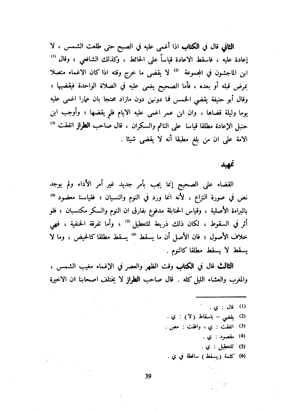 تَمْهِيدٌ الْقَضَاءُ عَلَى الصَّحِيحِ إِنَّمَا يَجِبُ بِأَمْرٍ جَدِيدٍ غَيْرَ أَمْرِ الْأَدَاءِ وَلَمْ يُوجَدْ نَصٌّ فِي صُورَةِ النِّزَاعِ لِأَنَّهُ إِنَّمَا وَرَدَ فِي النَّوْمِ وَالنِّسْيَانِ فَقِيَاسُنَا مَعْضُودٌ بِالْبَرَاءَةِ الْأَصْلِيَّةِ وَقِيَاسُ الْحَنَابِلَةِ مَدْفُوعٌ بِفَارِقِ أَنَّ النّوم وَالسكر مكتسبان فَلَو أثر فِي السُّقُوطِ لَكَانَ ذَلِكَ ذَرِيعَةً لِلتَّعْطِيلِ وَأَمَّا تَفْرِقَةُ الْحَنَفِيَّةِ فَهِيَ خِلَافُ الْأُصُولِ فَإِنَّ الْأَصْلَ أَنَّ مَا يَسْقُطُ يَسْقُطُ مُطْلَقًا كَالْحَيْضِ وَمَا لَا يَسْقُطُ لَا يَسْقُطُ مُطْلَقًا كَالنَّوْمِ الثَّالِثُ قَالَ فِي الْكِتَابِ وَقْتُ الظُّهْرِ وَالْعَصْرِ فِي الْإِغْمَاء مَغِيبِ الشَّمْسِ وَالْمَغْرِبِ وَالْعِشَاءِ اللَّيْلُ كُلُّهُ قَالَ صَاحِبُ الطَّرَّازِ لَا يَخْتَلِفُ أَصْحَابُنَا أَنَّ الْأَخِيرَةَ
