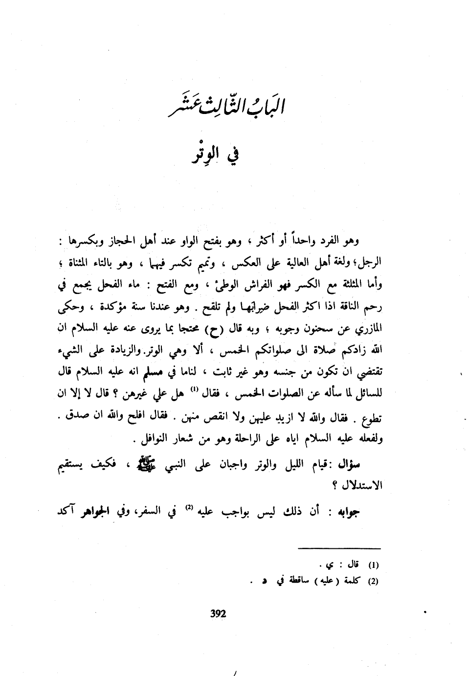 وَهُوَ الْفَرْدُ وَاحِدًا أَوْ أَكْثَرَ وَهُوَ بِفَتْحِ الْوَاوِ عِنْدَ أهل الْحجاز وبكسرها الرجل وَلُغَةُ أَهْلِ الْعَالِيَةِ عَلَى الْعَكْسِ وَتَمِيمٌ تَكْسِرُ فِيهِمَا وَهُوَ بِالتَّاءِ الْمُثَنَّاةِ وَأَمَّا الْمُثَلَّثَةُ مَعَ الْكسر فَهُوَ الْفراش الوطئ وَمَعَ الْفَتْح مَاء الْفَحْل يجمع فِي رَحِمِ النَّاقَةِ إِذَا أَكْثَرَ الْفَحْلُ ضِرَابَهَا وَلَمْ تَلْقَحْ وَهُوَ عِنْدَنَا سُنَّةٌ مُؤَكَّدَةٌ وَحَكَى الْمَازِرِيُّ عَنْ سَحْنُونٍ وُجُوبَهُ وَبِهِ قَالَ (ح) مُحْتَجًّا بِمَا يُرْوَى عَنْهُ عَلَيْهِ السَّلَامُ إِنَّ اللَّهَ زَادَكُمْ صَلَاةً إِلَى صَلَوَاتِكُمُ الْخَمْسِ أَلَا وَهِيَ الْوِتْرُ وَالزِّيَادَةُ عَلَى الشَّيْءِ تَقْتَضِي أَنْ تَكُونَ مِنْ جِنْسِهِ وَهُوَ غَيْرُ ثَابِتٍ لَنَا مَا فِي مُسْلِمٍ أَنَّهُ عَلَيْهِ السَّلَامُ قَالَ لِلسَّائِلِ لَمَّا سَأَلَهُ عَنِ الصَّلَوَاتِ الْخَمْسِ فَقَالَ هَلْ عَلَيَّ غَيْرُهُنَّ قَالَ لَا إِلَّا أَنْ تَطَوَّعَ فَقَالَ وَاللَّهِ لَا أَزِيدُ عَلَيْهِنَّ وَلَا أَنْقُصُ مِنْهُنَّ فَقَالَ أَفْلَحَ وَاللَّهِ إِنْ صَدَقَ وَلِفِعْلِهِ عَلَيْهِ السَّلَامُ إِيَّاهُ عَلَى الرَّاحِلَةِ وَهُوَ مِنْ شِعَارِ النَّوَافِلِ سُؤَالٌ قِيَامُ اللَّيْلِ وَالْوِتْرِ واجبان على النَّبِي - صَلَّى اللَّهُ عَلَيْهِ وَسَلَّم َ - فَكَيْفَ يَسْتَقِيمُ الِاسْتِدْلَالُ جَوَابُهُ أَنَّ ذَلِكَ لَيْسَ بِوَاجِبٍ عَلَيْهِ فِي السَّفَرِ وَفِي الْجَوَاهِرِ آكَدُ