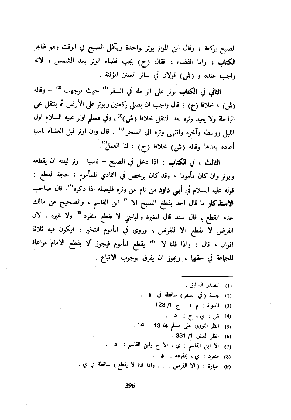 الصُّبْحَ بِرَكْعَةٍ وَقَالَ ابْنُ الْمَوَّازِ يُوتِرُ بِوَاحِدَةٍ وَيُكْمِلُ الصُّبْحَ فِي الْوَقْتِ وَهُوَ ظَاهِرُ الْكِتَابِ وَأَمَّا الْقَضَاءُ فَقَالَ (ح) يَجِبُ قَضَاءُ الْوِتْرِ بعد الشَّمْس لِأَنَّهُ وَاجِب عِنْده و (ش) قَولَانِ فِي سَائِر السّنَن المؤقتة الثَّانِي فِي الْكِتَابِ يُوتِرُ عَلَى الرَّاحِلَةِ فِي السّفر حَيْثُ تَوَجَّهت وَقَالَهُ (ش) خلافًا (ح) قَالَ وَاجِب أَنْ يُصَلِّيَ رَكْعَتَيْنِ وَيُوتِرَ عَلَى الْأَرْضِ ثُمَّ ينْتَقل عَلَى الرَّاحِلَةِ وَلَا يُعِيدُ وِتْرَهُ بَعْدَ التَّنَفُّلِ خلافًا (ش) وَفِي مُسْلِمٍ أَوْتَرَ عَلَيْهِ السَّلَامُ أَوَّلَ اللَّيْلِ وَوَسَطَهُ وَآخِرَهُ وَانْتَهَى وِتْرُهُ إِلَى السَّحَرِ قَالَ وَإِنْ أَوْتَرَ قَبْلَ الْعِشَاءِ نَاسِيًا أَعَادَهُ بعْدهَا وَقَالَهُ (ش) خلافًا (ح) لنا الْعَمَل الثَّالِث فِي الْكتاب إِذَا دَخَلَ فِي الصُّبْحِ نَاسِيًا وِتْرَ لَيْلَتِهِ أَنْ يَقْطَعَهُ وَيُوتِرَ وَإِنْ كَانَ مَأْمُومًا وَقَدْ كَانَ يُرَخَّصُ فِي التَّمَادِي لِلْمَأْمُومِ حُجَّةُ الْقَطْعِ قَوْلُهُ عَلَيْهِ السَّلَامُ فِي أَبِي دَاوُدَ