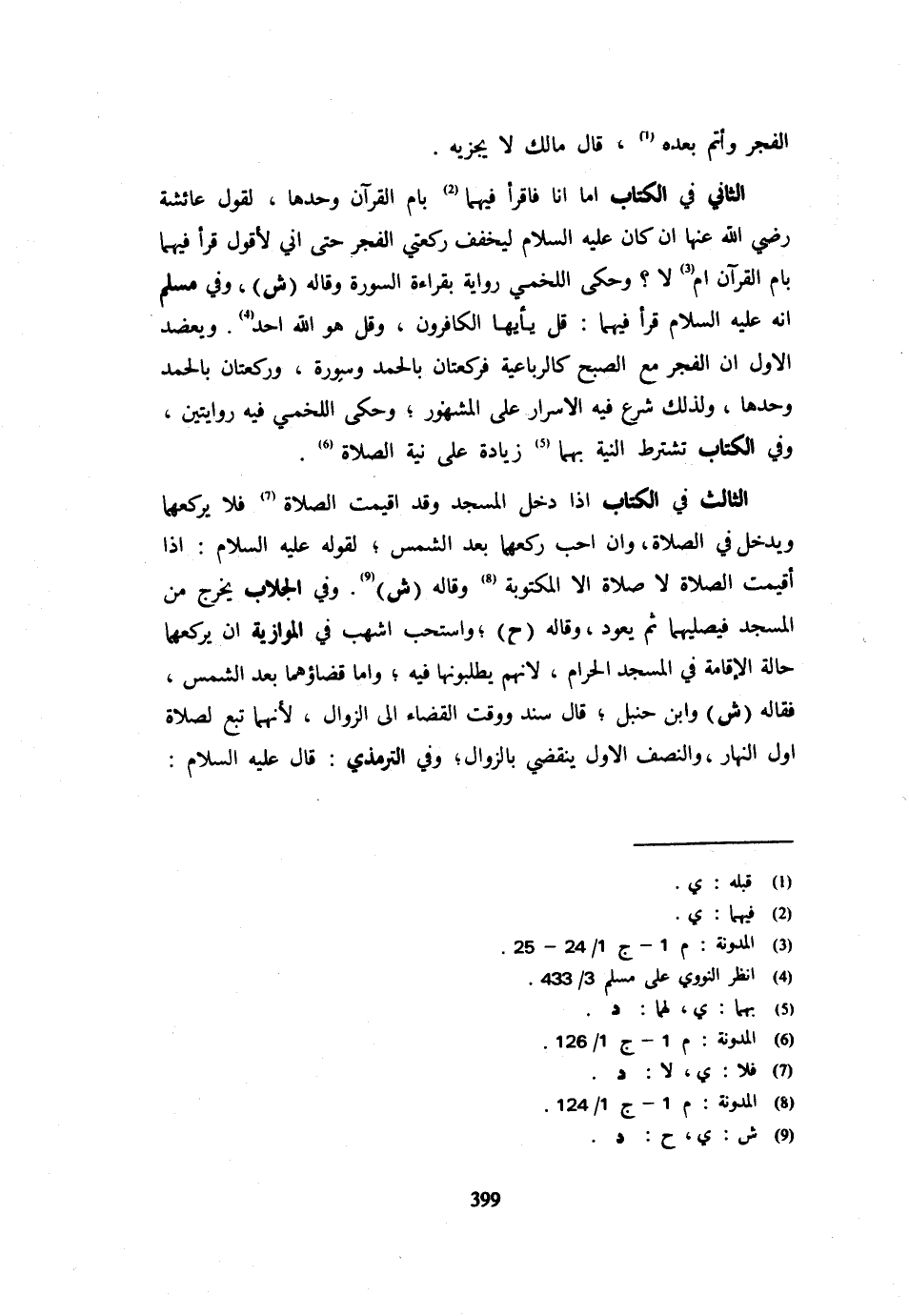 الْفَجْرِ وَأَتَمَّ بَعْدَهُ قَالَ مَالِكٌ لَا يُجْزِيهِ الثَّانِي فِي الْكِتَابِ أَمَّا أَنَا فَأَقْرَأُ فِيهِمَا بِأُمِّ الْقُرْآنِ وَحْدَهَا لِقَوْلِ عَائِشَةَ رَضِيَ اللَّهُ عَنْهَا إِنْ كَانَ عَلَيْهِ السَّلَامُ لَيُخَفِّفُ رَكْعَتَيِ الْفَجْرِ حَتَّى إِنِّي لَأَقُولُ قَرَأَ فِيهِمَا بِأُمِّ الْقُرْآنِ أَمْ لَا وَحَكَى اللَّخْمِيُّ رِوَايَةً بِقِرَاءَةِ السُّورَةِ وَقَالَهُ (ش) وَفِي مُسْلِمٍ أَنَّهُ عَلَيْهِ السَّلَامُ قَرَأَ فِيهِمَا {قُلْ يَا أَيُّهَا الْكَافِرُونَ} {وَقل هُوَ اللَّهُ أَحَدٌ} وَيُعَضِّدُ الْأَوَّلَ أَنَّ الْفَجْرَ مَعَ الصُّبْح كالرباعية فركعتان بِالْحَمْد وَسورَة وركعتان بِالْحَمْد وَحدهَا وَلذَلِك شرع فِيهِ الْإِسْرَارُ عَلَى الْمَشْهُورِ وَحَكَى اللَّخْمِيُّ فِيهِ رِوَايَتَيْنِ وَفِي الْكِتَابِ تُشْتَرَطُ النِّيَّةُ بِهِمَا زِيَادَةً عَلَى نِيَّة الصَّلَاة الثَّالِثُ فِي الْكِتَابِ إِذَا دَخَلَ الْمَسْجِدَ وَقَدْ اقيمت الصَّلَاة فَلَا يَرْكَعْهُمَا وَيَدْخُلُ فِي الصَّلَاةِ وَإِنْ أَحَبَّ رَكَعَهُمَا بَعْدَ الشَّمْسِ لِقَوْلِهِ عَلَيْهِ السَّلَامُ