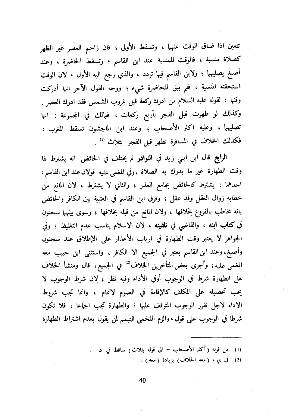 تَتَعَيَّنُ إِذَا ضَاقَ الْوَقْتُ عَنْهُمَا وَتَسْقُطُ الْأُولَى فَإِنْ زَاحَمَ الْعَصْرَ غَيْرُ الظُّهْرِ كَصَلَاةٍ مَنْسِيَّةٍ فالوقت للمنسية عِنْدَ ابْنِ الْقَاسِمِ وَتَسْقُطُ الْحَاضِرَةُ وَعِنْدَ أَصْبَغَ يُصَلِّيهمَا ولانب الْقَاسِمِ فِيهَا تَرَدُّدٌ وَالَّذِي رَجَعَ إِلَيْهِ الْأَوَّلُ لِأَنَّ الْوَقْتَ اسْتَحَقَّتْهُ الْمَنْسِيَّةُ فَلَمْ يَبْقَ لِلْحَاضِرَةِ شَيْءٌ وَوَجْهُ الْقَوْلِ الْآخَرِ أَنَّهَا أَدْرَكَتْ وَقْتَهَا لقَوْله عَلَيْهِ السَّلَامُ مَنْ أَدْرَكَ رَكْعَةً قَبْلَ غُرُوبِ الشَّمْسِ فَقَدْ أَدْرَكَ الْعَصْرَ وَكَذَلِكَ لَوْ طَهُرَتْ قَبْلَ الْفَجْرِ بِأَرْبَعِ رَكَعَاتٍ فَلِمَالِكٍ فِي الْمَجْمُوعَةِ أَنَّهَا تُصَلِّيهِمَا وَعَلَيْهِ أَكْثَرُ الْأَصْحَابِ وَعِنْدَ ابْنِ الْمَاجِشُونِ تَسْقُطُ الْمَغْرِبُ فَكَذَلِكَ الْخِلَافُ فِي الْمُسَافِرَةِ تَطْهُرُ قَبْلَ الْفَجْرِ بِثَلَاثٍ الرَّابِعُ قَالَ ابْنُ أبي زيد فِي النَّوَادِر لم يخْتَلف فِي الْحَائِضِ إِنَّهُ يُشْتَرَطُ لَهَا وَقْتُ الطَّهَارَةِ غَيْرَ مَا يُدْرَكُ بِهِ الصَّلَاةَ وَفِي الْمُغْمَى عَلَيْهِ قَوْلَانِ عِنْدَ ابْنِ الْقَاسِمِ أَحَدُهُمَا يُشْتَرَطُ كَالْحَائِضِ بِجَامِعِ الْعُذْرِ وَالثَّانِي لَا يُشْتَرَطُ لِأَنَّ الْمَانِعَ مِنْ خِطَابِهِ زَوَالُ الْعَقْلِ وَقَدْ عَقَلَ وَفَرَّقَ ابْنُ الْقَاسِمِ فِي الْعُتْبِيَّةِ بَيْنَ الْكَافِرِ وَالْحَائِضِ بِأَنَّهُ مُخَاطَبٌ بِالْفُرُوعِ بِخِلَافِهَا وَلِأَنَّ الْمَانِعَ مِنْ قِبَلِهِ بِخِلَافِهَا وَسَوَّى بَيْنَهُمَا سَحْنُونٌ فِي كِتَابِ ابْنِهِ وَالْقَاضِي فِي تَلْقِينِهِ لِأَنَّ الْإِسْلَامَ يُنَاسِبُ عَدَمَ التَّغْلِيظِ وَفِي الْجَوَاهِرِ لَا يُعْتَبَرُ وَقْتُ الطَّهَارَةِ فِي أَرْبَابِ الْأَعْذَارِ عَلَى الْإِطْلَاقِ عِنْدَ سَحْنُونٍ وَأَصْبَغَ وَعِنْدَ ابْنِ الْقَاسِمِ يُعْتَبَرُ فِي الْجَمِيعِ إِلَّا الْكَافِرَ وَاسْتَثْنَى ابْنُ حَبِيبٍ مَعَهُ الْمُغْمَى عَلَيْهِ وَأَجْرَى بَعْضُ الْمُتَأَخِّرِينَ الْخِلَافَ فِي الْجَمِيعِ قَالَ وَمَنْشَأُ الْخِلَافِ هَلِ الطَّهَارَةُ شَرْطٌ فِي الْوُجُوبِ أَوْ فِي الْأَدَاءِ وَفِيهِ نَظَرٌ لِأَنَّ شَرْطَ الْوُجُوبِ لَا يَجِبُ تَحْصِيلُهُ على الْمُكَلف كالإقامة فِي الصَّوْم لإتمام وَإِنَّمَا تَجِبُ شُرُوطُ الْأَدَاءِ لِأَجْلِ تَقَرُّرِ الْوُجُوبِ الْمُتَوَقِّفِ عَلَيْهَا وَالطَّهَارَةُ تَجِبُ إِجْمَاعًا فَلَا تَكُونُ شَرْطًا فِي الْوُجُوبِ عَلَى قَوْلٍ وَأَلْزَمَ اللَّخْمِيُّ التَّيَمُّمَ لِمَنْ يَقُولُ بِعَدَمِ اشْتِرَاطِ الطَّهَارَةِ