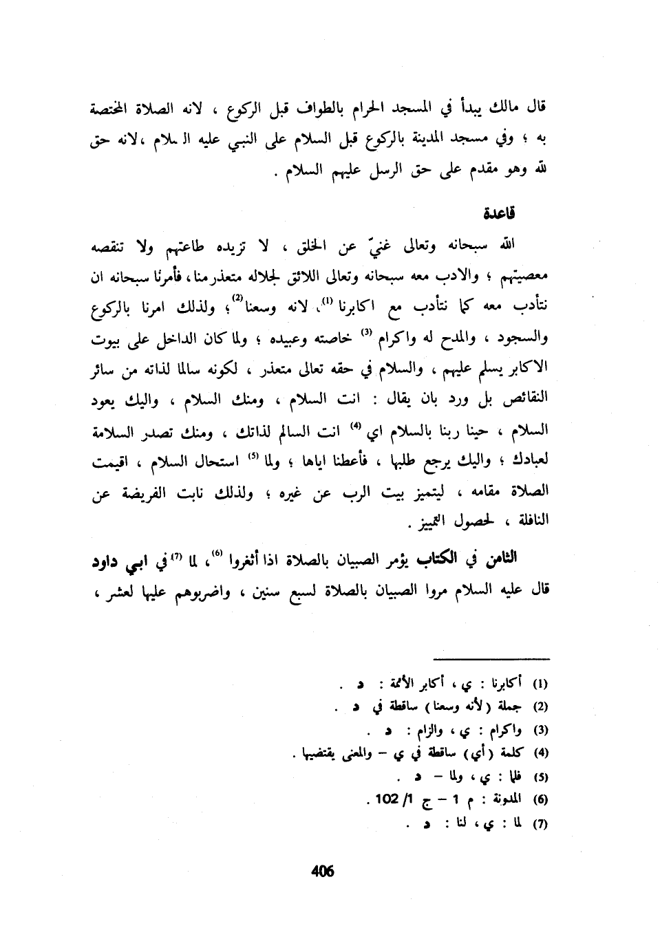 قَاعِدَة الله سُبْحَانَهُ وَتَعَالَى غَنِيٌّ عَنِ الْخَلْقِ لَا تَزِيدُهُ طَاعَتُهُمْ وَلَا تنقصه معصيتهم وَالْأَدب مَعَه سُبْحَانَهُ وَتَعَالَى اللَّائِق لجلاله مُتَعَذر منا فَأمرنَا سُبْحَانَهُ أَنْ نَتَأَدَّبَ مَعَهُ كَمَا نَتَأَدَّبُ مَعَ اكابرنا لِأَنَّهُ وَسِعَنَا وَلِذَلِكَ أَمَرَنَا بِالرُّكُوعِ وَالسُّجُودِ وَالْمَدْحِ لَهُ وَإِكْرَامِ خَاصَّتِهِ وَعَبِيدِهِ وَلَمَّا كَانَ الدَّاخِلُ على بيُوت الأكابر يسلم عَلَيْهِم وَالسَّلَام فِي حَقه تَعَالَى مُتَعَذر لكَونه سالما لذاته من سَائِر النقائض بل وَرَدَ بِأَنْ يُقَالَ أَنْتَ السَّلَامُ وَمِنْكَ السَّلَامُ وَإِلَيْكَ يَعُودُ السَّلَامُ حَيِّنَا رَبَّنَا بِالسَّلَامِ أَيْ أَنْتَ السَّالِمُ لِذَاتِكَ وَمِنْكَ تَصْدُرُ السَّلَامَةُ لِعِبَادِكَ وَإِلَيْكَ يَرْجِعُ طَلَبُهَا فَأَعْطِنَا إِيَّاهَا وَلَمَّا اسْتَحَالَ السَّلَامُ أُقِيمَتِ الصَّلَاةُ مَقَامَهُ لِيَتَمَيَّزَ بَيْتُ الرَّبِّ عَنْ غَيْرِهِ وَلِذَلِكَ نَابَتِ الْفَرِيضَةُ عَنِ النَّافِلَةِ لحُصُول التَّمْيِيز الثَّامِنُ فِي الْكِتَابِ يُؤْمَرُ الصِّبْيَانُ بِالصَّلَاةِ إِذَا أَثْغَرُوا لِمَا فِي أَبِي دَاوُدَ قَالَ عَلَيْهِ السَّلَامُ