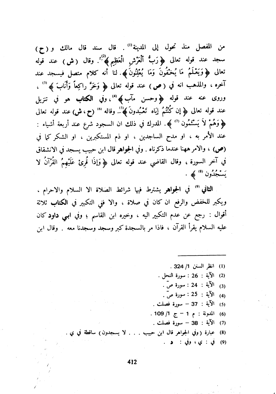 مِنَ الْمُفَصَّلِ مُنْذُ تَحَوَّلَ إِلَى الْمَدِينَةِ قَالَ سَنَدٌ قَالَ مَالِكٌ وَ (ح) سَجَدَ عِنْدَ قَوْله تَعَالَى {رب الْعَرْش الْعَظِيم} وَقَالَ (ش) عِنْدَ قَوْله تَعَالَى {وَيَعْلَمُ مَا يخفون وَمَا يعلنون} لَنَا أَنَّهُ كَلَامٌ مُتَّصِلٌ فَيُسْجَدُ عِنْدَ آخِرِهِ وَالْمذهب أَنه فِي (ص) عِنْد قَوْله تَعَالَى {وخر رَاكِعا وأناب} وروى عَنهُ عِنْد قَوْله {وَحسن مآب} وَفِي الْكتاب هُوَ فِي تَنْزِيل عِنْدَ قَوْله تَعَالَى {إِنْ كُنْتُمْ إِيَّاهُ تَعْبُدُونَ} وَقَالَهُ (ح وش) عِنْد قَوْله تَعَالَى {وهم لَا يسئمون} الْمُدْرَكُ فِي ذَلِكَ أَنَّ السُّجُودَ شُرِعَ عِنْدَ أَرْبَعَةِ أَشْيَاءَ عِنْدَ الْأَمْرِ بِهِ أَوْ مَدْحِ الساجدين أَو ذمّ المستكبرين أَو الشُّكْر كَمَا فِي (ص) وَالْأَمر هَهُنَا عِنْدَمَا ذَكَرْنَاهُ وَفِي الْجَوَاهِرِ قَالَ ابْنُ حَبِيبٍ يَسْجُدُ فِي الْانْشِقَاقِ فِي آخِرِ السُّورَةِ وَقَالَ الْقَاضِي عِنْدَ قَوْله تَعَالَى {وَإِذَا قُرِئَ عَلَيْهِمُ الْقُرْآنُ لَا يَسْجُدُونَ} الثَّانِي فِي الْجَوَاهِرِ يُشْتَرَطُ فِيهَا شَرَائِطُ الصَّلَاةِ إِلَّا السَّلَامَ وَالْإِحْرَامَ وَيُكَبِّرُ لِلْخَفْضِ وَالرَّفْعِ إِنْ كَانَ فِي صَلَاةٍ وَإِلَّا فَفِي التَّكْبِيرِ فِي الْكِتَابِ ثَلَاثَةُ أَقْوَالٍ رَجَعَ عَنْ عَدَمِ التَّكْبِيرِ إِلَيْهِ وَخَيَّرَهُ ابْنُ الْقَاسِمِ وَفِي أَبِي دَاوُدَ كَانَ عَلَيْهِ السَّلَامُ يَقْرَأُ الْقُرْآنَ فَإِذَا مَرَّ بِالسَّجْدَةِ كَبَّرَ وَسَجَدَ وَسَجَدْنَا مَعَهُ وَقَالَ ابْنُ