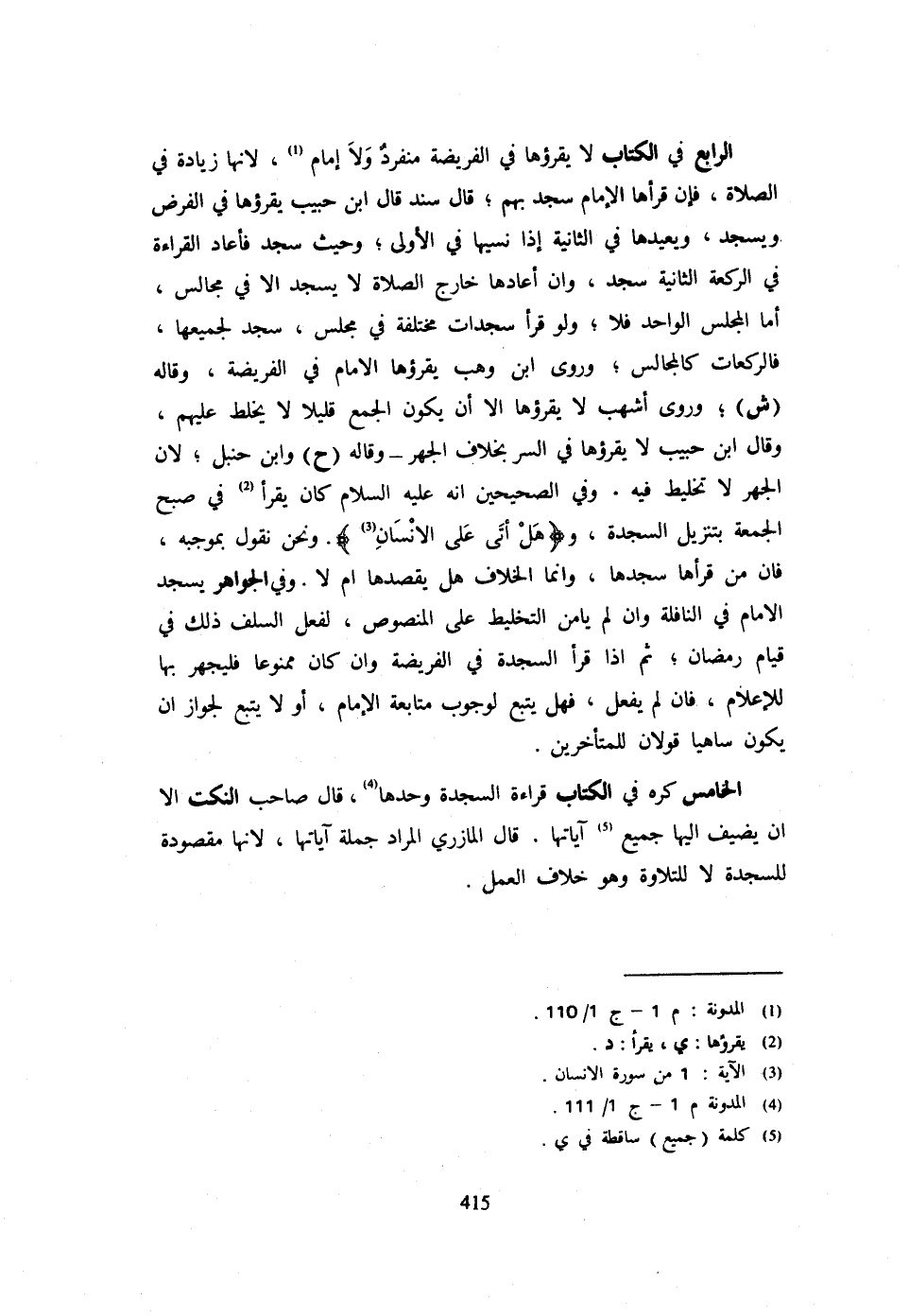 الرَّابِعُ فِي الْكِتَابِ لَا يَقْرَؤُهَا فِي الْفَرِيضَةِ مُنْفَرد وَلَا إِمَام لِأَنَّهَا زِيَادَةٌ فِي الصَّلَاةِ فَإِنْ قَرَأَهَا الْإِمَامُ سَجَدَ بِهِمْ قَالَ سَنَدٌ قَالَ ابْنُ حَبِيبٍ يَقْرَؤُهَا فِي الْفَرْضِ وَيَسْجُدُ وَيُعِيدُهَا فِي الثَّانِيَةِ إِذَا نَسِيَهَا فِي الْأُولَى وَحَيْثُ سَجَدَ فَأَعَادَ الْقِرَاءَةَ فِي الرَّكْعَةِ الثَّانِيَةِ سَجَدَ وَإِنْ أَعَادَهَا خَارِجَ الصَّلَاةِ لَا يَسْجُدُ إِلَّا فِي مَجَالِسَ أَمَّا الْمَجْلِسُ الْوَاحِدُ فَلَا وَلَوْ قَرَأَ سَجَدَاتٍ مُخْتَلِفَةً فِي مَجْلِسٍ سَجَدَ لِجَمِيعِهَا فَالرَّكَعَاتُ كَالْمَجَالِسِ وَرَوَى ابْنُ وَهْبٍ يَقْرَؤُهَا الْإِمَامُ فِي الْفَرِيضَةِ وَقَالَهُ (ش) وَرَوَى أَشْهَبُ لَا يَقْرَؤُهَا إِلَّا أَنْ يَكُونَ الْجَمْعُ قَلِيلًا لَا يُخَلَّطُ عَلَيْهِمْ وَقَالَ ابْنُ حَبِيبٍ لَا يَقْرَؤُهَا فِي السِّرِّ بِخِلَافِ الْجَهْرِ وَقَالَهُ (ح) وَابْنُ حَنْبَلٍ لِأَنَّ الْجَهْرَ لَا تَخْلِيطَ فِيهِ وَفِي الصَّحِيحَيْنِ أَنَّهُ عَلَيْهِ السَّلَامُ كَانَ يَقْرَأُ فِي صُبْحِ الْجُمُعَةِ بتنزيل السَّجْدَة {هَلْ أَتَى عَلَى الْإِنْسَانِ} وَنَحْنُ نَقُولُ بِمُوجَبِهِ فَإِنَّ مَنْ قَرَأَهَا سَجَدَهَا وَإِنَّمَا الْخِلَافُ هَلْ يَقْصِدُهَا أَمْ لَا وَفِي الْجَوَاهِرِ يَسْجُدُ الْإِمَامُ فِي النَّافِلَةِ وَإِنْ لَمْ يَأْمَنِ التَّخْلِيطَ عَلَى الْمَنْصُوص لِفِعْلِ السَّلَفِ ذَلِكَ فِي قِيَامِ رَمَضَانَ ثُمَّ إِذَا قَرَأَ السَّجْدَةَ فِي الْفَرِيضَةِ وَإِنْ كَانَ مَمْنُوعًا فَلْيَجْهَرْ بِهَا لِلْإِعْلَامِ فَإِنْ لَمْ يَفْعَلْ فَهَلْ يَتْبَعُ لِوُجُوبِ مُتَابَعَةِ الْإِمَامِ أَوْ لَا يَتْبَعُ لِجَوَازِ أَنْ يَكُونَ سَاهِيًا قَوْلَانِ لِلْمُتَأَخِّرِينَ الْخَامِسُ كَرِهَ فِي الْكِتَابِ قِرَاءَةَ السَّجْدَةِ وَحْدَهَا قَالَ صَاحِبُ النُّكَتِ إِلَّا أَنْ يُضِيفَ إِلَيْهَا جَمِيعَ آيَاتِهَا قَالَ الْمَازِرِيُّ الْمُرَادُ جُمْلَةُ آيَاتِهَا لِأَنَّهَا مَقْصُودَةٌ لِلسَّجْدَةِ لَا لِلتِّلَاوَةِ وَهُوَ خِلَافُ الْعَمَل