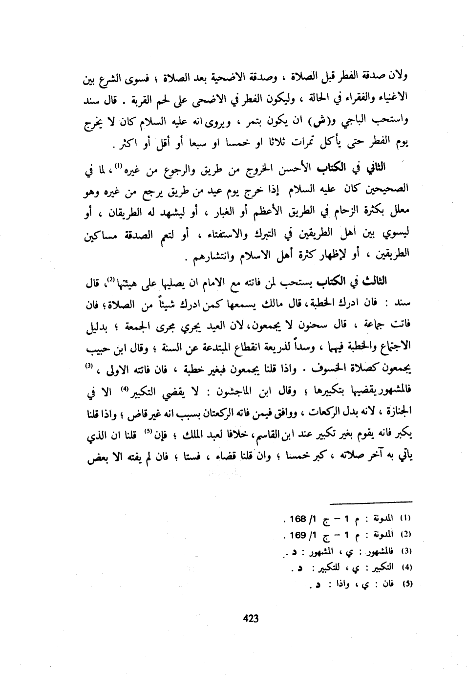 وَلِأَنَّ صَدَقَةَ الْفِطْرِ قَبْلَ الصَّلَاةِ وَصَدَقَةَ الْأُضْحِيَّةِ بَعْدَ الصَّلَاةِ فَسَوَّى الشَّرْعُ بَيْنَ الْأَغْنِيَاءِ وَالْفُقَرَاءِ فِي الْحَالَةِ وَلِيَكُونَ الْفِطَرُ فِي الْأَضْحَى عَلَى لَحْمِ الْقُرْبَةِ قَالَ سَنَدٌ وَاسْتَحَبَّ الْبَاجِيُّ وَ (ش) أَنْ يَكُونَ بِتَمْرٍ وَيُرْوَى أَنَّهُ عَلَيْهِ السَّلَامُ كَانَ لَا يَخْرُجُ يَوْمَ الْفِطْرِ حَتَّى يَأْكُلَ تَمَرَاتٍ ثَلَاثًا أَوْ خَمْسًا أَوْ سَبْعًا أَو أقل أَو أَكثر الثَّانِي فِي الْكِتَابِ الْأَحْسَنُ الْخُرُوجُ مِنْ طَرِيقٍ وَالرُّجُوعُ مِنْ غَيْرِهِ لِمَا فِي الصَّحِيحَيْنِ كَانَ عَلَيْهِ السَّلَامُ إِذَا خَرَجَ يَوْمَ عِيدٍ مِنْ طَرِيقٍ يَرْجِعُ مِنْ غَيْرِهِ وَهُوَ مُعَلَّلٌ بِكَثْرَةِ الزِّحَامِ فِي الطَّرِيقِ الْأَعْظَمِ أَوِ الْغُبَارِ أَوْ لِيَشْهَدَ لَهُ الطَّرِيقَانِ أَوْ لِيُسَوِّيَ بَيْنَ أَهْلِ الطَّرِيقَيْنِ فِي التَّبَرُّك والاستفتاء أَوْ لِتَعُمَّ الصَّدَقَةُ مَسَاكِينَ الطَّرِيقَيْنِ أَوْ لِإِظْهَارِ كَثْرَة أهل الْإِسْلَام وانتشارهم الثَّالِثُ فِي الْكِتَابِ يُسْتَحَبُّ لِمَنْ فَاتَتْهُ مَعَ الْإِمَامِ أَنْ يُصَلِّيَهَا عَلَى هَيْئَتِهَا قَالَ سَنَدٌ فَإِنْ أَدْرَكَ الْخُطْبَةَ قَالَ مَالِكٌ يَسْمَعُهَا كَمَنْ أَدْرَكَ شَيْئًا مِنَ الصَّلَاةِ فَإِنْ فَاتَتْ جَمَاعَةً قَالَ سَحْنُونٌ لَا يُجَمَّعُونَ لِأَنَّ الْعِيدَ يَجْرِي مَجْرَى الْجُمُعَةِ بِدَلِيلِ الِاجْتِمَاعِ وَالْخُطْبَةِ فِيهِمَا وَسَدًّا لِذَرِيعَةِ انْقِطَاعِ الْمُبْتَدِعَةِ عَنِ السُّنَّةِ وَقَالَ ابْنُ حَبِيبٍ يُجَمَّعُونَ كَصَلَاةِ الْخُسُوفِ وَإِذَا قُلْنَا يُجَمَّعُونَ فَبِغَيْرِ خُطْبَةٍ فَإِنْ فَاتَتْهُ الْأُولَى فَالْمَشْهُورُ يَقْضِيهَا بِتَكْبِيرِهَا وَقَالَ ابْنُ الْمَاجِشُونِ لَا يُقْضَى التَّكْبِيرُ إِلَّا فِي الْجِنَازَةِ لِأَنَّهُ بَدَلُ الرَّكَعَاتِ وَوَافَقَ فِيمَن فَاتَهُ الرَّكْعَتَانِ بِسَبَبٍ أَنَّهُ غَيْرُ قَاضٍ وَإِذَا قُلْنَا يُكَبِّرُ فَإِنَّهُ يَقُومُ بِغَيْرِ تَكْبِيرٍ عِنْدَ ابْنِ الْقَاسِم خلافًا لعبد الْملك فَإِن قُلْنَا إِنَّ الَّذِي يَأْتِي بِهِ آخِرُ صَلَاتِهِ كَبَّرَ خَمْسًا وَإِنْ قُلْنَا قَضَاءٌ فَسِتًّا فَإِنْ لَمْ يَفُتْهُ إِلَّا بَعْضُ