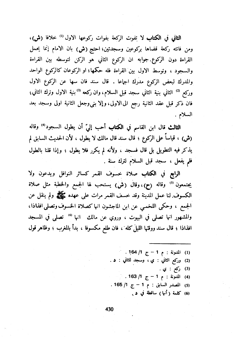 الثَّانِي فِي الْكِتَابِ لَا تَفُوتُ الرَّكْعَةُ بِفَوَاتِ ركوعها الأول خلافًا (ش) وَمَنْ فَاتَتْهُ رَكْعَةٌ قَضَاهَا بِرُكُوعَيْنِ وَسَجْدَتَيْنِ احْتَجَّ (ش) بِأَنَّ الْإِمَامَ إِنَّمَا يَحْمِلُ الْقِرَاءَةَ دُونَ الرُّكُوعِ جَوَابُهُ أَنَّ الرُّكُوعَ الثَّانِيَ هُوَ الرُّكْنُ لِتَوَسُّطِهِ بَيْنَ الْقِرَاءَةِ وَالسُّجُودِ وَتَوَسُّطِ الْأَوَّلِ بَيْنَ الْقِرَاءَةِ فَلَهُ حُكْمُهَا أَوِ الرُّكُوعَانِ كَالرُّكُوعِ الْوَاحِدِ وَالْمُدْرِكُ لِبَعْضِ الرُّكُوعِ مُدْرِكٌ إِجْمَاعًا قَالَ سَنَدٌ فَإِنْ سَهَا عَنِ الرُّكُوعِ الْأَوَّلِ وَرَكَعَ الثَّانِيَ بِنِيَّةِ الثَّانِي سَجَدَ قَبْلَ السَّلَامِ وَإِنْ رَكَعَهُ بِنِيَّةِ الْأَوَّلِ وَتَرَكَ الثَّانِيَ فَإِنْ ذَكَرَ قَبْلَ عَقْدِ الثَّانِيَةِ رَجَعَ إِلَى الْأُولَى وَإِلَّا بَنَى وَجَعَلَ الثَّانِيَةَ أُولَى وَسَجَدَ بَعْدَ السَّلَامِ الثَّالِثُ قَالَ ابْنُ الْقَاسِمِ فِي الْكِتَابِ أَحَبُّ إِلَيَّ أَنْ يَطُولَ السُّجُودُ وَقَالَهُ (ش) قِيَاسًا عَلَى الرُّكُوعِ قَالَ سَنَدٌ قَالَ مَالِكٌ لَا يَطُولُ لِأَنَّ الْحَدِيثَ السَّابِقَ لَمْ يُذْكَرْ فِيهِ التَّطْوِيلُ بَلْ قَالَ فَسَجَدَ وَلِأَنَّهُ لَمْ يُكَرَّرْ فَلَا يَطُولُ وَإِذَا قُلْنَا بِالطُّولِ فَلَمْ يَفْعَلْ سجد قبل السَّلَام لترك سنة الرَّابِعُ فِي الْكِتَابِ صَلَاةُ خُسُوفِ الْقَمَرِ كَسَائِرِ النَّوَافِلِ وَيُدْعَوْنَ وَلَا يَجْتَمِعُونَ وَقَالَهُ (ح) وَقَالَ (ش) يُسْتَحَبُّ لَهَا الْجَمْعُ وَالْخُطْبَةُ مِثْلَ صَلَاةِ الْكُسُوفِ لَنَا عَمَلُ الْمَدِينَةِ وَقَدْ خَسَفَ الْقَمَرُ مَرَّاتٍ عَلَى عَهْدِهِ - صَلَّى اللَّهُ عَلَيْهِ وَسَلَّم َ - وَلم ينْقل عَن الْجمع وَحكى اللَّخْمِيّ عَن ابْن الْمَاجشون انهاكصلاة الخسوف وَتُصَلَّى أَفْذَاذًا وَالْمَشْهُورُ أَنَّهَا تُصَلَّى فِي الْبُيُوتِ وَرُوِيَ عَنْ مَالِكٍ أَنَّهَا تُصَلَّى فِي الْمَسْجِدِ أَفْذَاذًا قَالَ سَنَدٌ وَوَقْتُهَا اللَّيْلُ كُلُّهُ فَإِنْ طلع مكسوفا بَدَأَ بِالْمَغْرِبِ وَظَاهِرُ قَوْلِ