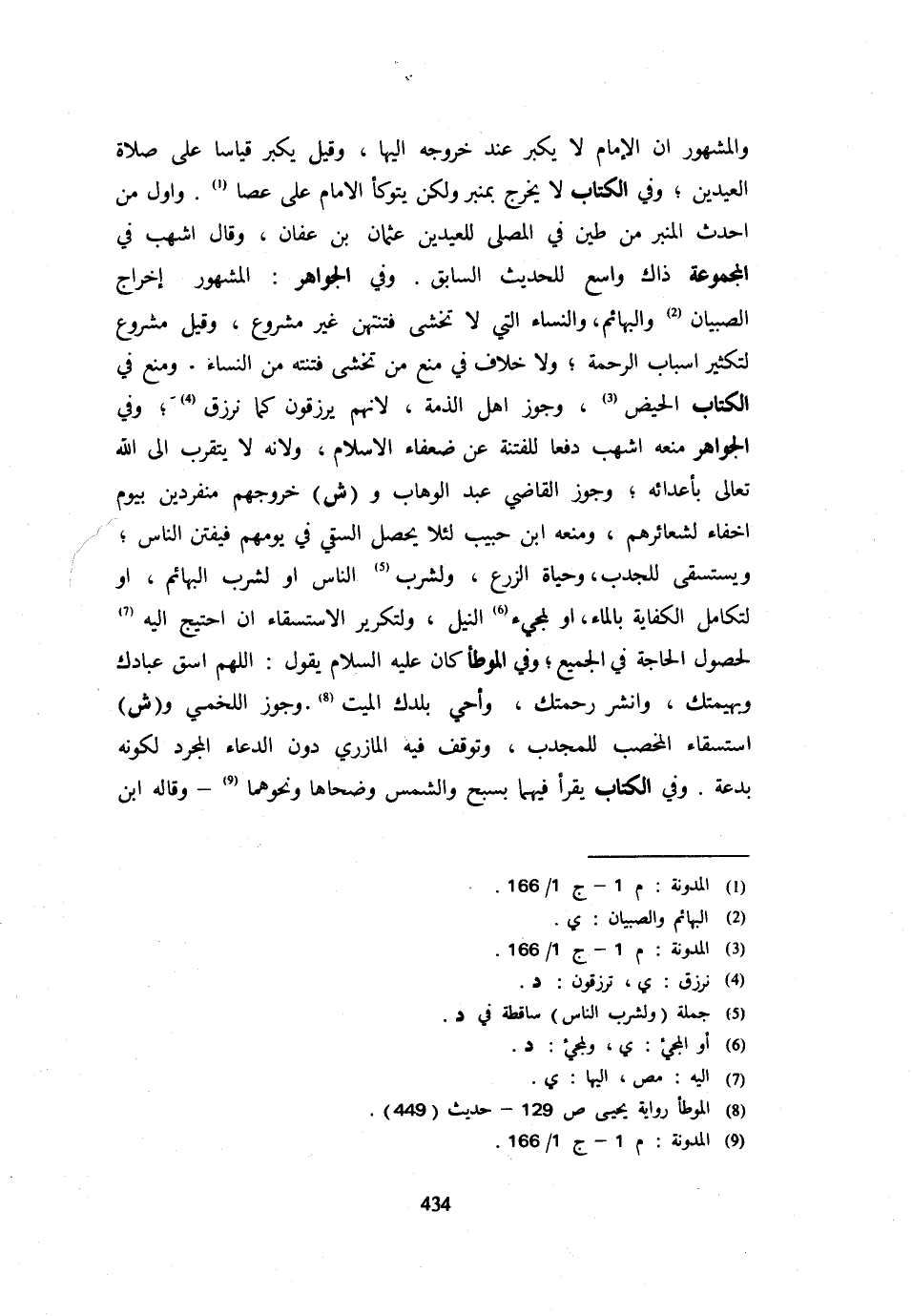 وَالْمَشْهُورُ أَنَّ الْإِمَامَ لَا يُكَبِّرُ عِنْدَ خُرُوجِهِ إِلَيْهَا وَقِيلَ يُكَبِّرُ قِيَاسًا عَلَى صَلَاةِ الْعِيدَيْنِ وَفِي الْكِتَابِ لَا يَخْرُجُ بِمِنْبَرٍ وَلَكِنْ يَتَوَكَّأُ الْإِمَامُ عَلَى عَصًا وَأَوَّلُ مَنْ أَحْدَثَ الْمِنْبَرَ مِنْ طِينٍ فِي الْمُصَلَّى لِلْعِيدَيْنِ عُثْمَانُ بْنُ عَفَّان وَقَالَ اشهب فِي الْمَجْمُوعَة ذَاك وَاسِعٌ لِلْحَدِيثِ السَّابِقِ وَفِي الْجَوَاهِرِ الْمَشْهُورُ إِخْرَاجُ الصّبيان والبهائم وَالنِّسَاء الَّتِي لَا تُخْشَى فِتْنَتُهُنَّ غَيْرُ مَشْرُوعٍ وَقِيلَ مَشْرُوعٌ لِتَكْثِيرِ أَسْبَابِ الرَّحْمَةِ وَلَا خِلَافَ فِي مَنْعِ مَنْ تُخْشَى فِتْنَتُهُ مِنَ النِّسَاءِ وَمَنَعَ فِي الْكِتَابِ الْحُيَّضَ وَجَوَّزَ أَهْلَ الذِّمَّةِ لِأَنَّهُمْ يُرْزَقُونَ كَمَا نُرْزَقُ وَفِي الْجَوَاهِرِ مَنَعَهُ أَشْهَبُ دَفْعًا لِلْفِتْنَةِ عَنْ ضُعَفَاءِ الْإِسْلَامِ وَلِأَنَّهُ لَا يُتَقَرَّبُ إِلَى اللَّهِ تَعَالَى بِأَعْدَائِهِ وَجَوَّزَ الْقَاضِي عَبْدُ الْوَهَّابِ وَ (ش) خُرُوجَهُمْ مُنْفَرِدِينَ بِيَوْمٍ إِخْفَاءً لِشَعَائِرِهِمْ وَمَنَعَهُ ابْنُ حَبِيبٍ لِئَلَّا يَحْصُلَ السَّقْيُ فِي يَوْمِهِمْ فَيُفْتَنَ النَّاسُ وَيُسْتَسْقَى لِلْجَدْبِ وَحَيَاةِ الزَّرْع ولشرب النَّاس اَوْ شرب الْبَهَائِم اَوْ لتكامل الْكِفَايَة بِالْمَاءِ اَوْ لمجئ النِّيلِ وَلِتَكْرِيرِ الِاسْتِسْقَاءِ إِنِ احْتِيجَ إِلَيْهِ لِحُصُولِ الْحَاجَةِ فِي الْجَمِيعِ وَفِي الْمُوَطَّأِ كَانَ عَلَيْهِ السَّلَام يَقُول اللَّهُمَّ اسْقِ عِبَادك وبهيمتك وانشر رحمتك وأحي بلدك الْمَيِّت وَجوز اللَّخْمِيّ وش اسْتِسْقَاءَ الْمُخْصِبِ لِلْمُجْدِبِ وَتَوَقَّفَ فِيهِ الْمَازِرِيُّ دُونَ الدُّعَاءِ الْمُجَرَّدِ لِكَوْنِهِ بِدْعَةً وَفِي الْكِتَابِ يَقْرَأُ فيهمَا بسبح وَالشَّمْس وَضُحَاهَا وَنَحْوهمَا وَقَالَهُ ابْن