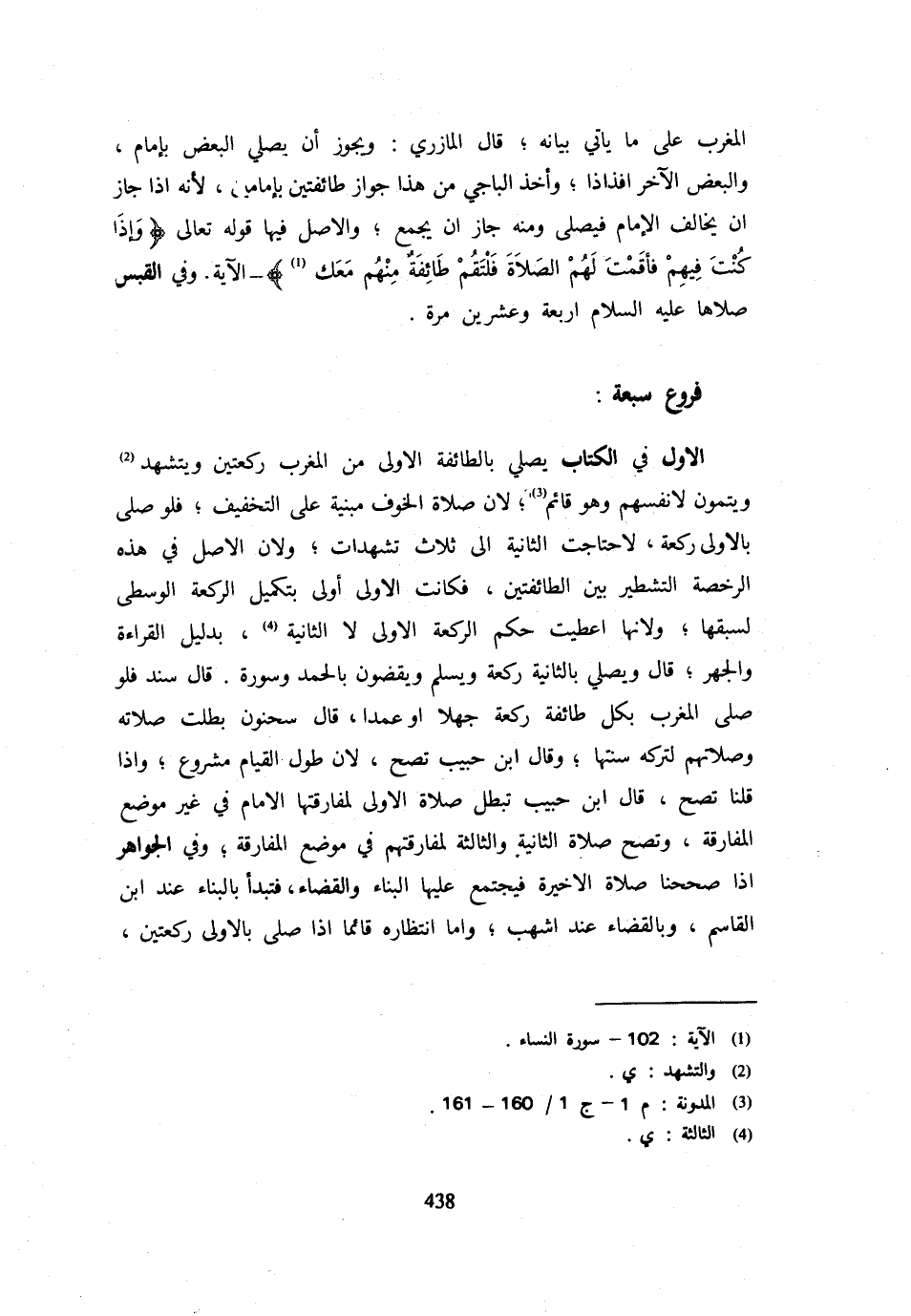 الْمَغْرِبِ عَلَى مَا يَأْتِي بَيَانُهُ قَالَ الْمَازِرِيُّ وَيَجُوزُ أَنْ يُصَلِّيَ الْبَعْضُ بِإِمَامٍ وَالْبَعْضُ الْآخَرُ أَفْذَاذًا وَأَخَذَ الْبَاجِيُّ مِنْ هَذَا جَوَازَ طَائِفَتَيْنِ بِإِمَامَيْنِ لِأَنَّهُ إِذَا جَازَ أَنْ يُخَالِفَ الْإِمَامُ فَيصَلي وَمِنْه جَازَ أَنْ يُجَمِّعَ وَالْأَصْلُ فِيهَا قَوْله تَعَالَى {وَإِذَا كُنْتَ فِيهِمْ فَأَقَمْتَ لَهُمُ الصَّلاةَ فَلْتَقُمْ طَائِفَة مِنْهُم مَعَك} الْآيَة وَفِي القبس صلاهَا عَلَيْهِ السَّلَام أَرْبَعَة وَعشْرين مرّة