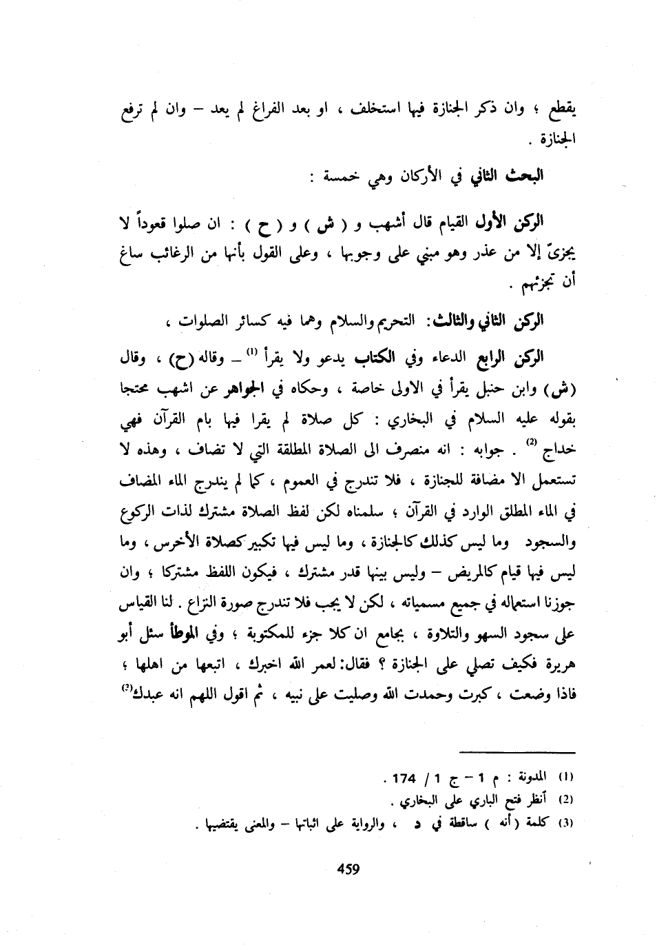كُلُّ صَلَاةٍ لَمْ يُقْرَأْ فِيهَا بِأُمِّ الْقُرْآنِ فَهِيَ خِدَاجٌ جَوَابُهُ أَنَّهُ مُنْصَرِفٌ إِلَى الصَّلَاة الْمُطلقَة الَّتِي لَا تُضَاف وَهَذِه لَا تُسْتَعْمَلُ إِلَّا مُضَافَةً لِلْجِنَازَةِ فَلَا تَنْدَرِجُ فِي الْعُمُومِ كَمَا لَمْ يَنْدَرِجِ الْمَاءُ الْمُضَافُ فِي الْمَاءِ الْمُطْلَقِ الْوَارِدِ فِي الْقُرْآنِ سَلَّمْنَاهُ لَكِنَّ لَفْظَ الصَّلَاةِ مُشْتَرَكٌ لِذَاتِ الرُّكُوعِ وَالسُّجُودِ وَمَا لَيْسَ كَذَلِكَ كَالْجِنَازَةِ وَمَا لَيْسَ فِيهَا تَكْبِيرٌ كَصَلَاةِ الْأَخْرَسِ وَمَا لَيْسَ فِيهَا قِيَامٌ كَالْمَرِيضِ وَلَيْسَ بَيْنَهَا قَدْرٌ مُشْتَرَكٌ فَيَكُونُ اللَّفْظُ مُشْتَرَكًا وَإِنْ جَوَّزْنَا اسْتِعْمَالَهُ فِي جَمِيعِ مُسَمَّيَاتِهِ لَكِنْ لَا يَجِبُ فَلَا تَنْدَرِجُ صُورَةُ النِّزَاعِ لَنَا الْقِيَاسُ عَلَى سُجُودِ السَّهْوِ وَالتِّلَاوَةِ بِجَامِعِ أَنَّ كُلًّا جُزْءٌ لِلْمَكْتُوبَةِ وَفِي الْمُوَطَّأِ سُئِلَ أَبُو هُرَيْرَة فَكيف تصلي على الْجِنَازَة فَقَالَ لَعَمْرُ اللَّهِ أُخْبِرُكَ أَتَّبِعُهَا مِنْ أَهْلِهَا فَإِذَا وُضِعَتْ كَبَّرْتُ وَحَمَدْتُ اللَّهَ وَصَلَّيْتُ عَلَى نَبِيِّهِ ثُمَّ أَقُولُ اللَّهُمَّ إِنَّهُ عَبْدُكَ
