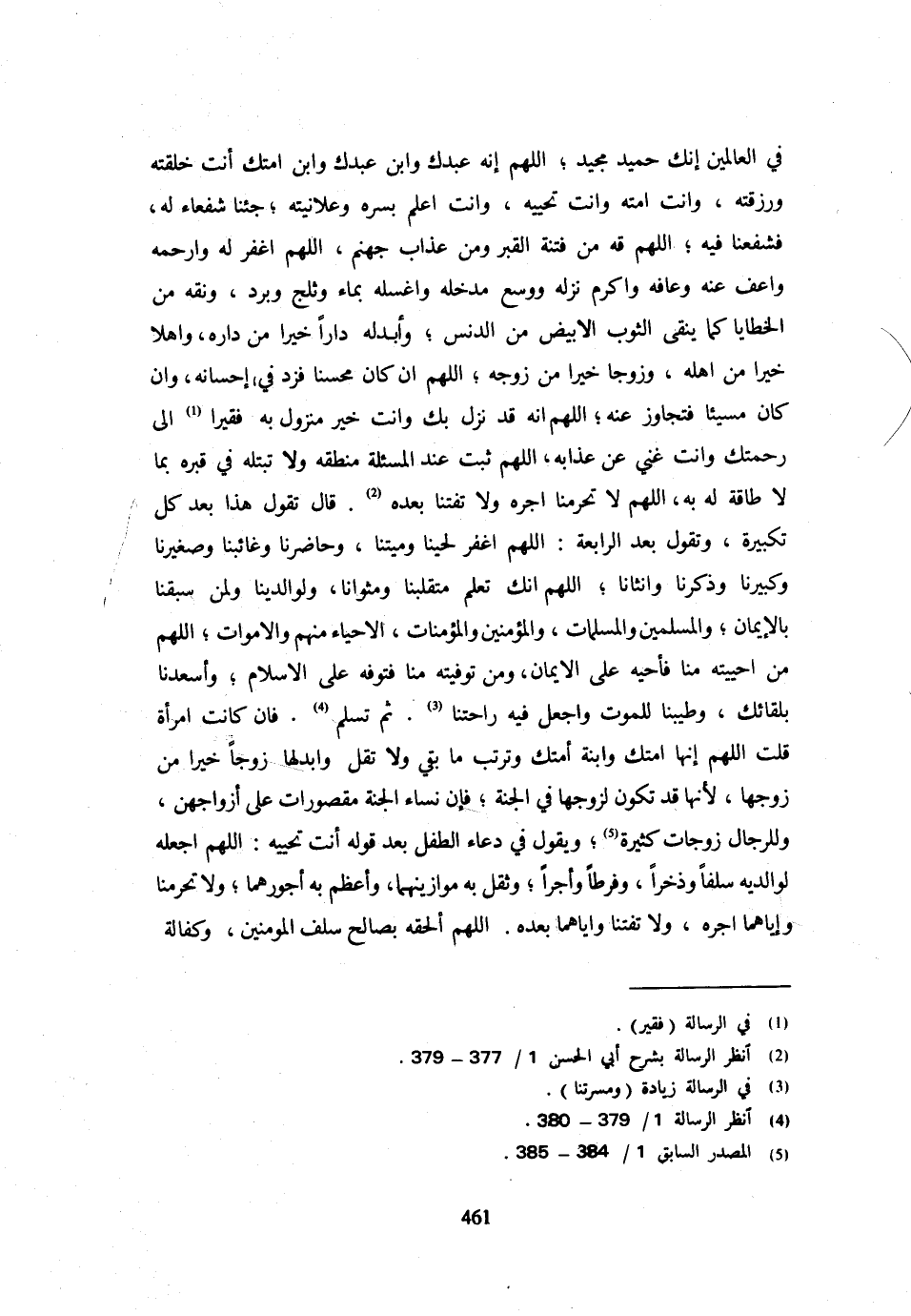فِي الْعَالَمِينَ إِنَّكَ حَمِيدٌ مَجِيدٌ اللَّهُمَّ إِنَّهُ عَبْدُكَ وَابْنُ عَبْدِكَ وَابْنُ أَمَتِكَ أَنْتَ خَلَقْتَهُ وَرَزَقْتَهُ وَأَنْتَ أَمَتَّهُ وَأَنْتَ تُحْيِيهِ وَأَنْتَ أَعْلَمُ بِسِرِّهِ وَعَلَانِيَتِهِ جِئْنَا شُفَعَاءَ لَهُ فَشَفِّعْنَا فِيهِ اللَّهُمَّ قِهِ مِنْ فِتْنَةِ الْقَبْرِ وَمِنْ عَذَابِ جَهَنَّمَ اللَّهُمَّ اغْفِرْ لَهُ وَارْحَمْهُ وَاعْفُ عَنْهُ وَعَافِهِ وَأَكْرِمْ نُزُلَهُ وَوَسِّعْ مُدْخَلَهُ وَاغْسِلْهُ بِمَاءٍ وَثَلْجٍ وَبَرَدٍ وَنَقِّهِ مِنَ الْخَطَايَا كَمَا يُنَقَّى الثَّوْبُ الْأَبْيَضُ مِنَ الدَّنَسِ وَأَبْدِلْهُ دَارًا خَيْرًا مِنْ دَارِهِ وَأَهْلًا خَيْرًا مِنْ أَهْلِهِ وَزَوْجًا خَيْرًا مِنْ زَوْجِهِ اللَّهُمَّ إِنْ كَانَ مُحْسِنًا فَزِدْ فِي إِحْسَانِهِ وَإِنْ كَانَ مُسِيئًا فَتَجَاوَزْ عَنْهُ اللَّهُمَّ إِنَّهُ قَدْ نَزَلَ بِكَ وَأَنْتَ خَيْرُ مَنْزُولٍ بِهِ فَقِيرًا إِلَى رَحْمَتِكَ وَأَنْتَ غَنِي عَن عَذَابه اللَّهُمَّ ثَبت عِنْد المسئلة مَنْطِقَهُ وَلَا تَبْتَلِهِ فِي قَبْرِهِ بِمَا لَا طَاقَةَ لَهُ بِهِ اللَّهُمَّ لَا تَحْرِمْنَا أَجْرَهُ وَلَا تَفْتِنَّا بَعْدَهُ قَالَ تَقُولُ هَذَا بَعْدَ كُلِّ تَكْبِيرَةٍ وَتَقُولُ بَعْدَ الرَّابِعَةِ اللَّهُمَّ اغْفِرْ لحينا وميتنا وحاضرنا وغائبنا وصغيرنا وكبيرنال وَذَكَرِنَا وَأُنْثَانَا اللَّهُمَّ إِنَّكَ تَعْلَمُ مُتَقَلَّبَنَا وَمَثْوَانَا وَلِوَالِدِينَا وَلِمَنْ سَبَقَنَا بِالْإِيمَانِ وَالْمُسْلِمِينَ وَالْمُسْلِمَاتِ وَالْمُؤْمِنِينَ وَالْمُؤْمِنَاتِ الْأَحْيَاءِ مِنْهُمْ وَالْأَمْوَاتِ اللَّهُمَّ مَنْ أَحْيَيْتَهُ مِنَّا فَأَحْيِهِ عَلَى الْإِيمَانِ وَمَنْ تَوَفَّيْتَهُ مِنَّا فَتَوَفَّهُ عَلَى الْإِسْلَامِ وَأَسْعِدْنَا بِلِقَائِكَ وَطَيِّبْنَا لِلْمَوْتِ وَاجْعَلْ فِيهِ رَاحَتَنَا ثُمَّ تُسَلِّمُ فَإِنْ كَانَتِ امْرَأَةً قُلْتَ اللَّهُمَّ إِنَّهَا أَمَتُكَ وَابْنَةُ أَمَتِكَ وَتُرَتِّبُ مَا بَقِيَ وَلَا تَقُلْ وَأَبْدِلْهَا زَوْجًا خَيْرًا مِنْ زَوْجِهَا لِأَنَّهَا قَدْ تَكُونُ لِزَوْجِهَا فِي الْجَنَّةِ فَإِنَّ نِسَاءَ الْجَنَّةِ مَقْصُورَاتٌ عَلَى أَزْوَاجِهِنَّ وَلِلرِّجَالِ زَوْجَاتٌ كَثِيرَةٌ وَيَقُولُ فِي دُعَاءِ الطِّفْلِ بَعْدَ قَوْلِهِ أَنْتَ تُحْيِيهِ اللَّهُمَّ اجْعَلْهُ لِوَالِدَيْهِ سَلَفًا وَذُخْرًا وَفَرَطًا وَأَجْرًا وَثَقِّلْ بِهِ مَوَازِينَهُمَا وَأَعْظِمْ بِهِ أُجُورَهُمَا وَلَا تَحْرِمْنَا وَإِيَّاهُمَا أَجْرَهُ وَلَا تَفْتِنَّا وَإِيَّاهُمَا بَعْدَهُ اللَّهُمَّ أَلْحِقْهُ بِصَالِحِ سَلَفِ الْمُؤْمِنِينَ وَكَفَالَةِ