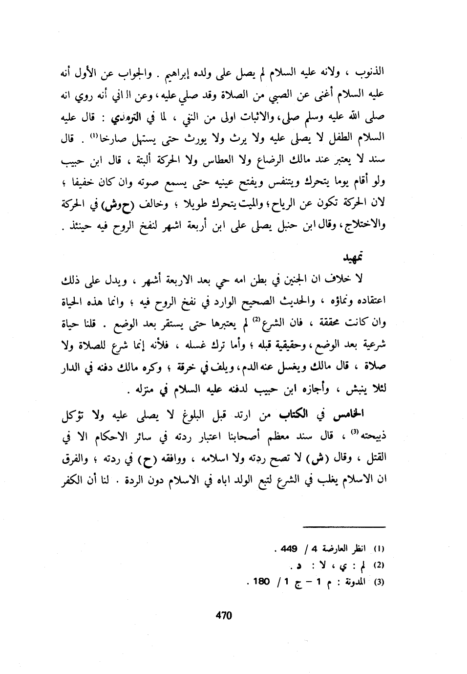 تَمْهِيدٌ لَا خِلَافَ أَنَّ الْجَنِينَ فِي بَطْنِ أُمِّهِ حَيٌّ بَعْدَ الأَرْبَعَةِ أَشْهُر وَيَدُلُّ على ذَلِك اعْتِقَاده وَنَمَاؤُهُ وَالْحَدِيثُ الصَّحِيحُ الْوَارِدُ فِي نَفْخِ الرُّوحِ فِيهِ وَإِنَّمَا هَذِهِ الْحَيَاةُ وَإِنْ كَانَتْ مُحَقَّقَةً فَإِن الشَّرْع لم يَعْتَبِرْهَا حَتَّى يَسْتَقِرَّ بَعْدُ الْوَضْعُ قُلْنَا حَيَاةٌ شَرْعِيَّةٌ بَعْدَ الْوَضْعِ وَحَقِيقِيَّةٌ قَبْلَهُ وَأَمَّا تَرْكُ غُسْلِهِ فَلِأَنَّهُ إِنَّمَا شُرِعَ لِلصَّلَاةِ وَلَا صَلَاةَ قَالَ مَالك وَيغسل عِنْد الدَّمِ وَيُلَفُّ فِي خِرْقَةٍ وَكَرِهَ مَالِكٌ دَفْنَهُ فِي الدَّارِ لِئَلَّا يُنْبَشَ وَأَجَازَهُ ابْنُ حَبِيبٍ لدفنه عَلَيْهِ السَّلَام فِي منزله الْخَامِسُ فِي الْكِتَابِ مَنِ ارْتَدَّ قَبْلَ الْبُلُوغِ لَا يُصَلَّى عَلَيْهِ وَلَا تُؤْكَلُ ذَبِيحَتُهُ قَالَ سَنَد مُعظم أَصْحَابنَا اعْتِبَار ردته فِي سَائِر الْأَحْكَام إِلَّا فِي الْقَتْلَ وَقَالَ (ش) لَا تَصِحُّ رِدَّتُهُ وَلَا إِسْلَامُهُ وَوَافَقَهُ (ح) فِي رِدَّتِهِ وَالْفَرْقُ أَنَّ الْإِسْلَامَ يُغَلَّبُ فِي الشَّرْعِ لِتَبَعِ الْوَلَدِ أَبَاهُ فِي الْإِسْلَامِ دُونَ الرِّدَّةِ لَنَا أَنَّ الْكُفْرَ
