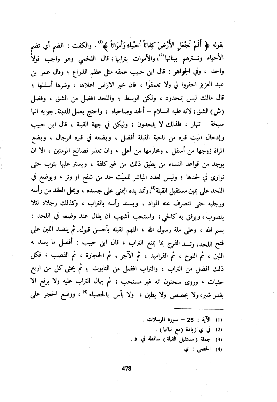 بقوله {ألم نجْعَل الأَرْض كفاتا أَحيَاء وأمواتا} والكفت الضَّم أَي تضم الْأَحْيَاء وتسترهم ببنائها وَالْأَمْوَاتَ بِتُرَابِهَا قَالَ اللَّخْمِيُّ وَهُوَ وَاجِبٌ قَوْلًا وَاحِدًا وَفِي الْجَوَاهِرِ قَالَ ابْنُ حَبِيبٍ عُمْقُهُ مِثْلُ عَظْمِ الذِّرَاعِ وَقَالَ عُمَرُ بْنُ عَبْدِ الْعَزِيزِ احْفِرُوا لِي وَلَا تُعَمِّقُوا فَإِنَّ خَيْرَ الْأَرْضِ أَعْلَاهَا وَشَرَّهَا أَسْفَلُهَا قَالَ مَالِكٌ لَيْسَ بِمَحْدُودٍ وَلَكِنِ الْوَسَطُ وَاللَّحْدُ أَفْضَلُ مِنَ الشَّقِّ وَفَضَّلَ (ش) الشَّقَّ لِأَنَّهُ عَلَيْهِ السَّلَامُ أُلْحِدَ وَصَاحِبَاهُ وَاحْتَجَّ بِعَمَلِ الْمَدِينَةِ جَوَابُهُ أَنَّهَا سَبَخَةٌ تَنْهَارُ فَلِذَلِكَ لَا يُلْحِدُونَ وَلْيَكُنْ فِي جِهَةِ الْقِبْلَةِ قَالَ ابْنُ حَبِيبٍ وَإِدْخَالُ الْمَيِّتِ قَبْرَهُ مِنْ نَاحِيَةِ الْقِبْلَةِ أَفْضَلُ وَيَضَعُهُ فِي قَبْرِهِ الرِّجَالُ وَيَضَعُ الْمَرْأَةَ زَوْجُهَا مِنْ أَسْفَلَ وَمَحَارِمُهَا مِنْ أَعْلَى وَإِنْ تَعَذَّرَ فَصَالِحُ الْمُؤْمِنِينَ إِلَّا أَنْ يُوجَدَ مِنْ قَوَاعِدِ النِّسَاءِ مَنْ يُطِيقُ ذَلِكَ مِنْ غَيْرِ كُلْفَةٍ وَيُسْتَرُ عَلَيْهَا بِثَوْبٍ حَتَّى تُوَارَى فِي لَحْدِهَا وَلَيْسَ لِعَدَدِ الْمُبَاشِرِ لِلْمَيِّتِ حَدٌّ مِنْ شَفْعٍ أَوْ وِتْرٍ وَيُوضَعُ فِي اللَّحْد على يَمِين مُسْتَقْبل الْقِبْلَةِ وَتُمَدُّ يَدُهُ الْيُمْنَى عَلَى جَسَدِهِ وَيُحَلُّ الْعَقْدُ مِنْ رَأْسِهِ وَرِجْلَيْهِ حَتَّى تَنْصَرِفَ عَنْهُ الْمَوَادُّ وَيُسْنَدُ رَأْسُهُ بِالتُّرَابِ وَكَذَلِكَ رِجْلَاهُ لِئَلَّا يَتَصَوَّبَ وَيُرْفَقُ بِهِ كَالْحَيِّ وَاسْتَحَبَّ أَشْهَبُ أَنْ يُقَالَ عِنْدَ وَضْعِهِ فِي اللَّحْدِ بِسْمِ اللَّهِ وَعَلَى مِلَّةِ رَسُولِ اللَّهِ اللَّهُمَّ تَقَبَّلْهُ بِأَحْسَنِ قَبُولٍ ثُمَّ يُنَضَّدُ اللَّبَنَ عَلَى فَتْحِ اللَّحْدِ وَتُسَدُّ الْفُرَجُ بِمَا يَمْنَعُ التُّرَابَ قَالَ ابْنُ حَبِيبٍ أَفْضَلُ مَا يُسَدُّ بِهِ اللَّبِنُ ثُمَّ اللَّوْحُ ثُمَّ الْقَرَامِيدُ ثُمَّ الْآجُرُّ ثُمَّ الْحِجَارَةُ ثُمَّ الْقَصَبُ فَكُلُّ ذَلِكَ أَفْضَلُ مِنَ التُّرَابِ وَالتُّرَابُ أَفْضَلُ مِنَ التَّابُوتِ ثُمَّ يُحْثَى كُلُّ من أَرْبَعَ حَثَيَاتٍ وَرَوَى سَحْنُونٌ أَنَّهُ غَيْرُ مُسْتَحَبٍّ ثُمَّ يُهَالُ التُّرَابُ عَلَيْهِ وَلَا يُرْفَعُ إِلَّا بِقَدْرِ شِبْرٍ وَلَا يُجَصَّصُ وَلَا يُطَيَّنُ وَلَا بَأْسَ بِالْحَصْبَاءِ وَوَضْعِ الْحَجْرِ عَلَى