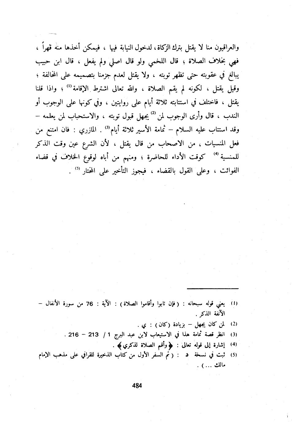 وَالْعِرَاقِيُّونَ مِنَّا لَا يُقْتَلُ بِتَرْكِ الزَّكَاةِ لِدُخُولِ النِّيَابَةِ فِيهَا فَيُمْكِنُ أَخْذُهَا مِنْهُ قَهْرًا فَهِيَ بِخِلَافِ الصَّلَاةِ قَالَ اللَّخْمِيُّ وَلَوْ قَالَ أُصَلِّي وَلَمْ يَفْعَلْ قَالَ ابْنُ حَبِيبٍ يُبَالَغُ فِي عُقُوبَتِهِ حَتَّى تَظْهَرَ تَوْبَتُهُ وَلَا يُقْتَلُ لِعَدَمِ جَزْمِنَا بِتَصْمِيمِهِ عَلَى الْمُخَالَفَةِ وَقِيلَ يُقْتَلُ لِكَوْنِهِ لَمْ يُقِمِ الصَّلَاةَ وَاللَّهُ تَعَالَى اشْتَرَطَ الْإِقَامَةَ وَإِذَا قُلْنَا يُقْتَلُ فَاخْتُلِفَ فِي اسْتِتَابَتِهِ ثَلَاثَةَ أَيَّامٍ عَلَى رِوَايَتَيْنِ وَفِي كَوْنِهَا عَلَى الْوُجُوبِ أَوِ النَّدْبِ قَالَ وَأَرَى الْوُجُوبَ لِمَنْ يَجْهَلُ قَبُولَ تَوْبَتِهِ وَالِاسْتِحْبَابَ لِمَنْ يَعْلَمُهُ وَقَدِ اسْتَتَابَ عَلَيْهِ السَّلَام ثُمَامَة الْأَسير ثَلَاثَة أَيَّام الْمَازرِيّ فَإِن امْتنع من فعل المنسيات من الْأَصْحَابِ مَنْ قَالَ يُقْتَلُ لِأَنَّ الشَّرْعَ عَيَّنَ وَقْتَ الذِّكْرِ لِلْمَنْسِيَّةِ كَوَقْتِ الْأَدَاءِ لِلْحَاضِرَةِ وَمِنْهُمْ مَنْ أَبَاهُ لِوُقُوعِ الْخِلَافِ فِي قَضَاءِ الْفَوَائِتِ وَعَلَى الْقَوْلِ بِالْقَضَاءِ فَيَجُوزُ التَّأْخِيرُ عَلَى الْمُخْتَارِ