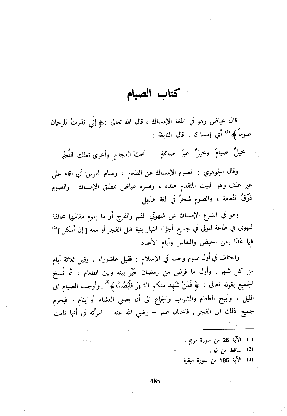 قَالَ عِيَاضٌ وَهُوَ فِي اللُّغَةِ الْإِمْسَاك قَالَ الله تَعَالَى {إِنِّي نذرت للرحمان صوما} أَيْ إِمْسَاكًا قَالَ النَّابِغَةُ