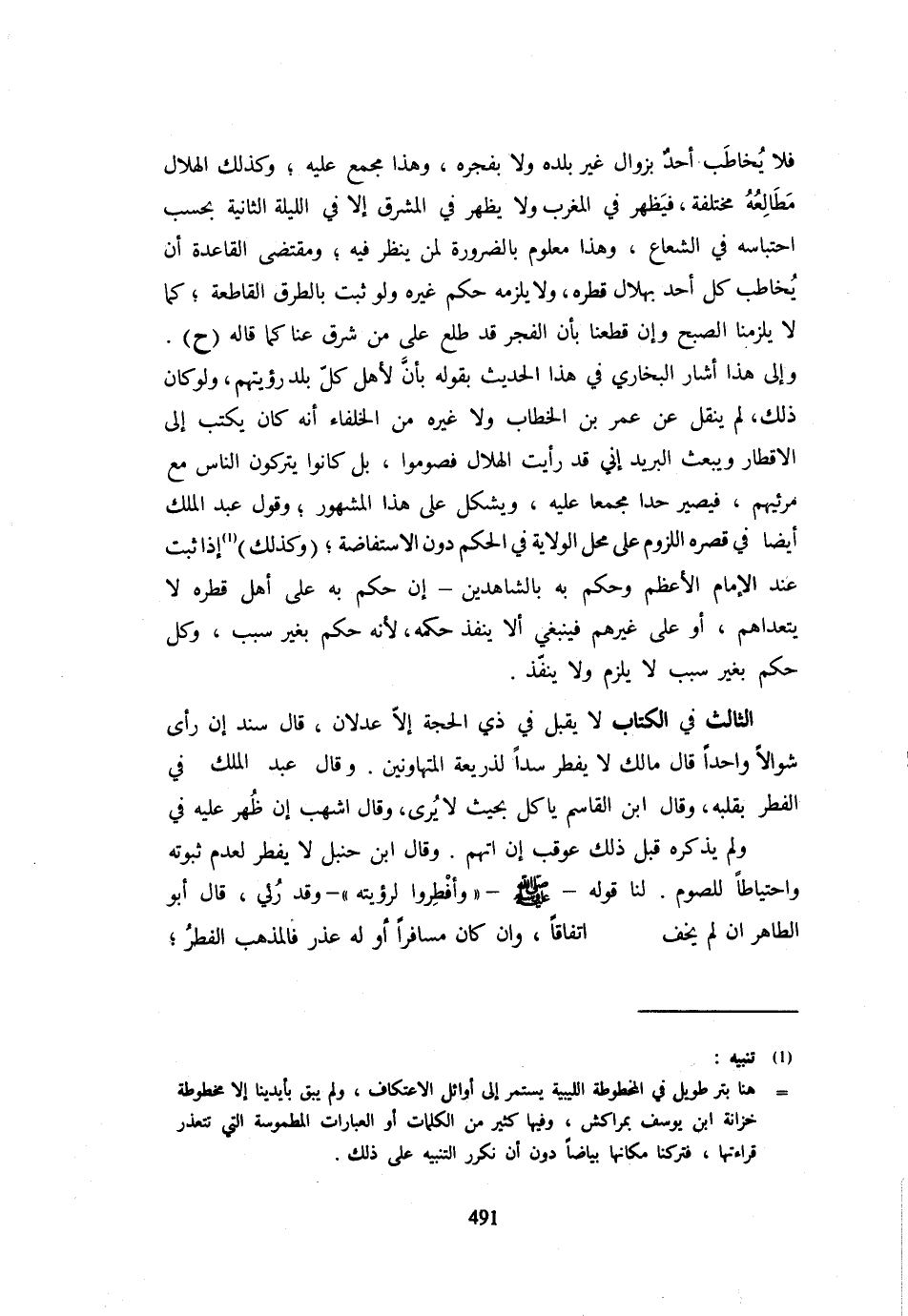 فَلَا يُخَاطَبُ أَحَدٌ بِزَوَالِ غَيْرِ بَلَدِهِ وَلَا يفجره وَهَذَا مُجْمَعٌ عَلَيْهِ وَكَذَلِكَ الْهِلَالُ مَطَالِعُهُ مُخْتَلِفَةٌ فَيَظْهَرُ فِي الْمَغْرِبِ وَلَا يَظْهَرُ فِي الْمَشْرِقِ إِلَّا فِي اللَّيْلَةِ الثَّانِيَةِ بِحَسَبِ احْتِبَاسِهِ فِي الشُّعَاعِ وَهَذَا مَعْلُومٌ بِالضَّرُورَةِ لِمَنْ يَنْظُرُ فِيهِ وَمُقْتَضَى الْقَاعِدَةِ أَنْ يُخَاطَبَ كُلُّ أَحَدٍ بِهِلَالِ قُطْرِهِ وَلَا يَلْزَمُهُ حُكْمُ غَيْرِهِ وَلَوْ ثَبَتَ بِالطُّرُقِ الْقَاطِعَةِ كَمَا لَا يَلْزَمُنَا الصُّبْحُ وَإِنْ قَطَعْنَا بِأَنَّ الْفَجْرَ قَدْ طَلَعَ عَلَى مَنْ شَرق عَنَّا كَمَا قَالَه (ح) , إِلَى هَذَا أَشَارَ الْبُخَارِيُّ فِي هَذَا الْحَدِيثِ بِقَوْلِهِ بِأَنَّ لِأَهْلِ كُلِّ بَلَدٍ رُؤْيَتَهُمْ وَلَوْ كَانَ ذَلِكَ لَمْ يُنْقَلْ عَنْ عُمَرَ بْنِ الْخَطَّابِ وَلَا غَيْرِهِ مِنَ الْخُلَفَاءِ أَنَّهُ كَانَ يَكْتُبُ إِلَى الْأَقْطَارِ وَيَبْعَثُ الْبَرِيدَ إِنِّي قَدْ رَأَيْتُ الْهِلَالَ فَصُومُوا بَلْ كَانُوا يَتْرُكُونَ النَّاسَ مَعَ مَرْئِيِّهِمْ فَيَصِيرُ حَدًّا مُجْمَعًا عَلَيْهِ وَيُشْكِلُ عَلَى هَذَا الْمَشْهُورُ وَقَوْلُ عَبْدِ الْمَلِكِ أَيْضًا فِي قَصْرِهِ اللُّزُومُ عَلَى مَحَلِّ الْوِلَايَةِ فِي الْحُكْمِ دُونَ الِاسْتِفَاضَةِ وَكَذَلِكَ إِذَا ثَبَتَ عِنْدَ الْإِمَامِ الْأَعْظَمِ وَحُكِمَ بِهِ بِالشَّاهِدَيْنِ إِنْ حُكِمَ بِهِ عَلَى أَهْلِ قُطْرِهِ لَا يَتَعَدَّاهُمْ أَوْ عَلَى غَيْرِهِمْ فَيَنْبَغِي أَلَّا يُنَفَّذَ حُكْمُهُ لِأَنَّهُ حُكْمٌ بِغَيْرِ سَبَبٍ وَكُلُّ حُكْمٍ بِغَيْرِ سَبَبٍ لَا يَلْزَمُ وَلَا يُنَفَّذُ الثَّالِثُ فِي الْكِتَابِ لَا يُقْبَلُ فِي ذِي الْحِجَّةِ إِلَّا عَدْلَانِ قَالَ سَنَد إِن رأى شوالا وَاحِدًا قَالَ مَالِكٌ لَا يُفْطَرُ سَدًّا لِذَرِيعَةِ الْمُتَهَاوِنِينَ وَقَالَ عبد الْملك فِي الْفطر بِقَلْبِه وَقَالَ ابْنُ الْقَاسِمِ يَأْكُلُ بِحَيْثُ لَا يُرَى وَقَالَ أَشْهَبُ إِنْ ظُهِرَ عَلَيْهِ فِي وَلَمْ يَذْكُرْهُ قَبْلَ ذَلِكَ عُوقِبَ إِنِ اتُّهِمَ وَقَالَ ابْن جنبل لَا يُفْطِرُ لِعَدَمِ ثُبُوتِهِ وَاحْتِيَاطًا لِلصَّوْمِ لَنَا قَوْله - صَلَّى اللَّهُ عَلَيْهِ وَسَلَّم َ -