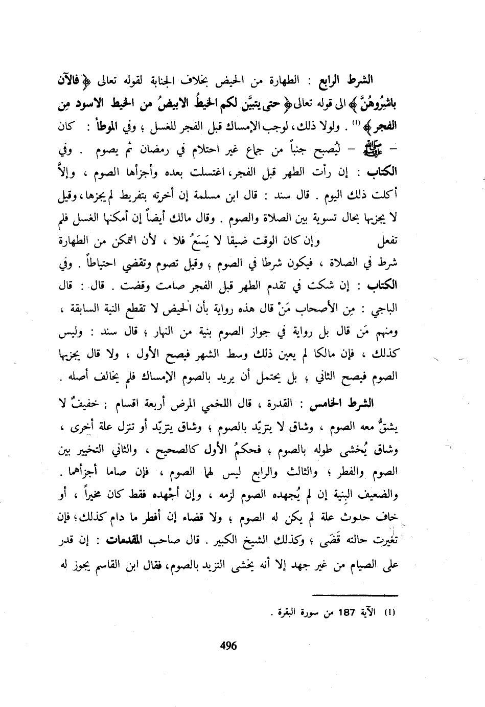 الشَّرْطُ الرَّابِعُ الطَّهَارَةُ مِنَ الْحَيْضِ بِخِلَافِ الْجَنَابَةِ لقَوْله تَعَالَى {فَالْآن باشروهن} إِلَى قَوْله تَعَالَى {حَتَّى يَتَبَيَّنَ لَكُمُ الْخَيْطُ الْأَبْيَض من الْخَيط الْأسود من الْفجْر} وَلَوْلَا ذَلِكَ لَوَجَبَ الْإِمْسَاكُ قَبْلَ الْفَجْرِ لِلْغُسْلِ وَفِي الْمُوَطَّأِ كَانَ - صَلَّى اللَّهُ عَلَيْهِ وَسَلَّم َ - لَيُصْبِحُ جُنُبًا مِنْ جِمَاعٍ غَيْرِ احْتِلَامٍ فِي رَمَضَانَ ثُمَّ يَصُومُ وَفِي الْكِتَابِ إِنْ رَأَتِ الطُّهْرَ قَبْلَ الْفَجْرِ اغْتَسَلَتْ بَعْدَهُ وَأَجْزَأَهَا الصَّوْمُ وَإِلَّا أَكَلَتْ ذَلِكَ الْيَوْمَ قَالَ سَنَدٌ قَالَ ابْنُ مَسْلَمَةَ إِنْ أَخَّرَتْهُ بِتَفْرِيطٍ لَمْ يُجْزِهَا وَقِيلَ لَا يُجْزِيهَا بِحَالٍ تَسْوِيَةً بَيْنَ الصَّلَاةِ وَالصَّوْمِ وَقَالَ مَالِكٌ أَيْضًا إِنْ أَمْكَنَهَا الْغُسْلُ فَلم تفعل وَإِن كَانَ الْوَقْتُ ضَيِّقًا لَا يَسَعُ فَلَا لِأَنَّ التَّمَكُّنَ مِنَ الطِّهَارَةِ شَرْطٌ فِي الصَّلَاةِ فَيَكُونُ شَرْطًا فِي الصَّوْمِ وَقِيلَ تَصُومُ وَتَقْضِي احْتِيَاطًا وَفِي الْكِتَابِ إِنْ شَكَّتْ فِي تَقَدُّمِ الطُّهْرِ قَبْلَ الْفَجْرِ صَامَتْ وَقَضَتْ قَالَ قَالَ الْبَاجِيُّ من الْأَصْحَابِ مَنْ قَالَ هَذِهِ رِوَايَةٌ بِأَنَّ الْحُيَّضَ لَا تَقْطَعُ النِّيَّةَ السَّابِقَةَ وَمِنْهُمْ مَنْ قَالَ بَلْ رِوَايَةٌ فِي جَوَازِ الصَّوْمِ بِنِيَّةٍ مِنَ النَّهَارِ قَالَ سَنَدٌ وَلَيْسَ كَذَلِكَ فَإِنَّ مَالِكًا لَمْ يُعَيِّنْ ذَلِكَ وَسَطَ الشَّهْرِ فَيَصِحُّ الْأَوَّلُ وَلَا قَالَ يُجْزِيهَا الصَّوْمُ فَيَصِحُّ الثَّانِي بَلْ يُحْتَمَلُ أَنْ يُرِيدَ بِالصَّوْمِ الْإِمْسَاكَ فَلَمْ يُخَالِفْ أَصْلَهُ الشَّرْطُ الْخَامِسُ الْقُدْرَةُ قَالَ اللَّخْمِيُّ الْمَرَضُ أَرْبَعَةُ أَقْسَامٍ خَفِيفٌ لَا يَشُقُّ مَعَهُ الصَّوْمُ وَشَاقٌّ لَا يَتَزَيَّدُ بِالصَّوْمِ وَشَاقٌّ يَتَزَيَّدُ أَوْ تَنْزِلُ عِلَّةٌ أُخْرَى وَشَاقٌّ يُخْشَى طُولُهُ بِالصَّوْمِ فَحُكْمُ الْأَوَّلِ كَالصَّحِيحِ وَالثَّانِي التَّخْيِيرُ بَيْنَ الصَّوْمِ وَالْفِطْرِ وَالثَّالِثُ وَالرَّابِعُ لَيْسَ لَهُمَا الصَّوْمُ فَإِنْ صَامَا أَجْزَأَهُمَا وَالضَّعِيفُ الْبِنْيَةِ إِنْ لَمْ يُجْهِدْهُ الصَّوْمُ لَزِمَهُ وَإِنْ أَجْهَدَهُ فَقَطْ كَانَ مُخَيَّرًا أَوْ خَافَ حُدُوثَ عِلَّةٍ لَمْ يَكُنْ لَهُ الصَّوْمُ وَلَا قَضَاءَ إِنْ أَفْطَرَ مَا دَامَ كَذَلِكَ فَإِنْ تَغَيَّرَتْ حَالَتُهُ قَضَى وَكَذَلِكَ الشَّيْخُ الْكَبِيرُ قَالَ صَاحِبُ الْمُقَدِّمَاتِ إِنْ قَدَرَ عَلَى الصِّيَامِ مِنْ غَيْرِ جُهْدٍ إِلَّا أَنَّهُ يَخْشَى التَّزَيُّدَ بِالصَّوْمِ فَقَالَ ابْنُ الْقَاسِمِ يَجُوزُ لَهُ