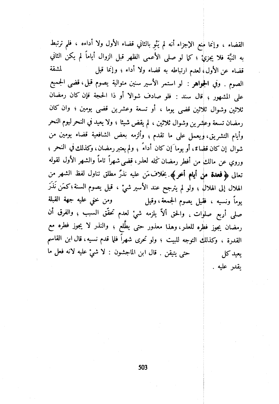 الْقَضَاءِ وَإِنَّمَا مَنَعَ الْإِجْزَاءَ أَنَّهُ لَمْ يَنْوِ بِالثَّانِي قَضَاءَ الْأَوَّلِ وَلَا أَدَاءَهُ فَلَمْ تَرْتَبِطْ بِهِ النِّيَّة فَلَا يجزيء كَمَا لَوْ صَلَّى الْأَعْمَى الظُّهْرَ قَبْلَ الزَّوَالِ أَيَّامًا لَمْ يَكُنِ الثَّانِي قَضَاءً عَنِ الْأَوَّلِ لِعَدَمِ ارْتِبَاطِهِ بِهِ قَضَاءً وَلَا أَدَاءً وَإِنَّمَا قِيلَ لِمَشَقَّةِ الصَّوْمِ وَفِي الْجَوَاهِرِ لَوِ اسْتَمَرَّ الْأَسِيرُ سِنِينَ مُتَوَالِيَةً يَصُومُ قَبْلُ قَضَى الْجَمِيعَ عَلَى الْمَشْهُورِ قَالَ سَنَدٌ فَلَوْ صَادَفَ شَوَّالًا أَوْ ذَا الْحِجَّةِ فَإِنْ كَانَ رَمَضَانُ ثَلَاثِينَ وَشَوَّالٌ ثَلَاثِينَ قَضَى يَوْمًا أَوْ تِسْعَةً وَعِشْرِينَ قَضَى يَوْمَيْنِ وَإِنْ كَانَ رَمَضَانُ تِسْعَةً وَعِشْرِينَ وَشَوَّالٌ ثَلَاثِينَ لَمْ يَقْضِ شَيْئًا وَلَا يُعِيدُ فِي النَّحْرِ لِيَوْمِ النَّحْرِ وَأَيَّامِ التَّشْرِيقِ وَيَعْمَلُ عَلَى مَا تَقَدَّمَ وَأَلْزَمَهُ بَعْضُ الشَّافِعِيَّةِ قَضَاءَ يَوْمَيْنِ مِنْ شَوَّالٍ إِنْ كَانَ قَضَاءً أَوْ يَوْمًا إِنْ كَانَ أَدَاءً وَلَمْ يَعْتَبِرْ رَمَضَانَ وَكَذَلِكَ فِي النَّحْرِ وَرُوِيَ عَنْ مَالِكٍ مَنْ أَفْطَرَ رَمَضَانَ كُلَّهُ لِعُذْرٍ قَضَى شَهْرًا تَامًّا وَالشَّهْرُ الْأَوَّلُ لِقَوْلِهِ تَعَالَى {فَعِدَّةٌ مِنْ أَيَّامٍ أخر} بِخِلَافِ مَنْ عَلَيْهِ نَذْرٌ مُطْلَقٌ تَنَاوَلَ لَفْظَ الشَّهْرِ مِنَ الْهِلَالِ إِلَى الْهِلَالِ وَلَوْ لَمْ يَتَرَجَّحْ عِنْدَ الْأَسِيرِ شَيْءٌ قِيلَ يَصُومُ السَّنَةَ كمن نذر يَوْمًا ونسيه فَقيل يَصُومُ الْجُمُعَةَ وَقِيلَ وَمَنْ خَفِيَ عَلَيْهِ جِهَةُ الْقِبْلَةِ صَلَّى أَرْبَعَ صَلَوَاتٍ وَالْحَقُّ أَلَّا يَلْزَمَهُ شَيْءٌ لِعَدَمِ تَحَقُّقِ السَّبَبِ وَالْفَرْقُ أَنَّ رَمَضَانَ يَجُوزُ فِطْرُهُ لِلْعُذْرِ وَهَذَا مَعْذُورٌ حَتَّى يَطَّلِعَ وَالنَّذْرُ لَا يَجُوزُ فِطْرُهُ مَعَ الْقُدْرَةِ وَكَذَلِكَ التَّوَجُّهُ لِلْبَيْتِ وَلَوْ تَحَرَّى شَهْرًا فَلَمَّا قَدِمَ نَسِيَهُ قَالَ ابْنُ الْقَاسِمِ يُعِيدُ كُلَّ حَتَّى يَتَيَقَّنَ قَالَ ابْنُ الْمَاجِشُونِ لَا شَيْءَ عَلَيْهِ لِأَنَّهُ فَعَلَ مَا يَقْدِرُ عَلَيْهِ