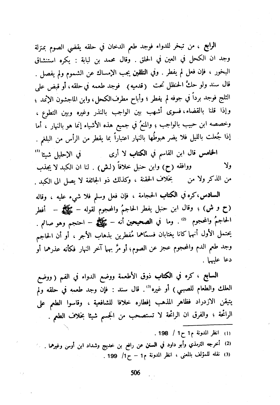 الرَّابِعُ مَنْ تَبَخَّرَ لِلدَّوَاءِ فَوَجَدَ طَعْمَ الدُّخَانِ فِي حلقه يقْضِي الصَّوْم بِمَنْزِلَة وجد ان الْكُحْلِ فِي الْعَيْنِ فِي الْحَلْقِ وَقَالَ مُحَمَّدُ بْنُ لُبَابَةَ يُكْرَهُ اسْتِنْشَاقُ الْبَخُورِ فَإِنْ فَعَلَ لَمْ يُفْطِرْ وَفِي التَّلْقِينِ يَجِبُ الْإِمْسَاكُ عَنِ الشُّمُومِ وَلَمْ يُفَصِّلْ قَالَ سَنَدٌ وَلَوْ حَكَّ الْحَنْظَلَ تَحْتَ قَدَمَيْهِ فَوَجَدَ طَعْمَهُ فِي حَلْقِهِ أَوْ قَبَضَ عَلَى الثَّلْجِ فَوَجَدَ بَرَدًا فِي جَوْفِهِ لَمْ يُفْطِرْ وَأَبَاحَ مُطَرِّفٌ الْكُحْلَ وَابْنُ الْمَاجِشُونِ الْإِثْمِدَ وَإِذَا قُلْنَا بِالْقَضَاءِ فَسَوَّى أَشْهَبُ بَيْنَ الْوَاجِبِ بِالنَّذْرِ وَغَيْرِهِ وَبَيْنَ التَّطَوُّعِ وَخَصَّصَهُ ابْنُ حَبِيبٍ بِالْوَاجِبِ وَالْمَنْعُ فِي جَمِيعِ هَذِهِ الْأَشْيَاءِ إِنَّمَا هُوَ بِالنَّهَارِ أَمَّا إِذَا جُعِلَتْ بِاللَّيْلِ فَلَا يَضُرُّ هُبُوطُهَا بِالنَّهَارِ اعْتِبَارًا بِمَا يُقْطَرُ مِنَ الرَّأْسِ مِنَ الْبَلْغَمِ الْخَامِسُ قَالَ ابْنُ الْقَاسِمِ فِي الْكِتَابِ لَا أَرَى فِي الإحليل شَيْئا وَلَا وَوَافَقَهُ (ح) وَابْنُ حَنْبَلٍ خِلَافًا لِ (ش) لَنَا أَنَّ الْكَبِدَ لَا يَجْذِبُ مِنَ الذَّكَرِ وَلَا مِنْ بِخِلَافِ الْحُقْنَةِ وَكَذَلِكَ ذُو الْجَائِفَةِ لَا يَصِلُ إِلَى الْكَبِدِ السَّادِسُ كَرِهَ فِي الْكِتَابِ الْحِجَامَةَ فَإِنْ فَعَلَ وَسَلِمَ فَلَا شَيْءَ عَلَيْهِ وَقَالَهُ (ح وش) وَقَالَ ابْنُ حَنْبَلٍ يُفْطِرُ الْحَاجِمُ وَالْمَحْجُومُ لِقَوْلِهِ - صَلَّى اللَّهُ عَلَيْهِ وَسَلَّم َ - أفطر الحاجم والمحجوم وَمَا فِي الصَّحِيحَيْنِ أَنَّهُ - صَلَّى اللَّهُ عَلَيْهِ وَسَلَّم َ - احْتَجَمَ وَهُوَ صَائِمٌ يَحْتَمِلُ الْأَوَّلُ أَنَّهُمَا كَانَا يَغْتَابَانِ فَسَمَّاهُمَا مُفْطِرَيْنِ بِذَهَابِ الْأَجْرِ أَوْ أَنَّ الْحَاجِمَ وَجَدَ طَعْمَ الدَّمِ وَالْمَحْجُومَ عَجَزَ عَنِ الصَّوْمِ أَوْ مَرَّ بِهِمَا آخِرَ النَّهَارِ فَكَأَنَّهُ عَذَرَهُمَا أَوْ دَعَا عَلَيْهِمَا السَّابِعُ كَرِهَ فِي الْكِتَابِ ذَوْقَ الْأَطْعِمَةِ وَوَضْعَ الدَّوَاءِ فِي الْفَمِ وَوَضْعَ الْعِلْكَ وَالطَّعَامِ لِلصَّبِيِّ أَوْ غَيْرِهِ قَالَ سَنَدٌ فَإِنْ وَجَدَ طَعْمَهُ فِي حَلْقِهِ وَلَمْ يَتَيَقَّنِ الِازْدِرَادَ فَظَاهِرُ الْمَذْهَبِ إِفْطَارُهُ خِلَافًا لِلشَّافِعِيَّةِ وَقَاسُوا الطَّعْمَ عَلَى الرَّائِحَةِ وَالْفَرْقُ أَنَّ الرَّائِحَةَ لَا تَسْتَصْحِبُ مِنَ الْجِسْمِ شَيْئًا بِخِلَافِ الطَّعْمِ