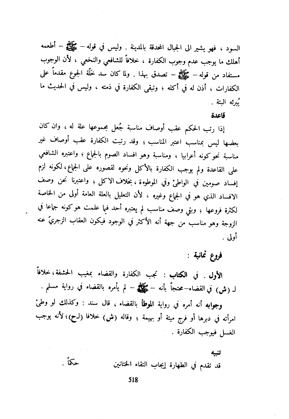 قَاعِدَةٌ إِذَا رُتِّبَ الْحُكْمُ عَقِبَ أَوْصَافٍ مُنَاسِبَةٍ جُعِلَ مَجْمُوعُهَا عِلَّةً لَهُ وَإِنْ كَانَ بَعْضُهَا لَيْسَ بِمُنَاسِبٍ اعْتُبِرَ الْمُنَاسِبُ وَقَدْ رُتِّبَتِ الْكَفَّارَةُ عَقِبَ أَوْصَافٍ غَيْرِ مُنَاسِبَةٍ نَحْو كَونه أَعْرَابِيًا ومناسبة وَهُوَ افساد الصَّوْم بِالْجِمَاعِ واعتبره الشَّافِعِي عَلَى الْقَاعِدَةِ وَلَمْ يُوجِبِ الْكَفَّارَةَ بِالْأَكْلِ وَنَحْوِهِ لِقُصُورِهِ عَلَى الْجِمَاعِ لِكَوْنِهِ لَزِمَ إِفْسَادُ صَوْمَيْنِ فِي الْوَاطِئِ وَفِي الْمَوْطُوءَةِ بِخِلَافِ الْأَكِلِ وَاعْتَبَرْنَا نَحْنُ وَصْفَ الْإِفْسَادِ الَّذِي هُوَ فِي الْجِمَاعِ وَغَيْرِهِ لِأَنَّ التَّعْلِيلَ بِالْعِلَّةِ الْعَامَّةِ أَوْلَى مِنَ الْخَاصَّةِ لِكَثْرَةِ فُرُوعِهَا وَبَقِيَ وَصْفٌ مُنَاسِبٌ لَمْ يَعْتَبِرْهُ أَحَدٌ فِيمَا عَلِمْتُ هُوَ كَوْنُهُ جِمَاعًا فِي الزَّوْجَةِ وَهُوَ مُنَاسِبٌ مِنْ جِهَةِ أَنَّهُ الْأَكْثَرُ فِي الْوُجُودِ فَيَكُونُ الْعِقَابُ الزَّجْرِيُّ عَنْهُ أَوْلَى فُرُوعٌ ثَمَانِيَةٌ الْأَوَّلُ فِي الْكِتَابِ تَجِبُ الْكَفَّارَةُ وَالْقَضَاءُ بِمَغِيبِ الْحَشَفَةِ خِلَافًا لِ ش فِي الْقَضَاءِ مُحْتَجًّا بِأَنَّهُ - صَلَّى اللَّهُ عَلَيْهِ وَسَلَّم َ - لَمْ يَأْمُرْهُ بِالْقَضَاءِ فِي رِوَايَةِ مُسْلِمٍ وَجَوَابُهُ أَنَّهُ أَمَرَهُ فِي رِوَايَةِ الْمُوَطَّأِ بِالْقَضَاءِ قَالَ سَنَدٌ وَكَذَلِكَ لَوْ وَطِئَ امْرَأَتَهُ فِي دُبُرِهَا أَوْ فَرْجِ مَيِّتَةٍ أَوْ بَهِيمَةٍ وَقَالَهُ (ش) خِلَافًا لِ ح لِأَنَّهُ يُوجِبُ الْغُسْلَ فَيُوجِبُ الْكَفَّارَةَ