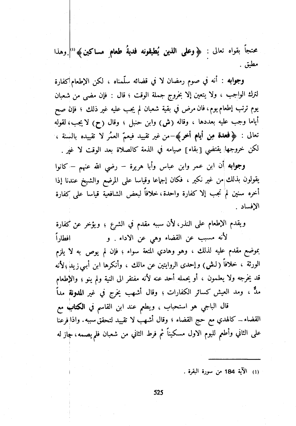 مُحْتَجًّا بِقَوْلِهِ تَعَالَى {وَعَلَى الَّذِينَ يُطِيقُونَهُ فِدْيَةٌ طَعَام مَسَاكِين} وَهَذَا مُطِيقٌ وَجَوَابُهُ أَنَّهُ فِي صَوْمِ رَمَضَانَ لَا فِي قَضَائِهِ سَلَّمْنَاهُ لَكِنَّ الْإِطْعَامَ كَفَّارَةٌ لِتَرْكِ الْوَاجِبِ وَلَا يَتَعَيَّنُ إِلَّا بِخُرُوجِ جُمْلَةِ الْوَقْتِ قَالَ فَإِنْ مَضَى مِنْ شَعْبَانَ يَوْمٌ تَرَتَّبَ إِطْعَامُ يَوْمٍ فَإِنْ مَرِضَ فِي بَقِيَّةِ شَعْبَانَ لَمْ يَجِبْ عَلَيْهِ غَيْرُ ذَلِكَ فَإِنْ صَحَّ أَيَّامًا وَجَبَ عَلَيْهِ بِعَدَدِهَا وَقَالَهُ (ش) وَابْنُ حَنْبَلٍ وَقَالَ (ح) لَا يَجِبُ لِقَوْلِهِ تَعَالَى {فَعدَّة من أَيَّام أخر} مِنْ غَيْرِ تَقْيِيدٍ فَيَعُمُّ الْعُمُرَ لَا تَقْيِيدُهُ بِالسَّنَةِ لَكِنَّ خُرُوجَهَا يَقْتَضِي بَقَاءَ صِيَامِهِ فِي الذِّمَّةِ كَالصَّلَاةِ بَعْدَ الْوَقْتِ لَا غَيْرُ وَجَوَابُهُ أَنَّ ابْنَ عُمَرَ وَابْنَ عَبَّاسٍ وَأَبَا هُرَيْرَةَ رَضِيَ اللَّهُ عَنْهُمْ كَانُوا يَقُولُونَ بِذَلِكَ مِنْ غَيْرِ نَكِيرٍ فَكَانَ إِجْمَاعًا وَقِيَاسًا عَلَى الْمُرْضِعِ وَالشَّيْخِ عِنْدَنَا إِذَا أَخَّرَهُ سِنِينَ لَمْ تَجِبْ إِلَّا كَفَّارَةٌ وَاحِدَةٌ خِلَافًا لِبَعْضِ الشَّافِعِيَّةِ قِيَاسًا عَلَى كَفَّارَةِ الْإِفْسَادِ وَيُقَدَّمُ الْإِطْعَامُ عَلَى النَّذْرِ لِأَنَّ سَبَبَهُ مُقَدَّمٌ فِي الشَّرْعِ وَيُؤَخَّرُ عَنْ كَفَّارَةٍ لِأَنَّهُ مُسَبَّبٌ عَنِ الْقَضَاءِ وَهِيَ عَنِ الْأَدَاء وافطارا بِمَوْضِعٍ مُقَدَّمٍ عَلَيْهِ لِذَلِكَ وَهُوَ وَهَادِي الْمُتْعَةِ سَوَاءٌ فَإِنْ لَمْ يُوصِ بِهِ لَا يَلْزَمُ الْوَرَثَةَ خِلَافًا (لِ ش) وَإِحْدَى الرِّوَايَتَيْنِ عَنْ مَالِكٍ وَأَنْكَرَهَا ابْنُ أَبِي زَيْدٍ لِأَنَّهُ قَدْ يُخْرِجُهُ وَلَا يَعْلَمُونَ أَوْ يَحْمِلُهُ أَحَدٌ عَنْهُ لِأَنَّهُ مُفْتَقِرٌ إِلَى النِّيَّةِ وَلَمْ يَنْوِ وَالْإِطْعَامُ مُدٌّ وَمُدُّ الْعَيْشِ كَسَائِرِ الْكَفَّارَاتِ وَقَالَ أَشْهَبُ يُخْرِجُ فِي غَيْرِ الْمُدَوَّنَةِ مُدًّا قَالَ الْبَاجِيُّ هُوَ اسْتِحْبَابٌ وَيُطْعِمُ عِنْدَ ابْنِ الْقَاسِمِ فِي الْكِتَابِ مَعَ الْقَضَاءِ كَالْهَدْيِ مَعَ حَجِّ الْقَضَاءِ وَقَالَ أَشْهَبُ لَا تَقْيِيدَ لِتَحَقُّقِ سَبَبِهِ وَإِذَا فَرَّعْنَا عَلَى الثَّانِي وَأَطْعَمَ لِلْيَوْمِ الْأَوَّلِ مِسْكِينًا ثُمَّ فَرَطَ الثَّانِي مِنْ شَعْبَانَ فَلَمْ يَصُمْهُ جَازَ لَهُ