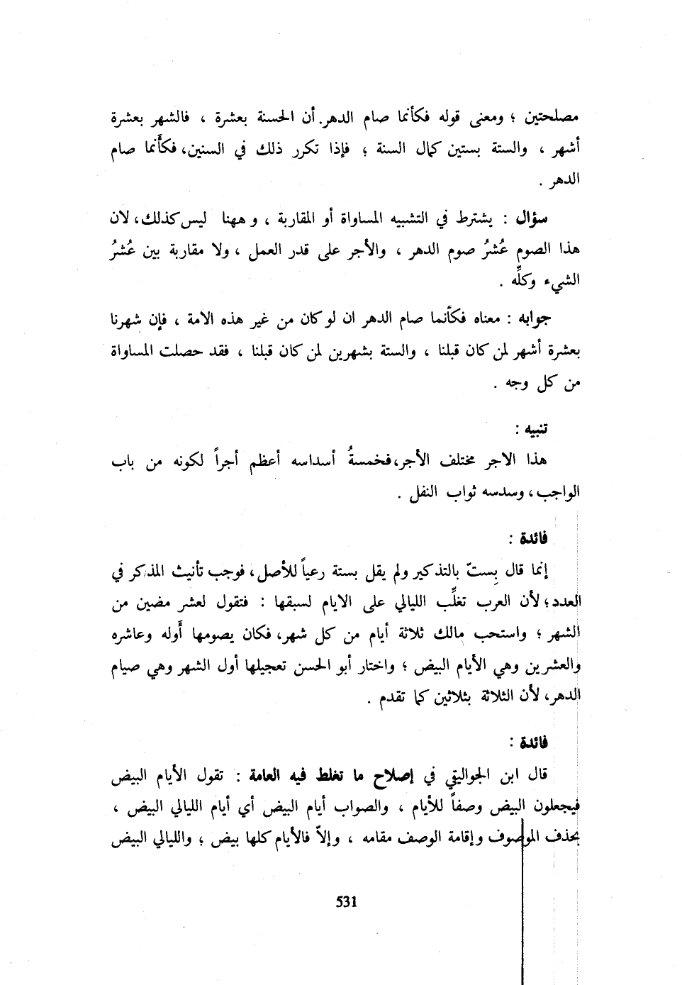 فَائِدَةٌ إِنَّمَا قَالَ بِسِتٍّ بِالتَّذْكِيرِ وَلَمْ يَقُلْ بِسِتَّةٍ رَعْيًا لِلْأَصْلِ فَوَجَبَ تَأْنِيثُ الْمُذَكَّرِ فِي الْعَدَدِ لِأَنَّ الْعَرَبَ تُغَلِّبُ اللَّيَالِيَ عَلَى الْأَيَّامِ لِسَبْقِهَا فَتَقُولُ لِعَشْرٍ مَضَيْنَ مِنَ الشَّهْرِ وَاسْتَحَبَّ مَالِكٌ ثَلَاثَةَ أَيَّامٍ مِنْ كُلِّ شَهْرٍ فَكَانَ يَصُومُهَا أَوَّلَهُ وَعَاشِرَهُ وَالْعِشْرِينَ وَهِيَ الْأَيَّامُ الْبِيضُ وَاخْتَارَ أَبُو الْحَسَنِ تَعْجِيلَهَا أَوَّلَ الشَّهْرِ وَهِيَ صِيَامُ الدَّهْرِ لِأَنَّ الثَّلَاثَةَ بِثَلَاثِينَ كَمَا تَقَدَّمَ